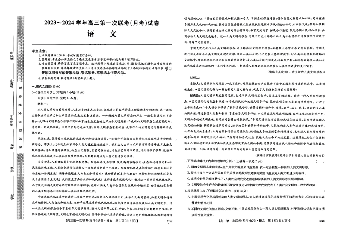 2024全国名校大联考高三上学期第一联考(月考)语文试题及答案试卷满分150分,考试时间150分钟一、现代文阅读(35分)(一)现代文阅读Ⅰ(本题共5小题,19分)阅读下面的文字,完成1-5题。材料一:从人类文明形态的角度看,人类历史的发展与变迁,表现为不同文明形态不断演进更替的过程,这一过程主要取决于生产力和生产关系的发展及其相互作用。一种新的人类文明形态的产生,一般需要满足以下条件:一是旧的文明形态已经难以驾驭并容纳愈益发展的生产力和文明成果;二是新的文明形态已经发育起来,并达到一定成熟程度。旧的文明