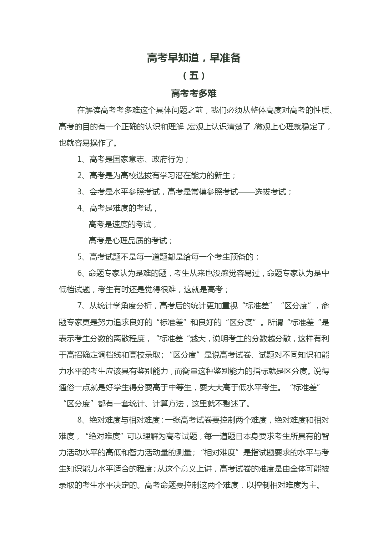 高考早知道,早准备(五)高考考多难在解读高考考多难这个具体问题之前,我们必须从整体高度对高考的性质、高考的目的有一个正确的认识和理解,宏观上认识清楚了,微观上心理就稳定了,也就容易操作了。1、高考是国家意志、政府行为;2、高考是为高校选拔有学习潜在能力的新生;3、会考是水平参照考试,高考是常模参照考试——选拔考试;4、高考是难度的考试,高考是速度的考试,高考是心理品质的考试;5、高考试题不是每一道题都是给每一个考生预备的;6、命题专家认为是难的题,考生从来也没感觉容易过,命题专家认为是中低档试题,考生有时
