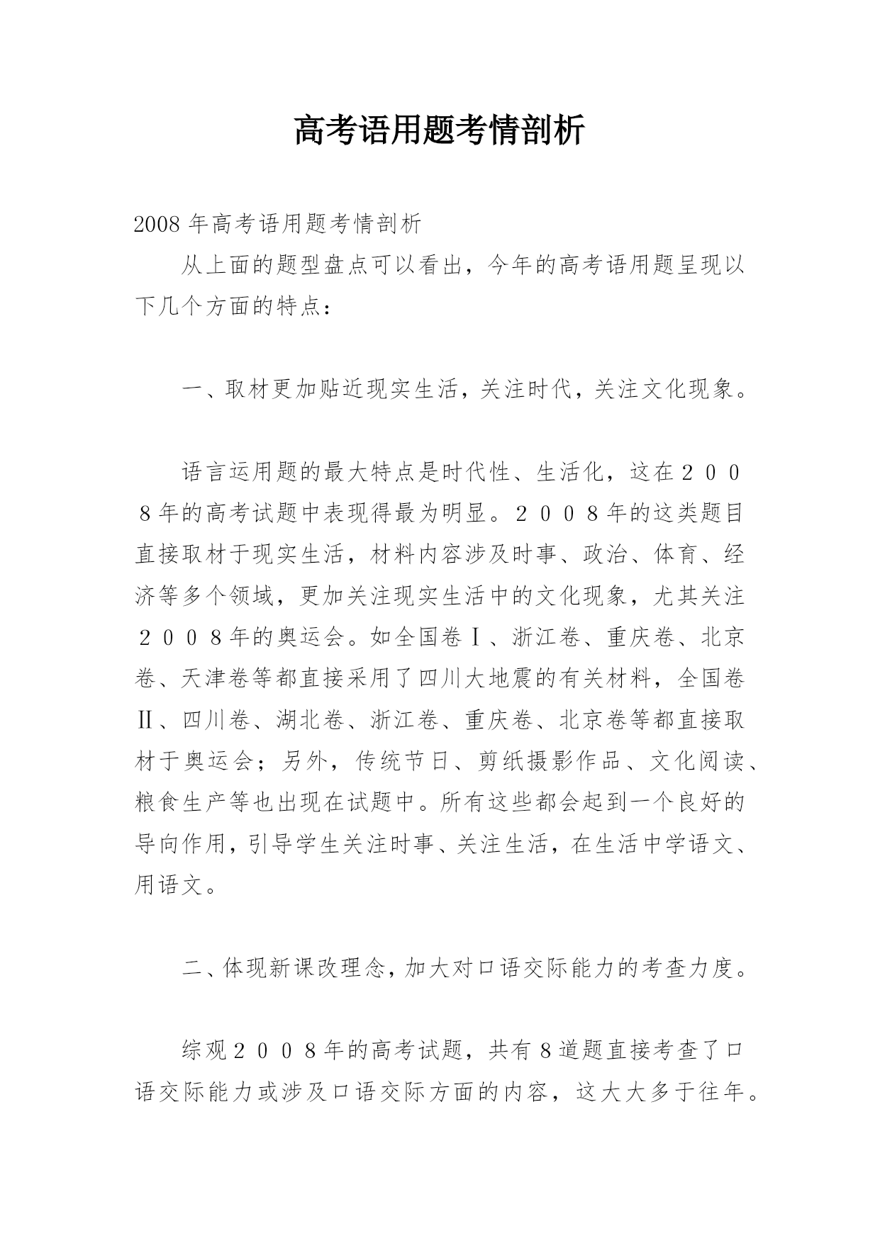 高考语用题考情剖析2008年高考语用题考情剖析从上面的题型盘点可以看出,今年的高考语用题呈现以下几个方面的特点:一、取材更加贴近现实生活,关注时代,关注文化现象。语言运用题的最大特点是时代性、生活化,这在2008年的高考试题中表现得最为明显。2008年的这类题目直接取材于现实生活,材料内容涉及时事、政治、体育、经济等多个领域,更加关注现实生活中的文化现象,尤其关注2008年的奥运会。如全国卷Ⅰ、浙江卷、重庆卷、北京卷、天津卷等都直接采用了四川大地震的有关材料,全国卷Ⅱ、四川卷、湖北卷、浙江卷、重庆卷、北京