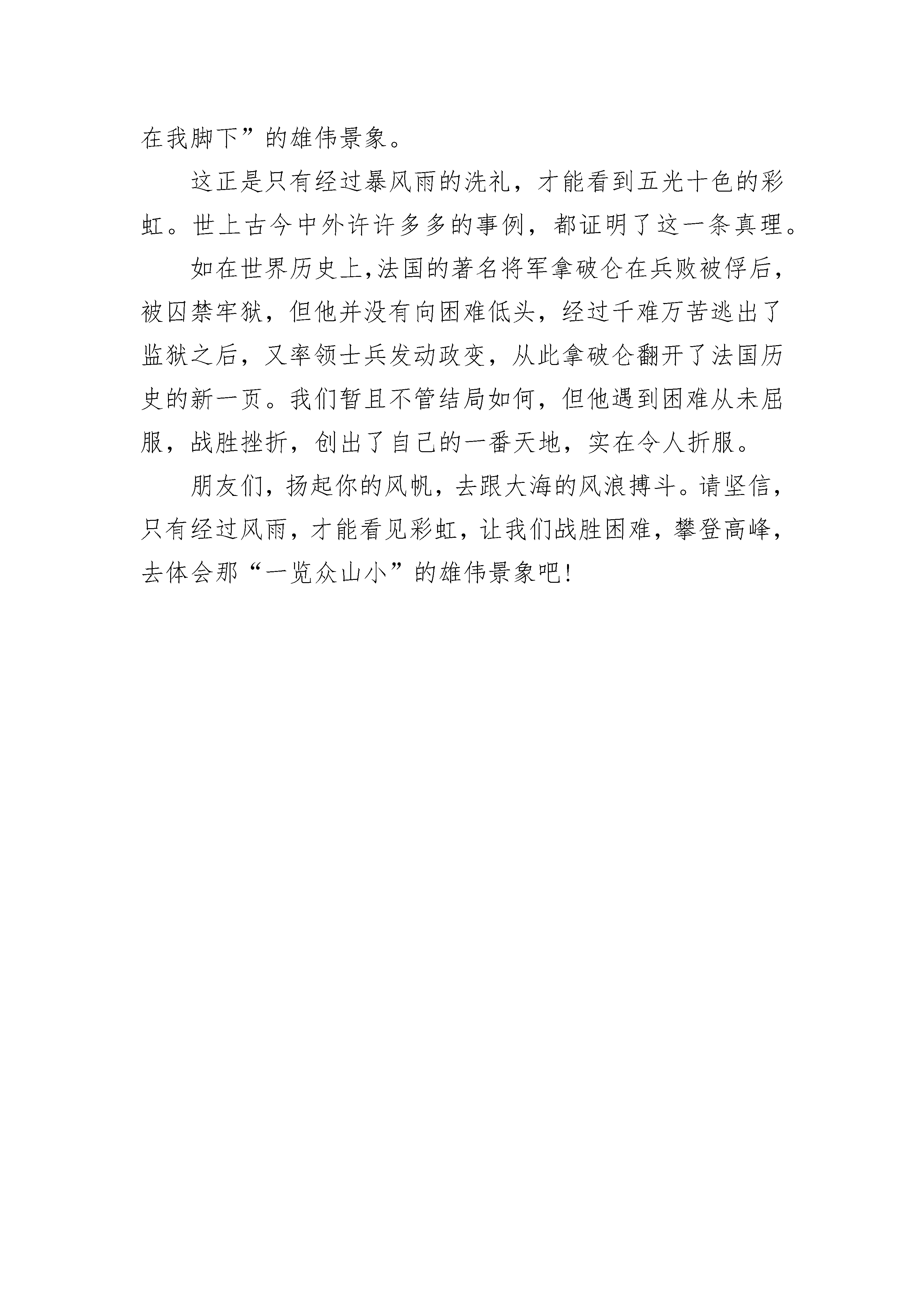 挫折伴我成长初三记叙文(精选5篇)挫折伴我成长初三记叙文(精选篇1)大海因为有了暴风的袭击,才显示出它的顽强。海燕,在暴风中克服挫折,在挫折面前不低头,才迎来了光明。我,面对挫折,也不放弃,勇于拼搏。晚上,面对窗户,我的眼前仿佛又出现了75分的试卷。看,小鸟在窗前“叽叽喳喳”是在为我的遭遇鸣不平吗?听,雨“哗哗啦啦”地下着,是在用你独特的歌声安慰我吗?闻,花丛里的花正在散发着迷人的香味,是邀我从挫折中走出,和你一起跳舞吗?大自然啊!我的命运是多么悲惨,你是在可怜我吗?面对试卷上的75分,我是不是被吓到