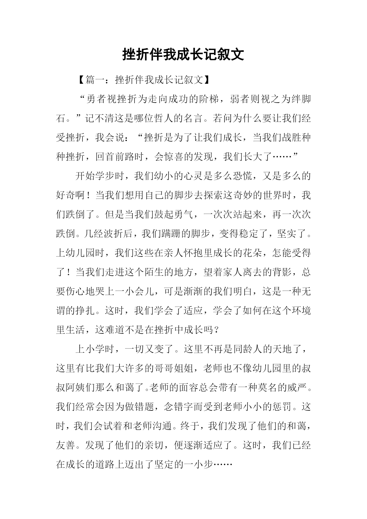 挫折伴我成长记叙文相信大家总免不了要接触或使用作文吧,尤其是写作中最基本、最常见的记叙文,记叙文是一种以记叙为主要表达方法的写人、记事、绘景、状物的文体。怎么样才能写出优秀的记叙文呢?下面是小编为大家整理的挫折伴我成长记叙文,希望对大家有所帮助。挫折伴我成长记叙文1挫折---一个可以使你心灰意冷,又可以激人奋进的东西。在挫折面前是妥协还是坚持,是放弃还是继续,决定着你是走向成功或失败。有多少次,面对挫折,我选择勇敢面对,迎难而上,从而也让我品尝到了成功的喜悦。如今,挫折已不是我的绊脚石。而是一条引领我成长