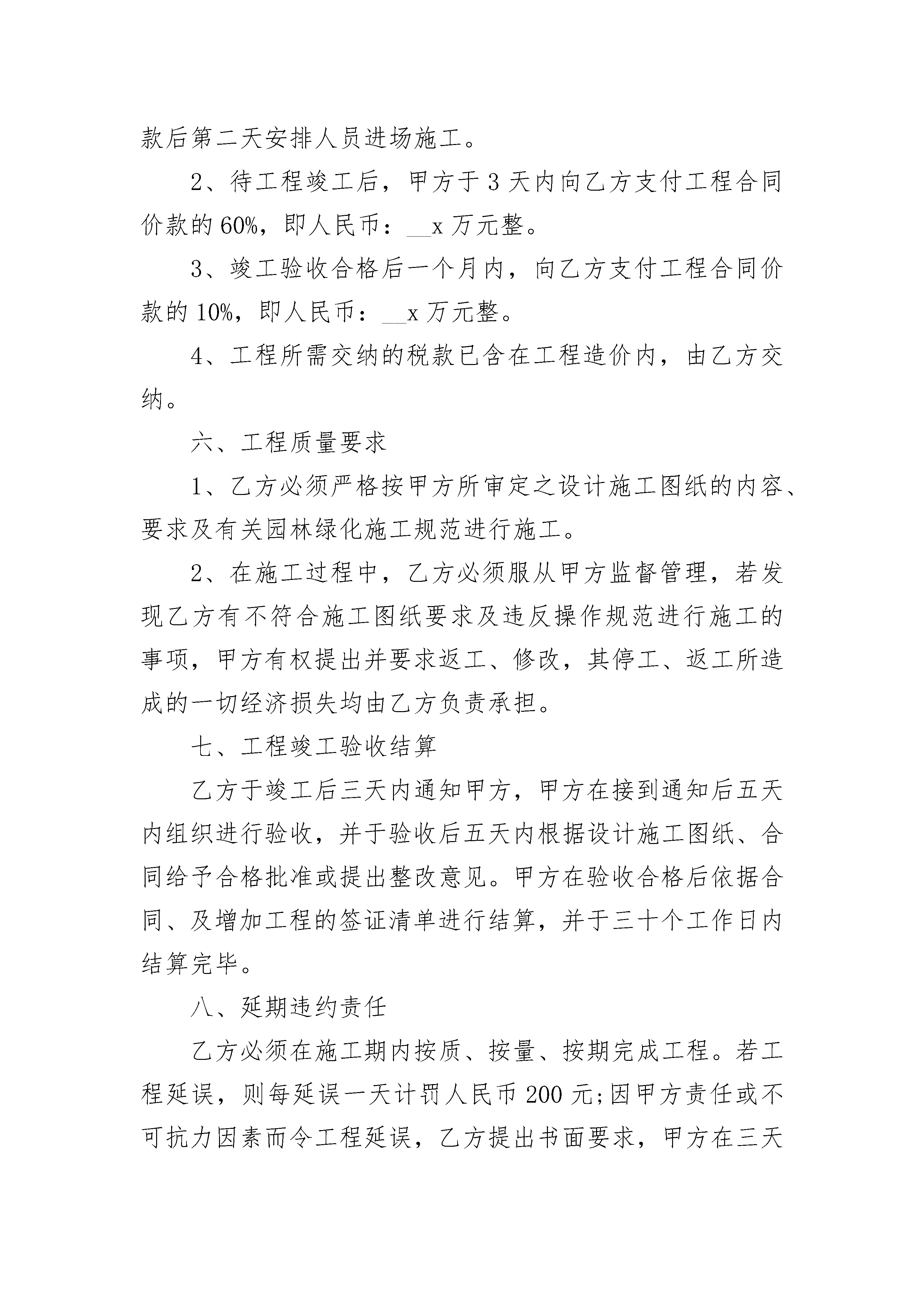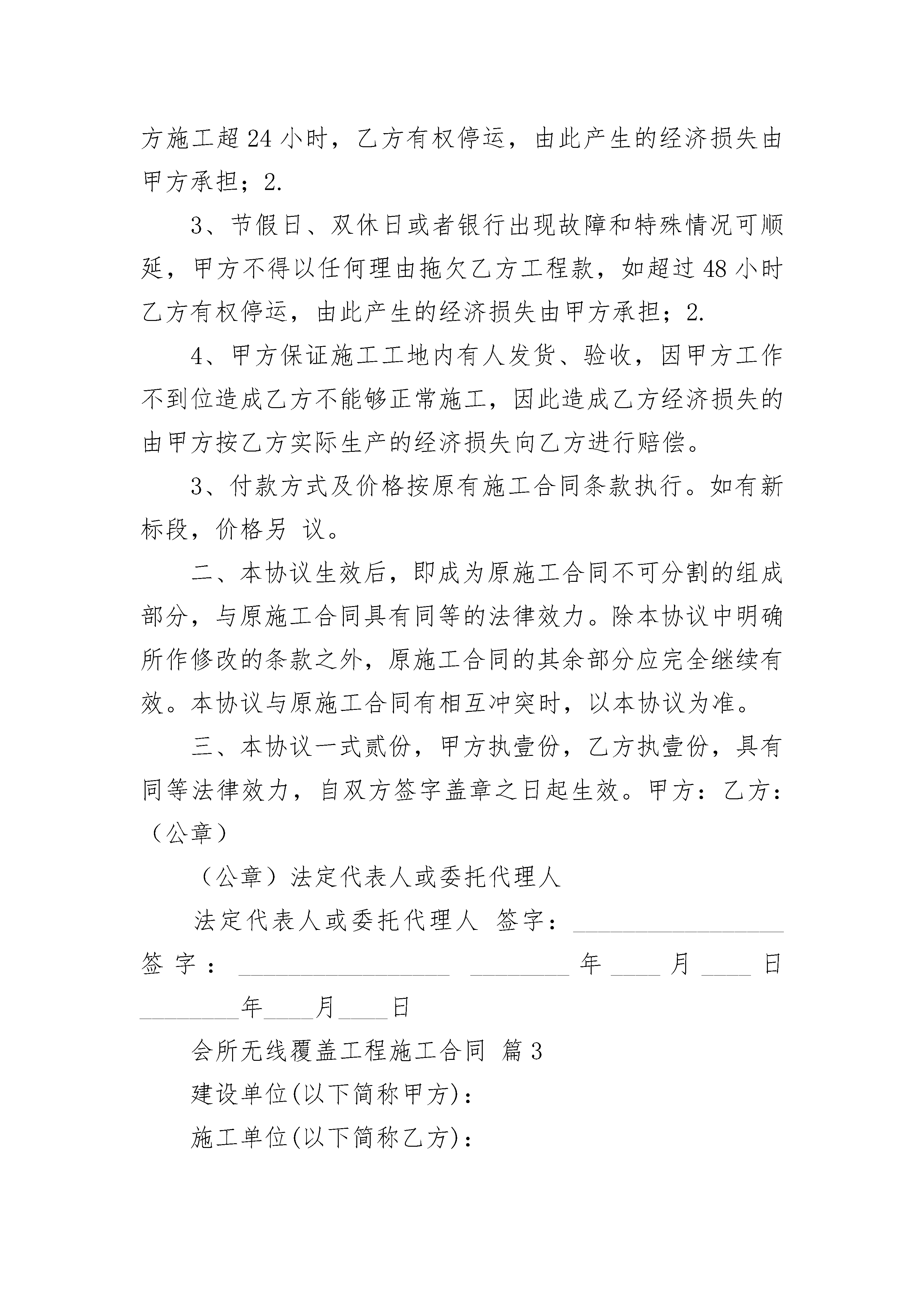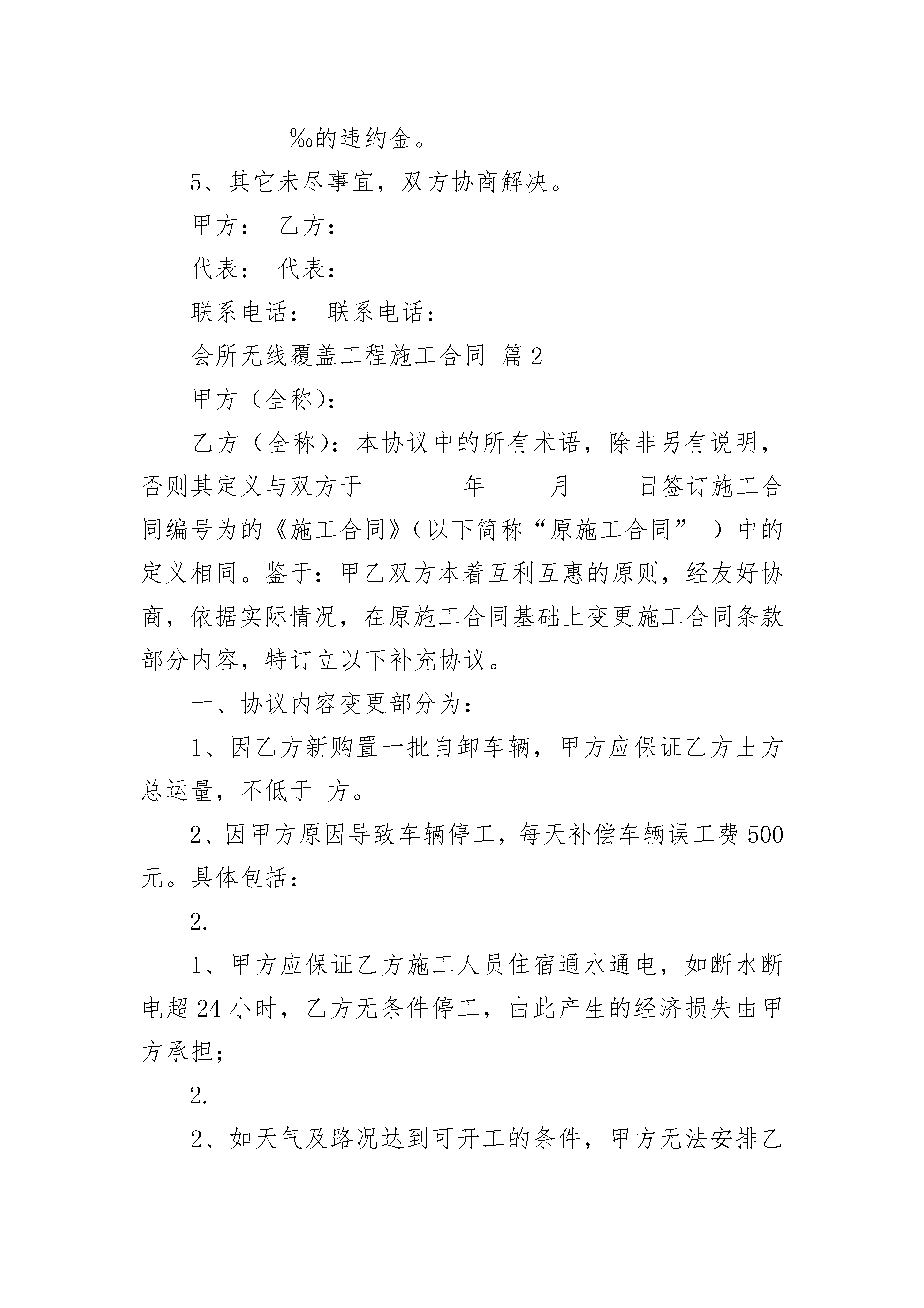 会所无线覆盖工程施工合同会所无线覆盖工程施工合同(精选3篇)会所无线覆盖工程施工合同篇1甲方:乙方:依照《中华人民共和国民法典》以及其他有关法律、行政法规,遵循平等、自愿、公平和诚实信用原则,甲乙双方经友好协商就会所无线覆盖工程施工签定本合同,以便共同遵守,内容如下:一、工程名称:二、工程地点:三、工程范围:四、工程金额:工程合同总价为人民币:如工程量发生增减,则增减部分按实际发生计取费用,计算标准按本合同单价执行。五、付款方式1、合同签订,乙方进场施工前甲方向乙方支付工程合同总价__________