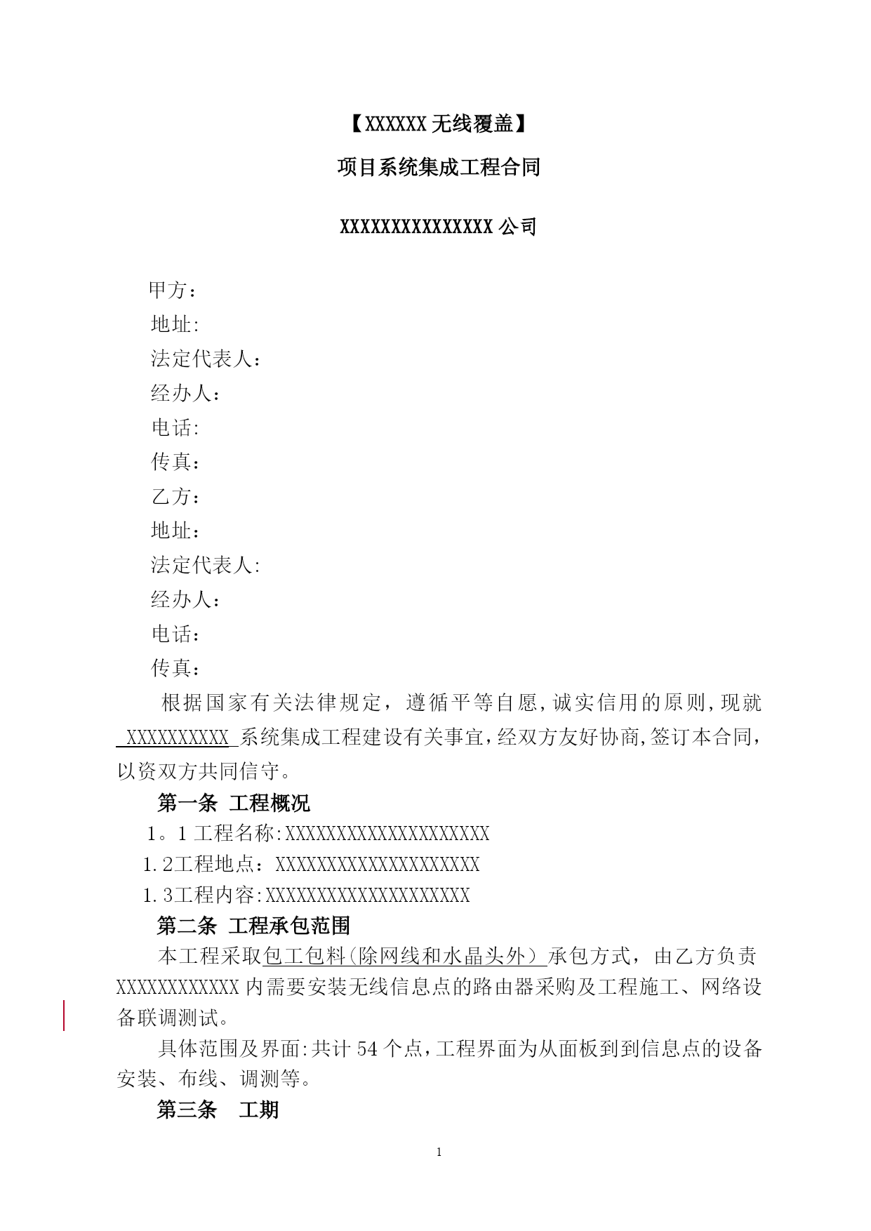 【XXXXXX无线覆盖】项目系统集成工程合同XXXXXXXXXXXXXXX公司甲方:地址:法定代表人:经办人:电话:传真:乙方:地址:法定代表人:经办人:电话:传真:根据国家有关法律规定,遵循平等自愿,诚实信用的原则,现就_XXXXXXXXXX_系统集成工程建设有关事宜,经双方友好协商,签订本合同,以资双方共同信守。第一条工程概况1。1工程名称:XXXXXXXXXXXXXXXXXXXX1.2工程地点:XXXXXXXXXXXXXXXXXXXX1.3工程内容:XXXXXXXXXX