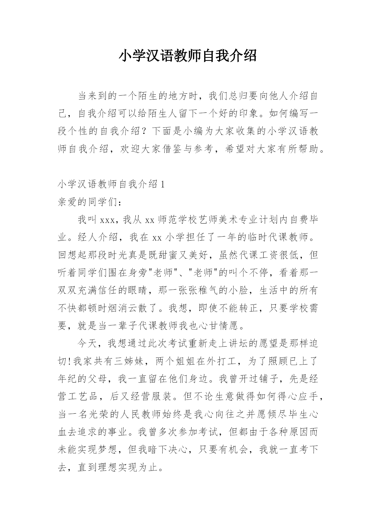 此资料由网络收集而来,如有侵权请告知上传者立即删除。资料共分享,我们负责传递知识。小学汉语教师自我介绍相信大家在开学第一节课的时候都有做过自我介绍,自我介绍是让别人直接了解你的最佳方式。好的自我介绍能给别人留下一个很好的印象。下面小编为大家带来小学汉语教师自我介绍,供大家参考!小学汉语教师自我介绍1亲爱的同学们:我叫xxx,我从**师范学校艺师美术专业计划内自费毕业。经人介绍,我在xx小学担任了一年的临时代课教师。回想起那段时光真是既甜蜜又美好,虽然代课工资很低,但听着同学们围在身旁"老师&qu