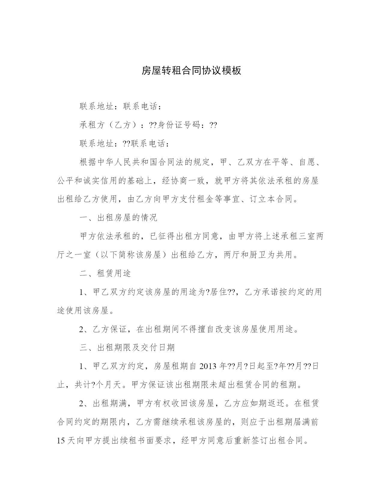 房屋转租合同协议模板联系地址:联系电话:承租方(乙方):??身份证号码:??联系地址:??联系电话:根据中华人民共和国合同法的规定,甲、乙双方在平等、自愿、公平和诚实信用的基础上,经协商一致,就甲方将其依法承租的房屋出租给乙方使用,由乙方向甲方支付租金等事宜、订立本合同。一、出租房屋的情况甲方依法承租的,已征得出租方同意,由甲方将上述承租三室两厅之一室(以下简称该房屋)出租给乙方,两厅和厨卫为共用。二、租赁用途1、甲乙双方约定该房屋的用途为?居住??,乙方承诺按约定的用途使用该房屋。2、乙方保证,在出租期