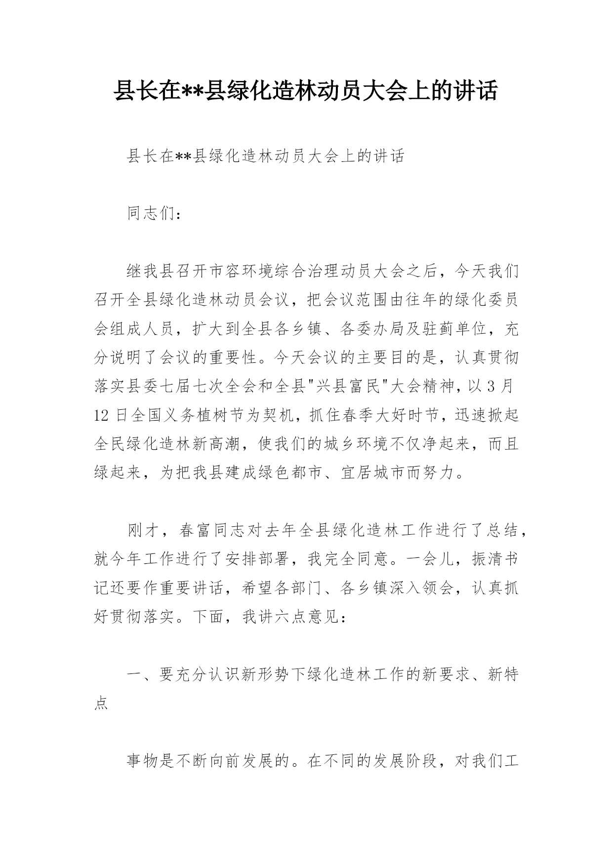 县长在**县绿化造林动员大会上的讲话县长在**县绿化造林动员大会上的讲话同志们:继我县召开市容环境综合治理动员大会之后,今天我们召开全县绿化造林动员会议,把会议范围由往年的绿化委员会组成人员,扩大到全县各乡镇、各委办局及驻蓟单位,充分说明了会议的重要性。今天会议的主要目的是,认真贯彻落实县委七届七次全会和全县"兴县富民"大会精神,以3月12日全国义务植树节为契机,抓住春季大好时节,迅速掀起全民绿化造林新高潮,使我们的城乡环境不仅净起来,而且绿起来,为把我县建成绿色都市、宜居城市而努力。刚才,春富同志对去年
