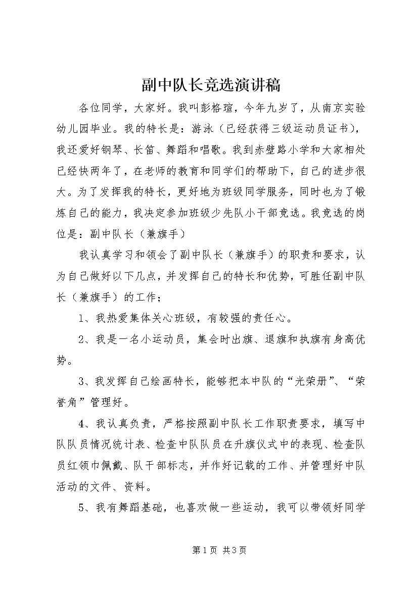 副中队长竞选演讲稿各位同学大家好。我叫彭格瑄今年九岁了从南京实验幼儿园毕业。我的特长是:游泳(已经获得三级运动员证书)我还爱好钢琴、长笛、舞蹈和唱歌。我到赤壁路小学和大家相处已经快两年了在老师的教育和同学们的帮助下自己的进步很大。为了发挥我的特长更好地为班级同学服务同时也为了锻炼自己的能力我决定参加班级少先队小干部竞选。我竞选的岗位是:副中队长(兼旗手)我认真学习和领会了副中队长(兼旗手)的职责和要求认为自己做好以下几点并发挥自己的特长和优势可胜任副中队长(兼旗手)的工作;