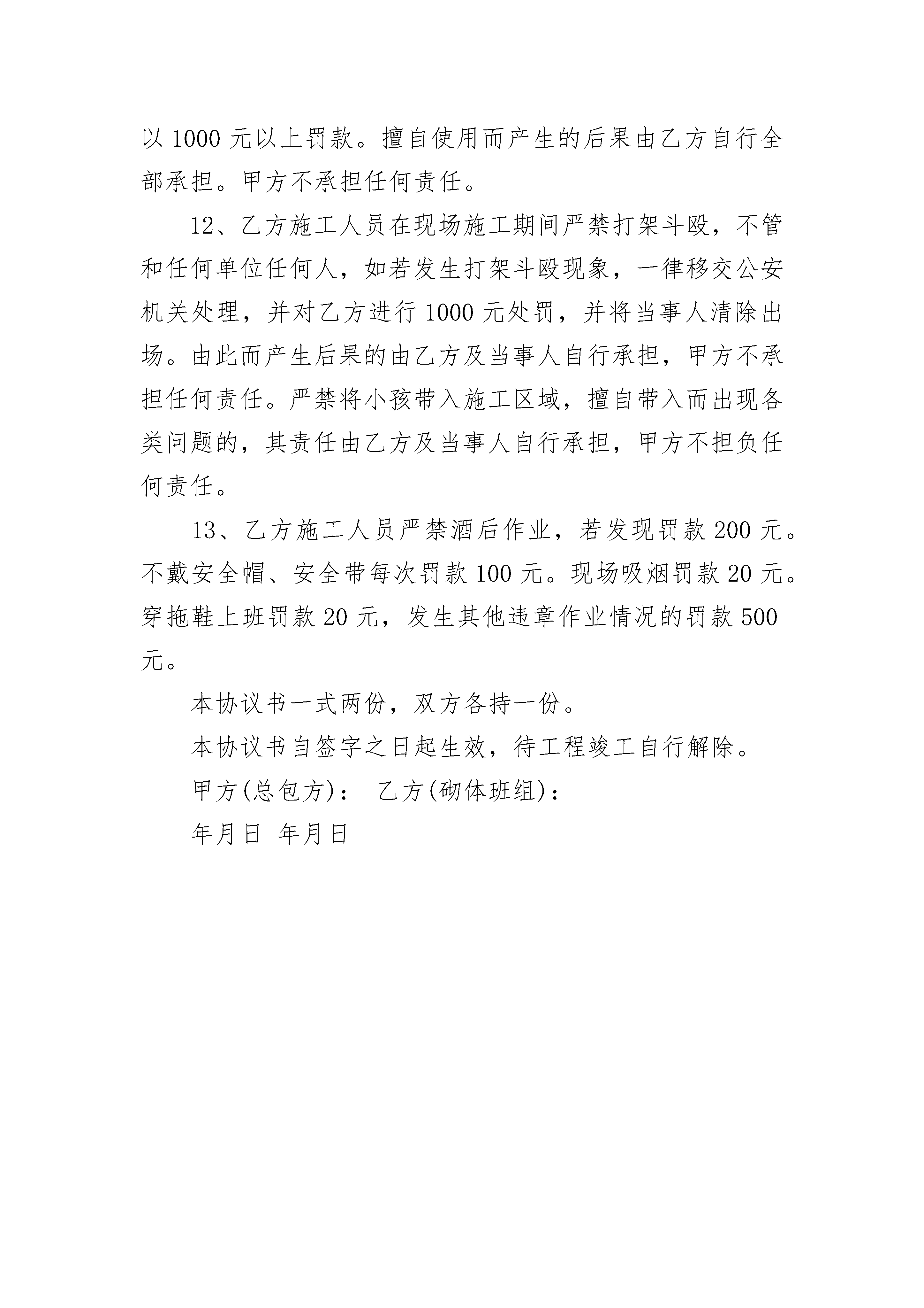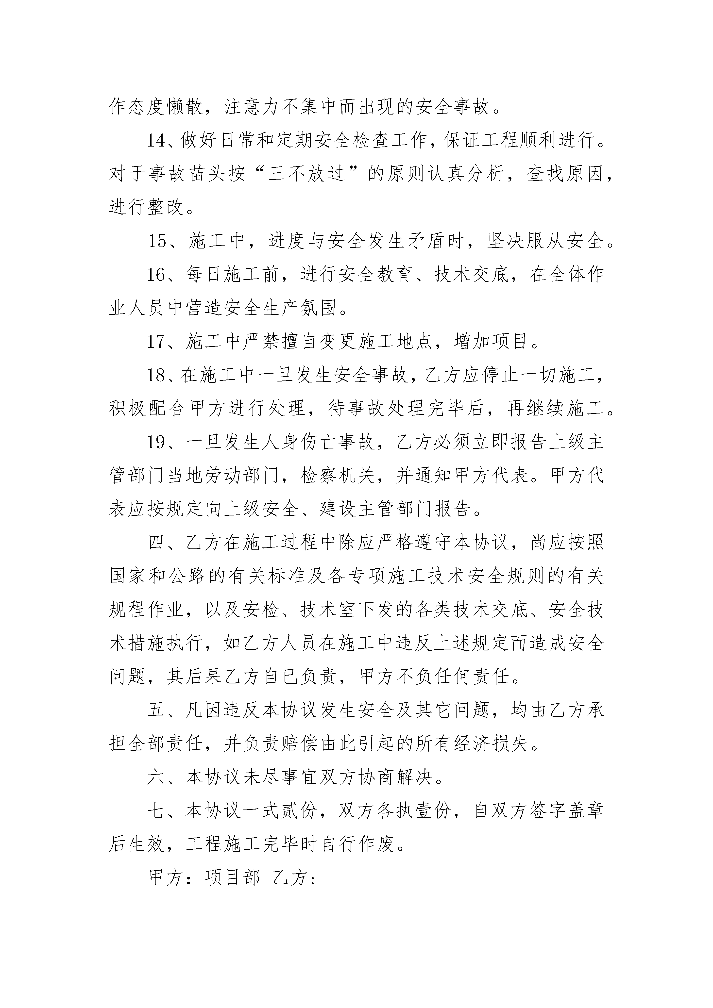 爆破施工安全协议书爆破施工安全协议书在快速变化和不断变革的今天,人们运用到协议的场合不断增多,签订签订协议可以使事务的结果更加完美化。到底应如何拟定协议呢?以下是小编帮大家整理的爆破施工安全协议书,希望对大家有所帮助。爆破施工安全协议书1甲方:乙方:从开工到施工的过程中,为保证生产安全,保障施工人员及财产安全,将紧紧围绕安全为中心,精心组织,精心施工,按期保质保量完成生产任务,特制定以下协议,并双方严格履行:一、乙方进入施工现场,必须和甲方协调好工作做到施爆前、中、后的准备工作,保证工程进度有序进行。二、