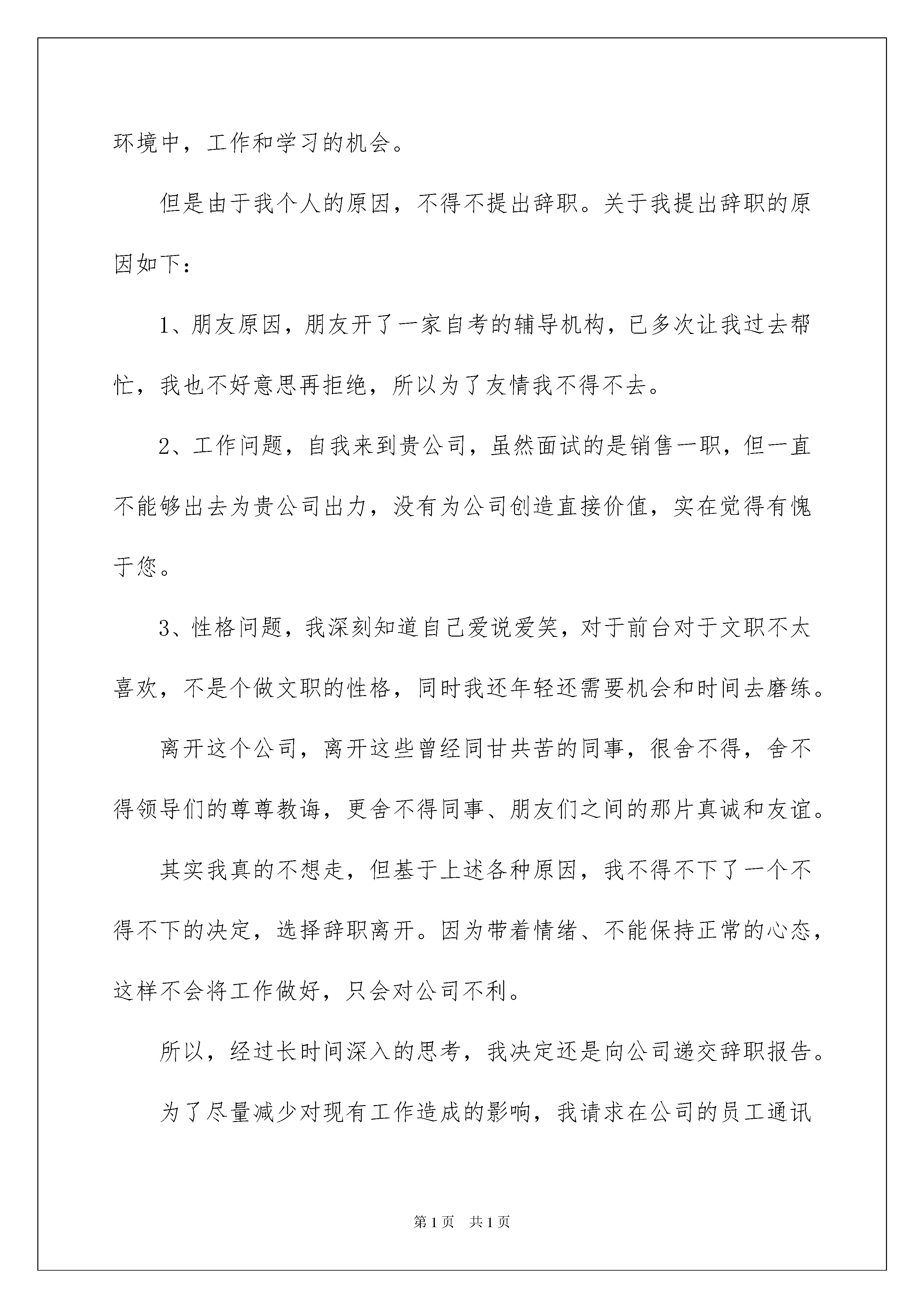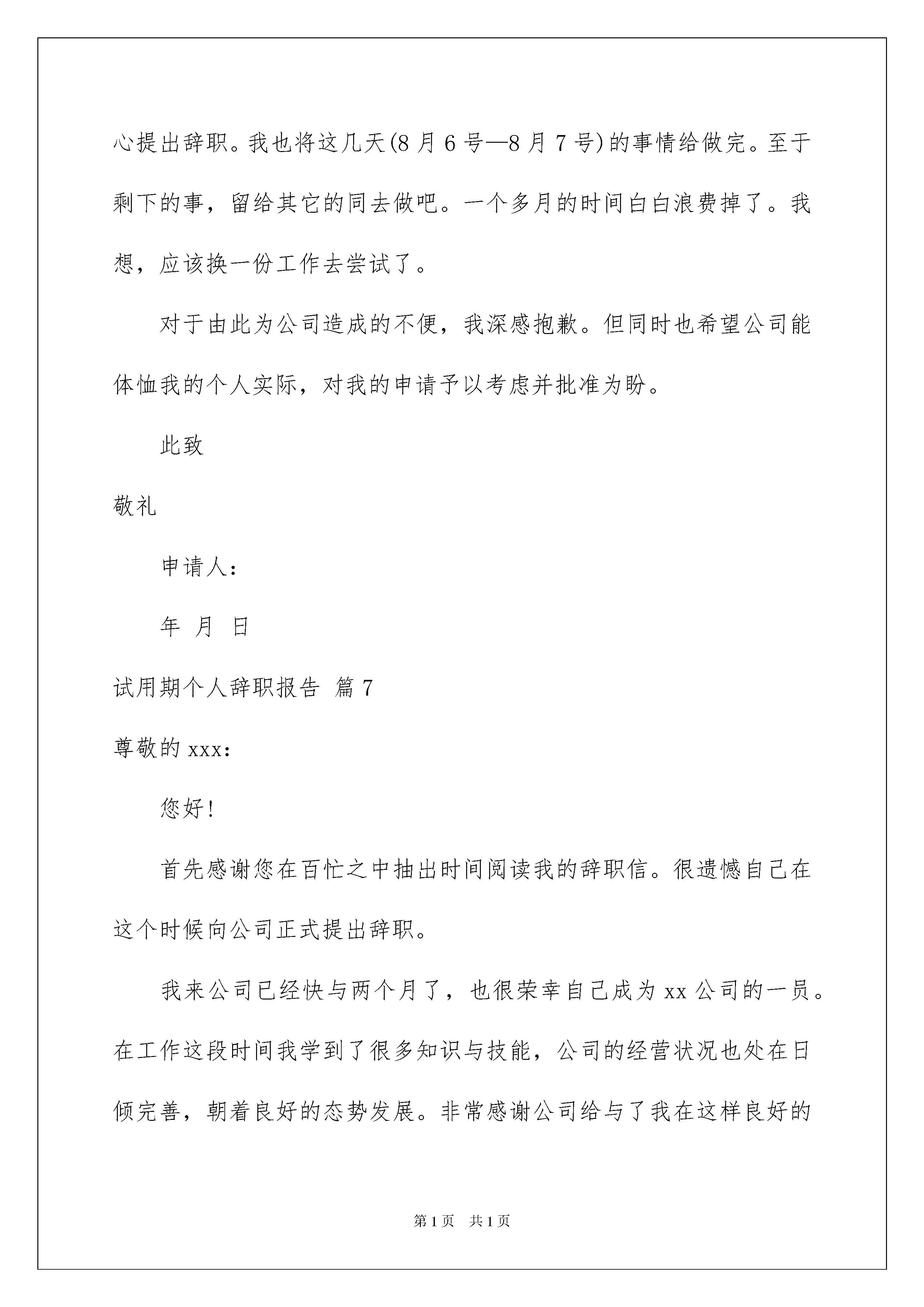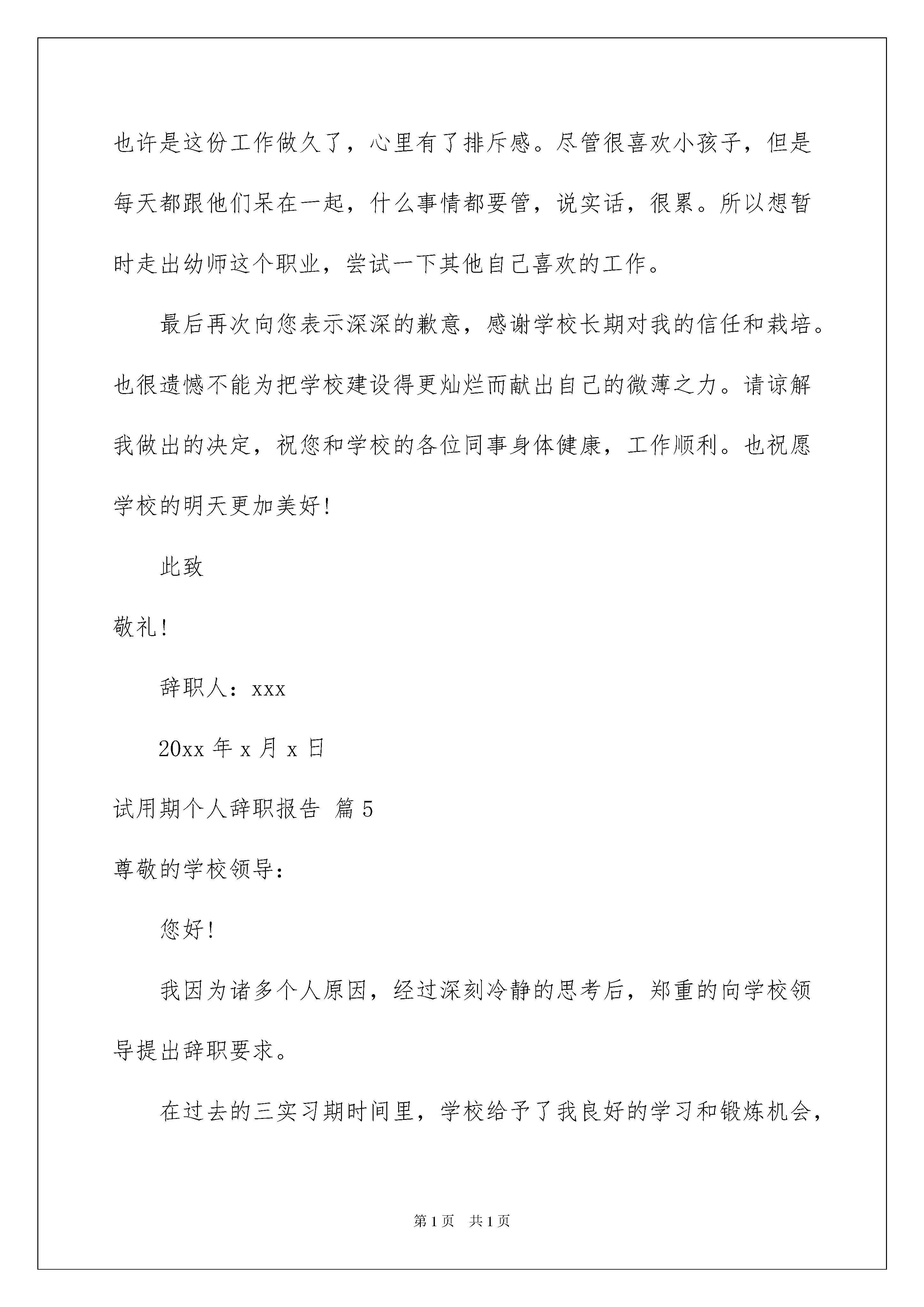 2022试用期个人辞职报告范文合集10篇试用期个人辞职报告范文合集10篇在某个公司做时间长了,我们经过衡量后,会选择与现在的工作告别,这时就要思考一下写辞职报告的事情了。那么你真的会写辞职报告吗?下面是我为大家整理的试用期个人辞职报告10篇,希望对大家有所帮助。试用期个人辞职报告篇1尊敬的领导:您好!首先感谢您对我的信任和支持,让我加入xxx这个团队。进公司工作一个月了,从内心感觉,我完全不适合和胜任现在的工作,我辜负了您的希望,做了逃兵,在此说声:对不起。不管怎样,我还是想早点离开,对您对公司都是最好的选择。我刚上班的第一天晚上,是星期一的周会,从会上我就感觉到我的压力是挺大的。往后的几天,我每天都在仔细考虑问题,说句实在的,晚上睡觉都没有以前那么安稳。最后就是我的家庭方面了,没多少时间照顾家庭,显然以我的工作时间是很不合适的。以上几点是我的个人主观看法,仅供参考,但都是我的内心感受。因为我知道很多漂亮衣服,但并不都适合穿在我身上。适合自己才是最好的,公司用人也是如此。今天我已经在xx上发了我的辞职书,如有不便之处,敬请海涵!最后我真诚的祝愿公司的业绩能够蒸蒸日上,公司越办越红火。辞职信:xxx20xx年x月x日试用期个人辞职报告篇2尊敬的总经理:您好!我怀着复杂的心情写这封辞职信。由于您对我的能力的信任,使我得以加入公司,并且在短短的两个月间获得了许多的机遇和挑战。经过这两年在公司从事的产品开发和人事管理工作,使我在产品开发,人事管理等领域学到了很多知识、积累了一定的经验。对此我深怀感激!由于薪金的原因,我不得不向公司提出申请,并希望能与今年x月xx日正式离职。对于由此为公司造成的不便,我深感抱歉。但同时也希望公司能体恤我的个人实际,对我的申请予以考虑并批准为盼。此致敬礼!辞职人:20xx年6月5日试用期个人辞职报告篇3尊敬的领导:您好!来到广告中心也快两个月了,开始感觉中心的气氛就和一个大家庭一样,大家相处的融洽和睦,在这里有过欢笑,有过收获,当然也有过痛苦。虽然多少有些不快,不过在这里至少还是学了一些东西。很遗憾在这个时候向中心正式提出辞职,或许我还不是正式职工,不需要写这封真诚的辞职信。当您看到这封信时我大概也不在这里上班了。在这一个多月的工作中,我确实学习到了不少东西。然而工作上的毫无成就感总让自己彷徨。我开始了思索,认真的思考。思考的结果连自己都感到惊讶――或许自己并不适合电视采编这项工作。而且到这里来工作的目的也只是让自己这一段时间有些事可以做,可以赚一些钱,也没有想过要在这里发展。因为当初连应聘我都不知道,还是一个朋友给我投的资料,也就稀里糊涂的来到了这里。一些日子下来,我发现现在处境和自己的目的并不相同(一个月工资还不够您扣的,当然也不够一个网站的制作费用)。而且当初您好说的网线端口的事情一直没有音信了,开课的事也没有听说。我一直以为没有价值的事情还不如不做,现在看来,这份工作可以归为这一类了。一个多月的时间白白浪费掉了。我想,应该换一份工作去尝试了。我也很清楚这时候向中心辞职于中心于自己都是一个考验,中心正值用人之际,不断有新项目启动,所有的前续工作在中心上下极力重视下一步步推进。也正是考虑到中心今后在各个项目安排的合理性,本着对中心负责的态度,为了不让中心因我而造成失误,我郑重向中心提出辞职。我也将这几天(8月6号—8月7号)的事情给做完。至于剩下的事,留给其它的同事去做吧。离开这个中心,离开这些曾经同甘共苦的同事,确实很舍不得,舍不得同事之间的那片真诚和友善。但是我还是要决定离开了,我恳请中心和领导们原谅我的离开。祝愿中心蒸蒸日上!此致敬礼!辞职人:20xx年6月5日试用期个人辞职报告篇4尊敬的领导:您好!首先,我要向您表示由衷的感谢,感谢您这些日子对我的帮助和照顾,让我体会到了社会的温暖。其次,我要像您表示深深的歉意,我思虑再三,还是决定写这封辞职信。辜负了您的期望,我很抱歉。想想这已经是我在这所幼儿园里的第三个月了。即将度过试用期,我始终记得那天应聘的情景,您作为主考官坐在正中央,与其他考官严肃的表情比,您始终保持着微笑,让我紧张的心稍微放松了点,接下来的面试您并没有过多的为难我,最后我顺理成章成为了幼儿园老师中的一员。当时我真的很开心,因为这是我毕业以来的第五次面试,前面几次都在最后环节被刷下来了,您的肯定让我重拾了信心,带着对未来的期待,我开始了幼师这份工作。孩子们纯真的笑脸让我仿佛回到了自己的孩提时代。在这里,您还有校领导以及其他同事对我照顾有加,让我颇为感动,就像回到了家一样。所以辞职这件事并不是一时兴起,是经过很长时间思考的,在这期