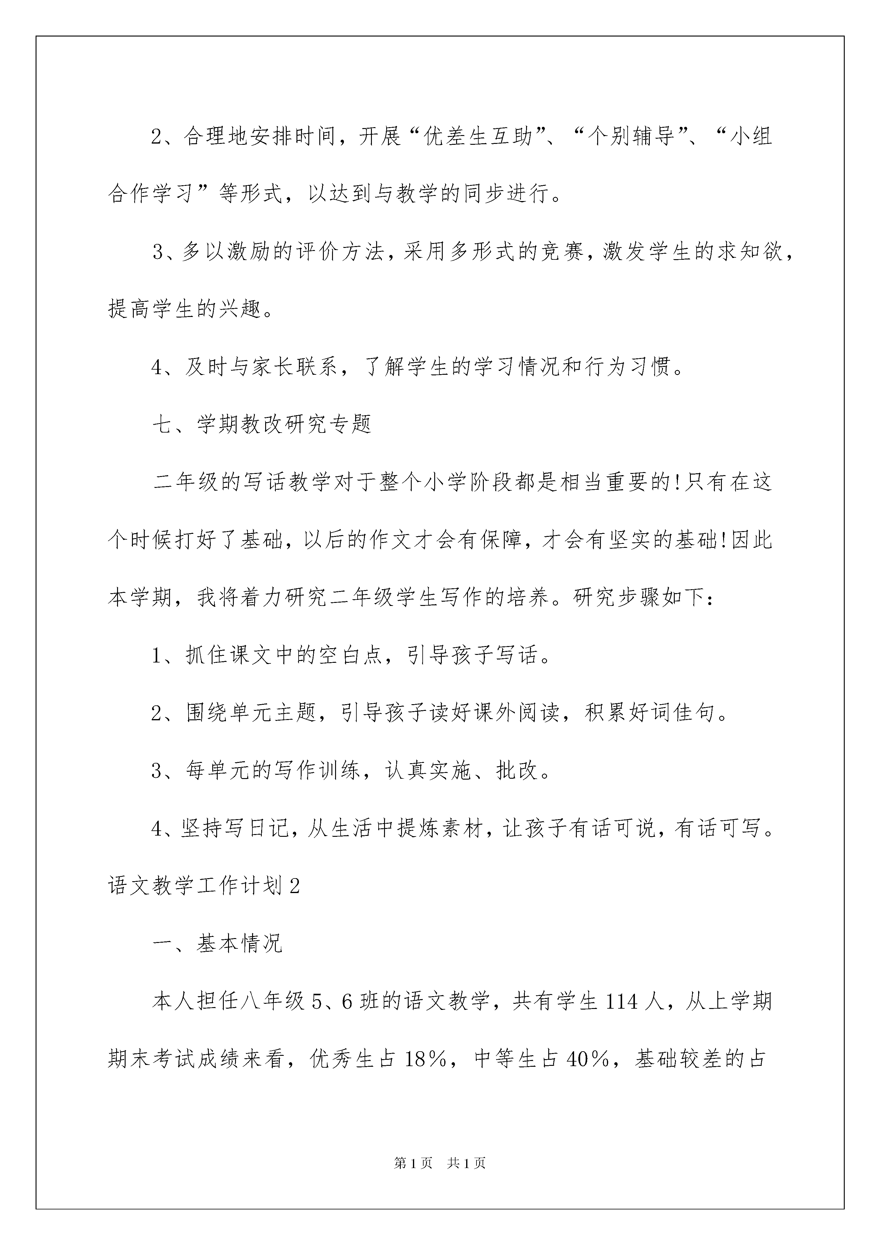 语文教学2022工作计划模板本学期我将以学校工作计划、教导处工作计划为指导,认真、塌实地完成本学期的语文教学工作。具体计划如下:一、学生情况分析:经过上学期的深入接触,我对班级的孩子有了一定的了解。我班现有56人,个别孩子常常给我的课堂教学带来许多的不便,但也是因此使我们班级充满了人文气息。从去年的检测成绩上看,我班孩子的课堂学业水平居中,在写字方面让我觉得较有一种成功的喜悦。在课外阅读方面有部分孩子似乎已经喜欢看课外书了,在语言表达方面,孩子们会讲,但顺序性不强,这可能与我的教学是脱不了关系的。还有少部