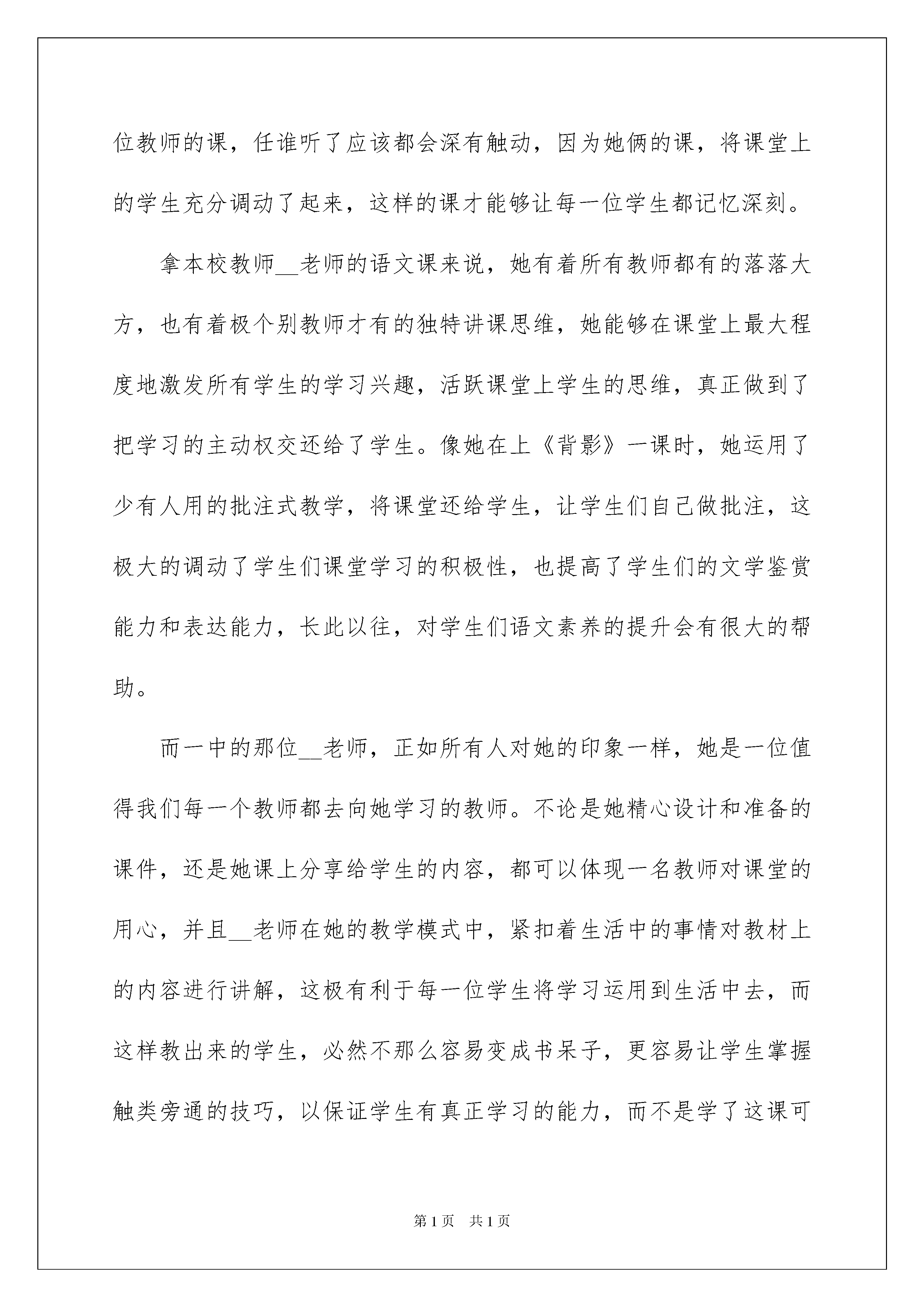 此资料由网络收集而来,如有侵权请告知上传者立即删除。资料共分享,我们负责传递知识。20XX年高中语文老师听课心得体会听课是推进课堂教学、提高课堂效率的有力手段,有效开展活动对于提升语文教学整体水平、打造业务精湛的教师队伍具有重要意义。下面是有20xx高中语文老师听课心得体会,欢迎参阅。20xx高中语文老师听课心得体会范文110月27——29日三天时间,我在禹城观摩了市教研室组织的“高中语文听课心得体会语文教学能手评驯活动。每一堂课都是具有学习意义,但都各有特色。对于正在语文教