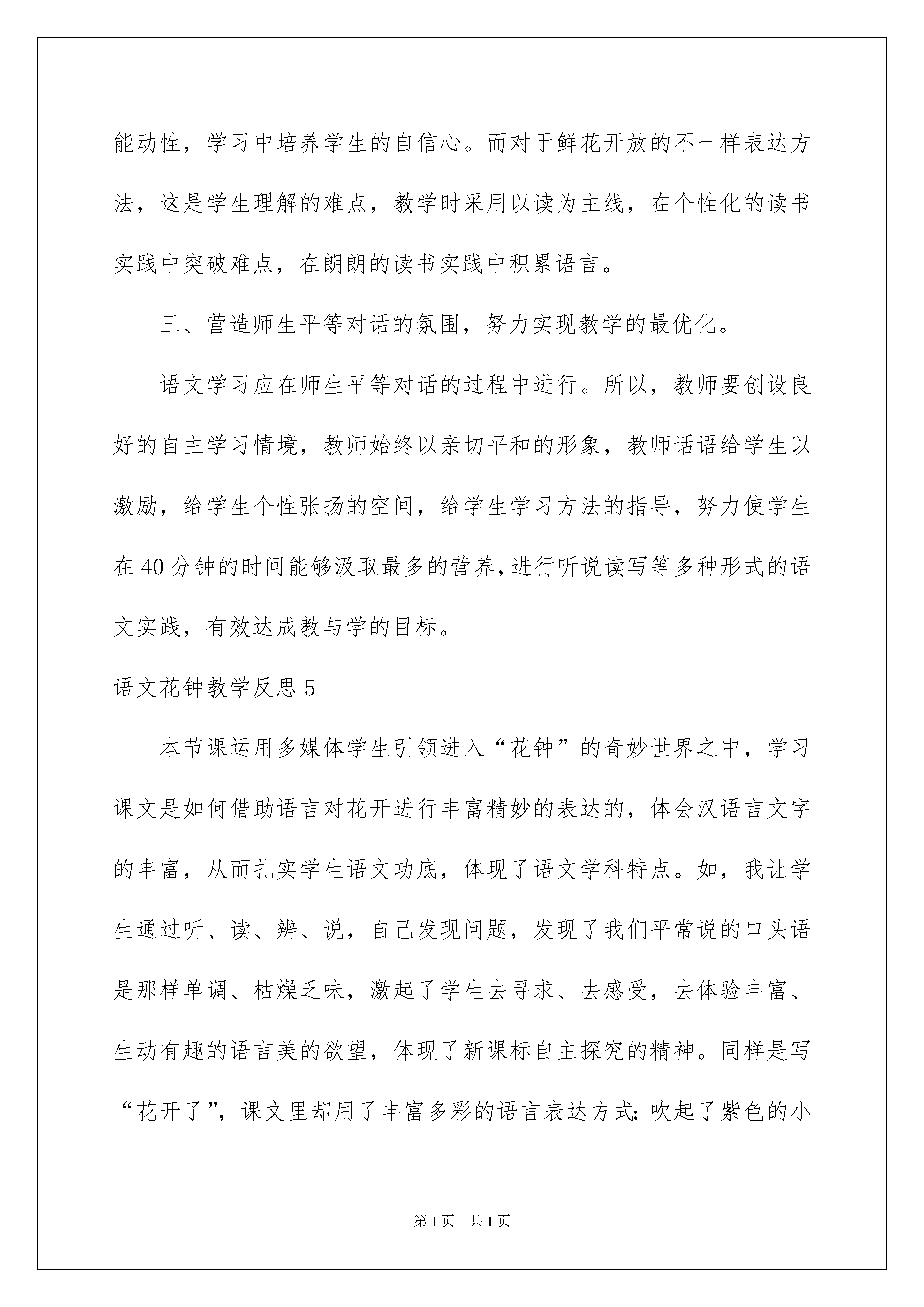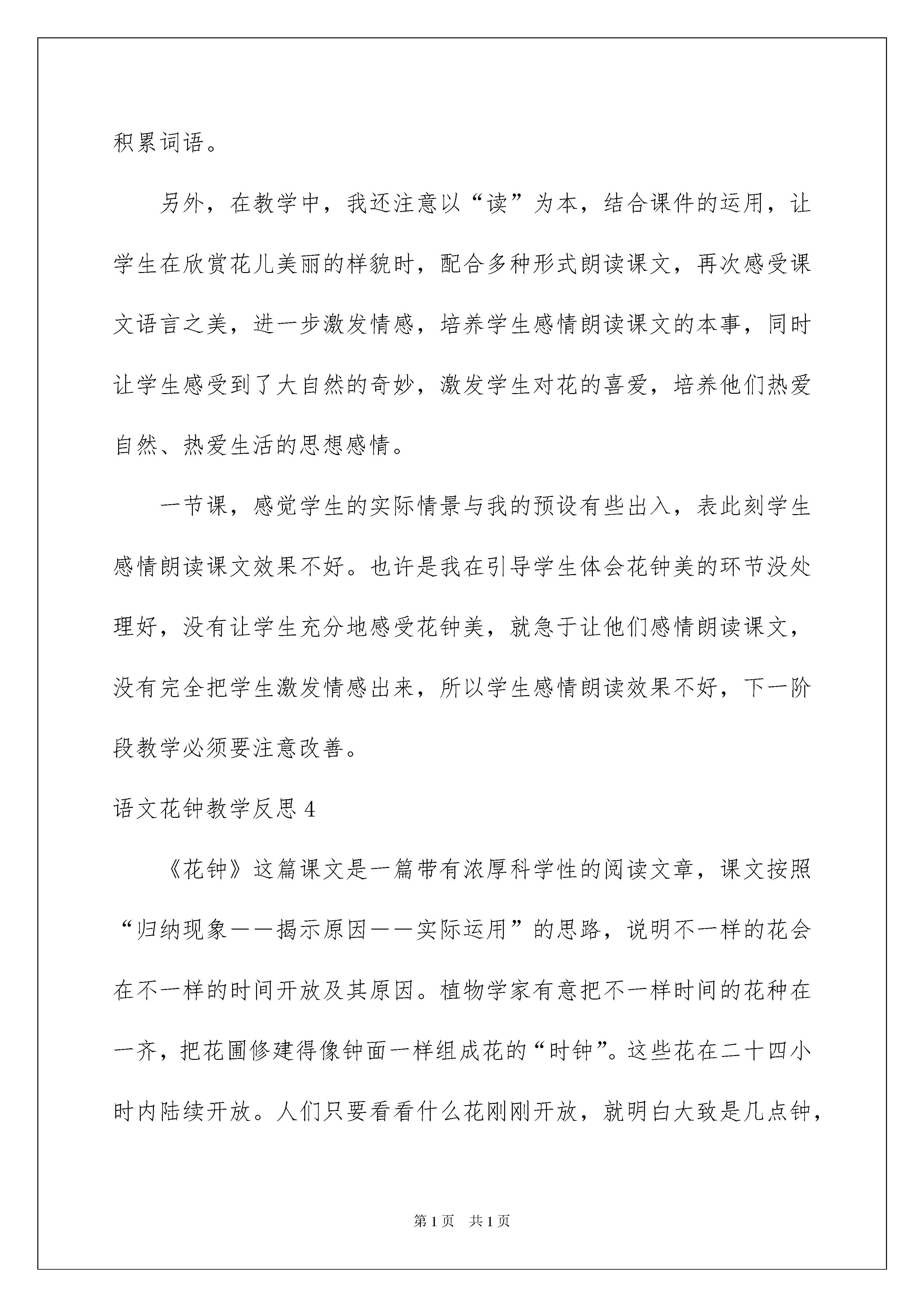 2022语文花钟教学反思语文花钟教学反思身为一位到岗不久的教师教学是我们的任务之一通过教学反思可以有效提升自己的课堂经验写教学反思需要注意哪些格式呢?下面是我收集整理的语文花钟教学反思仅供参考欢迎大家阅读。语文花钟教学反思1