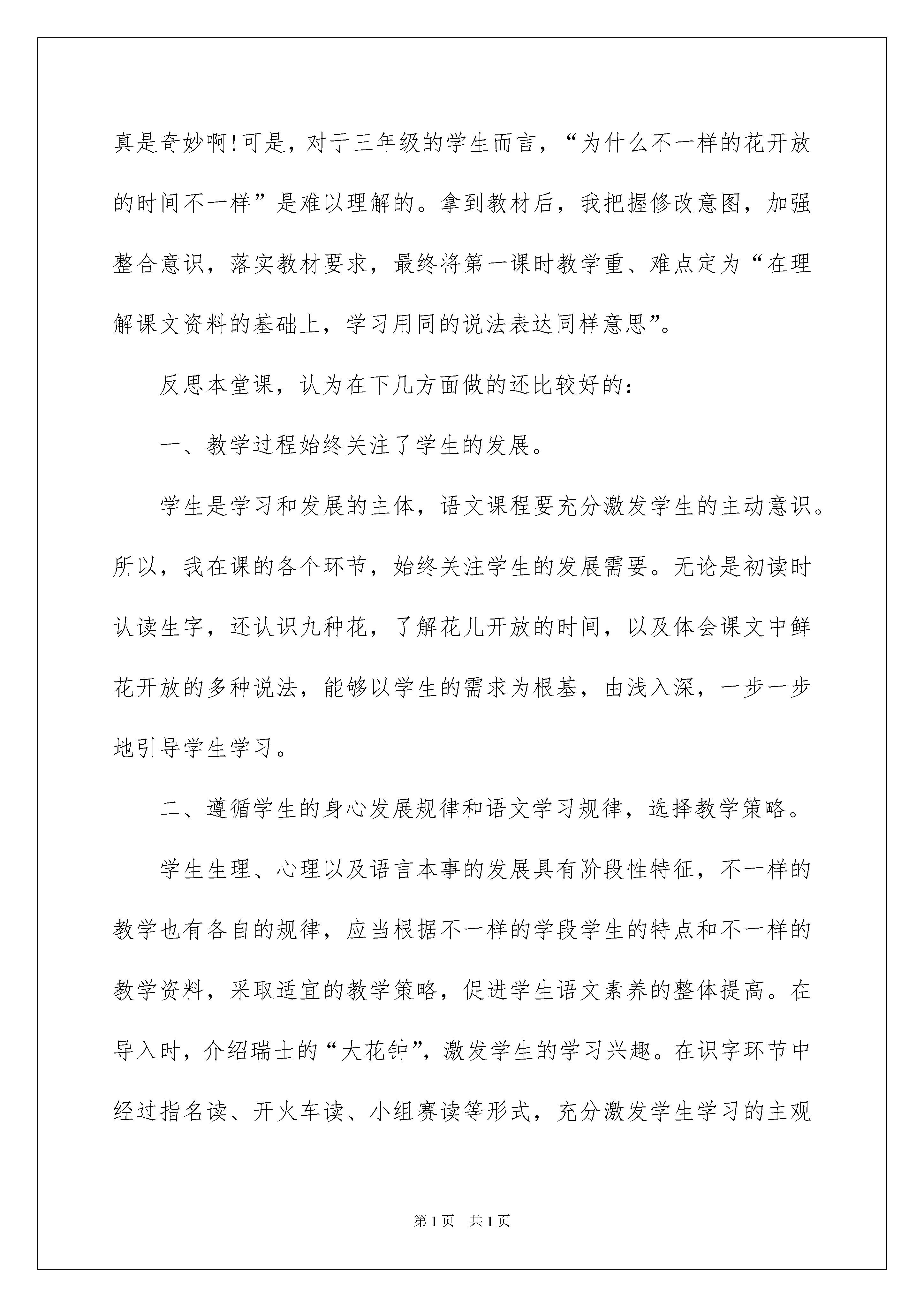 2022语文花钟教学反思语文花钟教学反思身为一位到岗不久的教师,教学是我们的任务之一,通过教学反思可以有效提升自己的课堂经验,写教学反思需要注意哪些格式呢?下面是我收集整理的语文花钟教学反思,仅供参考,欢迎大家阅读。语文花钟教学反思1《花钟》一文是三年级上册第四单元紧扣“细心观察”这个专题的第一篇课文。文章仅用3个自然段将鲜花之美、花钟之奇描述的生动