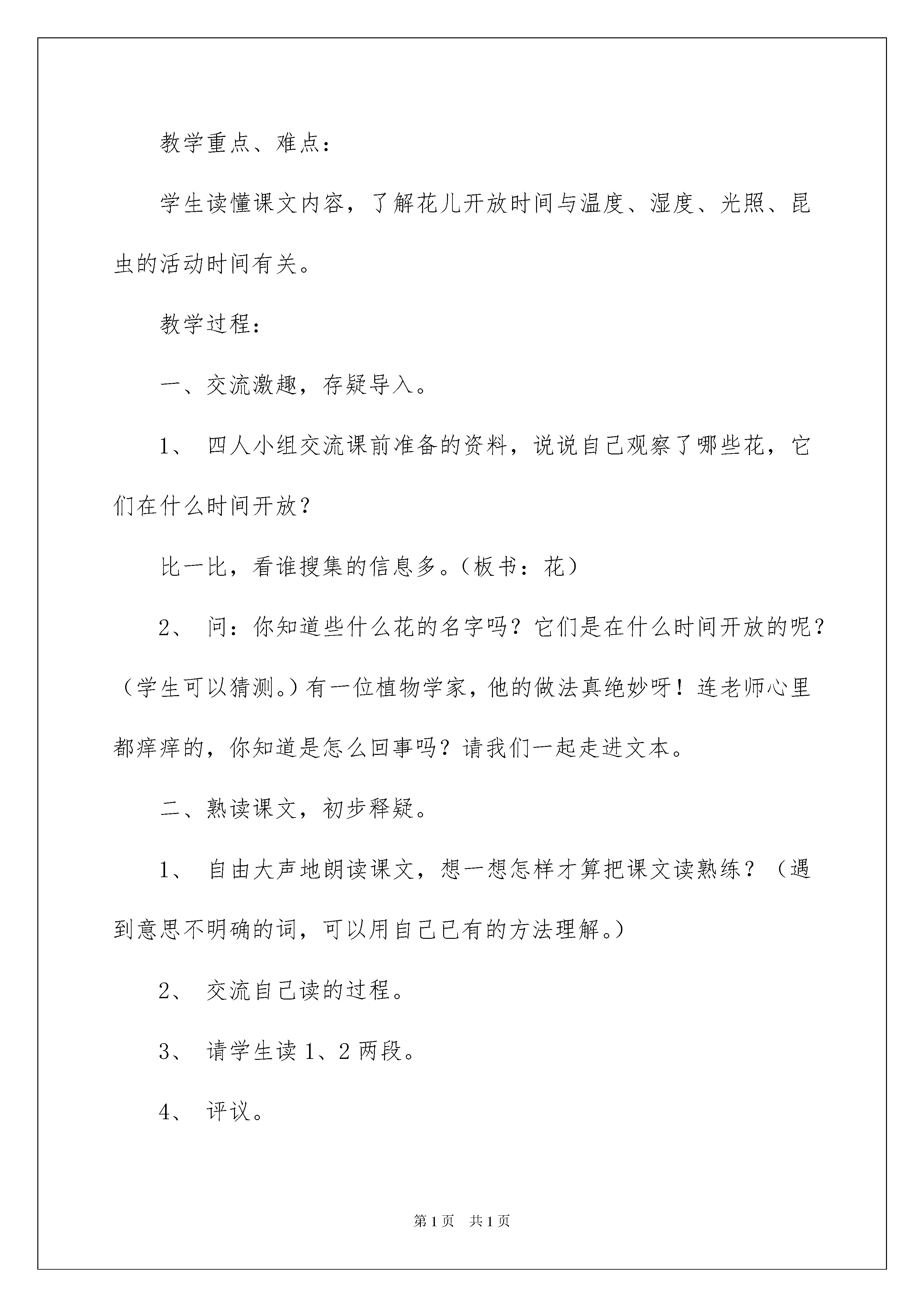语文《花钟》教学反思语文《花钟》教学反思作为一名优秀的教师,教学是我们的任务之一,我们可以把教学过程中的感悟记录在教学反思中,那么你有了解过教学反思吗?下面是小编为大家收集的语文《花钟》教学反思,欢迎阅读,希望大家能够喜欢。语文《花钟》教学反思1《花钟》这篇课文是一篇带有浓厚科学性的阅读文章,课文按照“归纳现象――揭示原因――实际运用”的思路,说明不一样的花会在不一样的时间开放及其原因。植物学家有意把不一样时间的花种在一齐,把花圃修建得像钟面一样组成花的“时钟”。这些花在二十四小时内陆续开放。人们只要看看