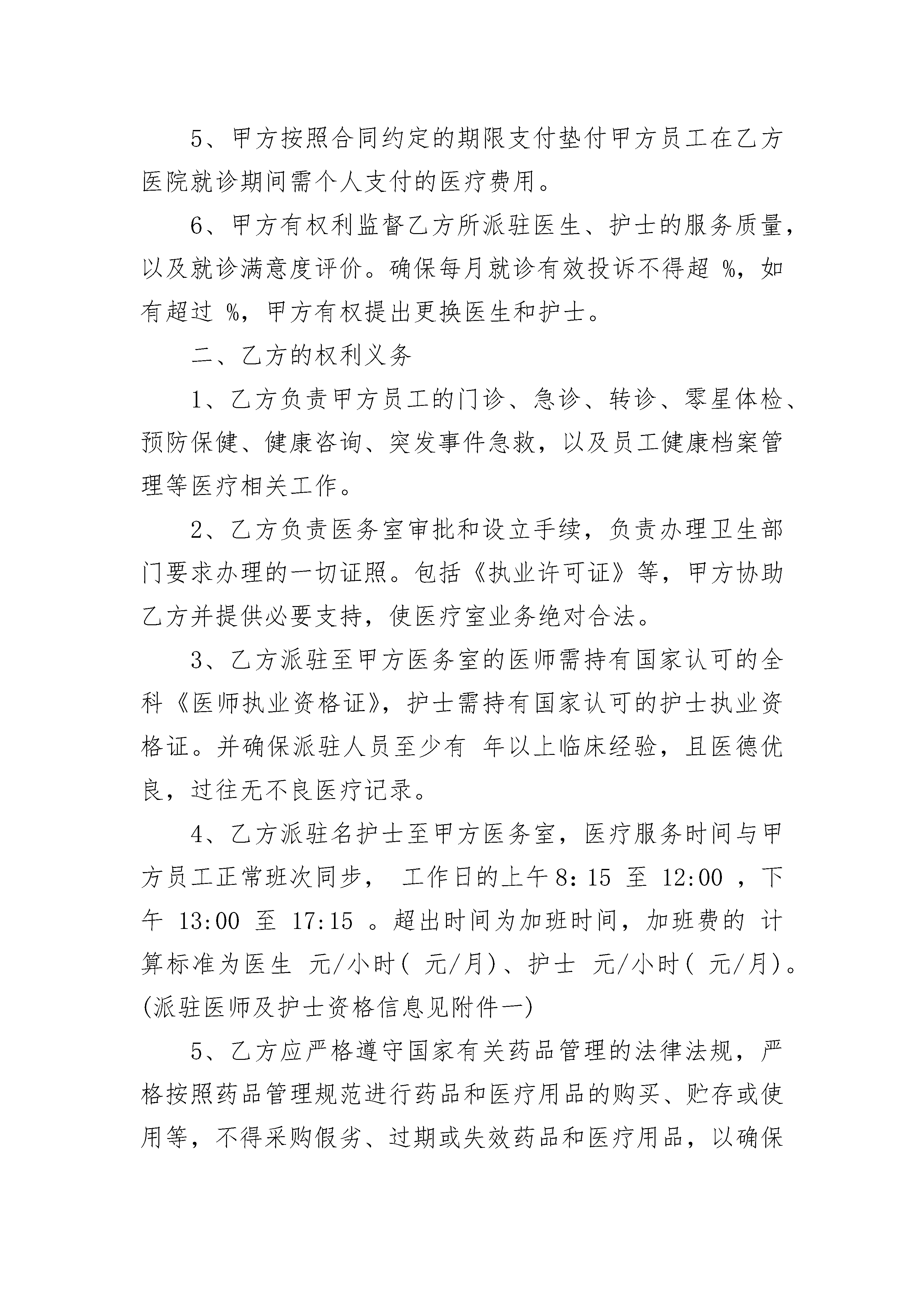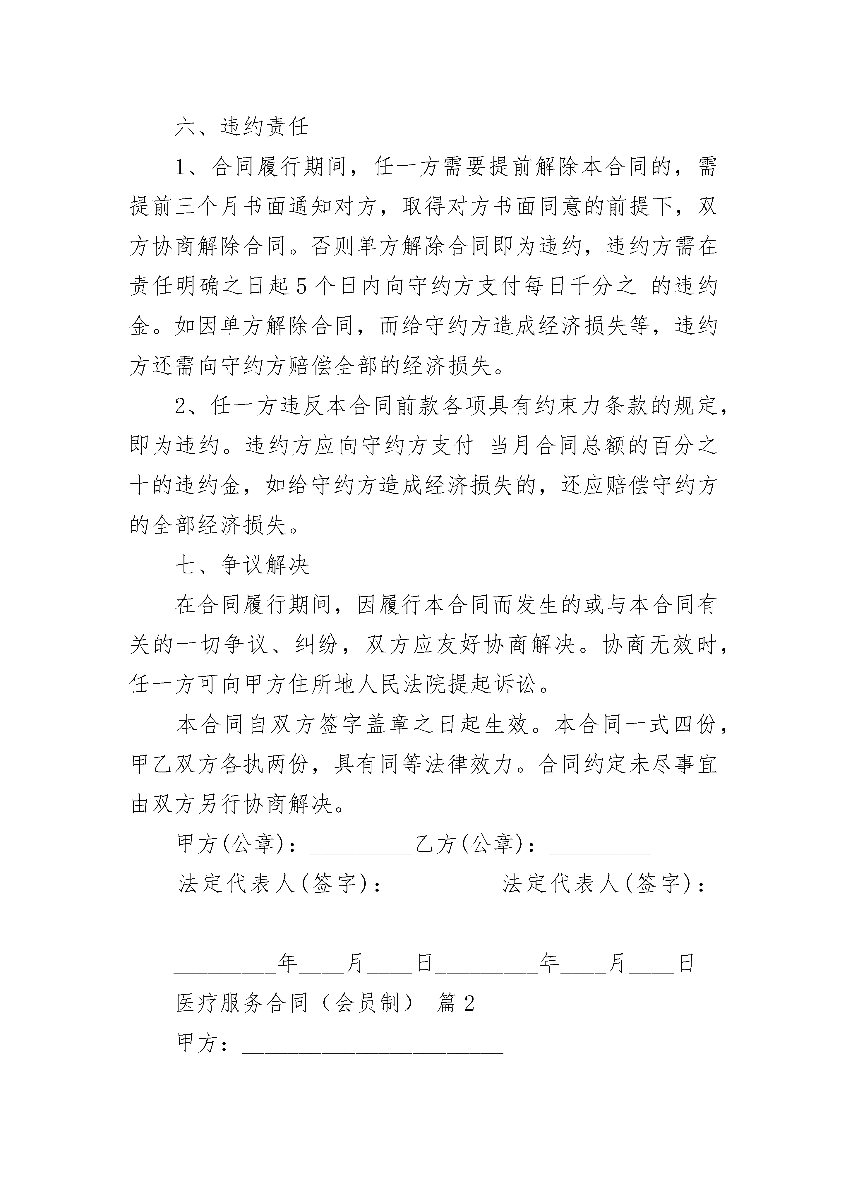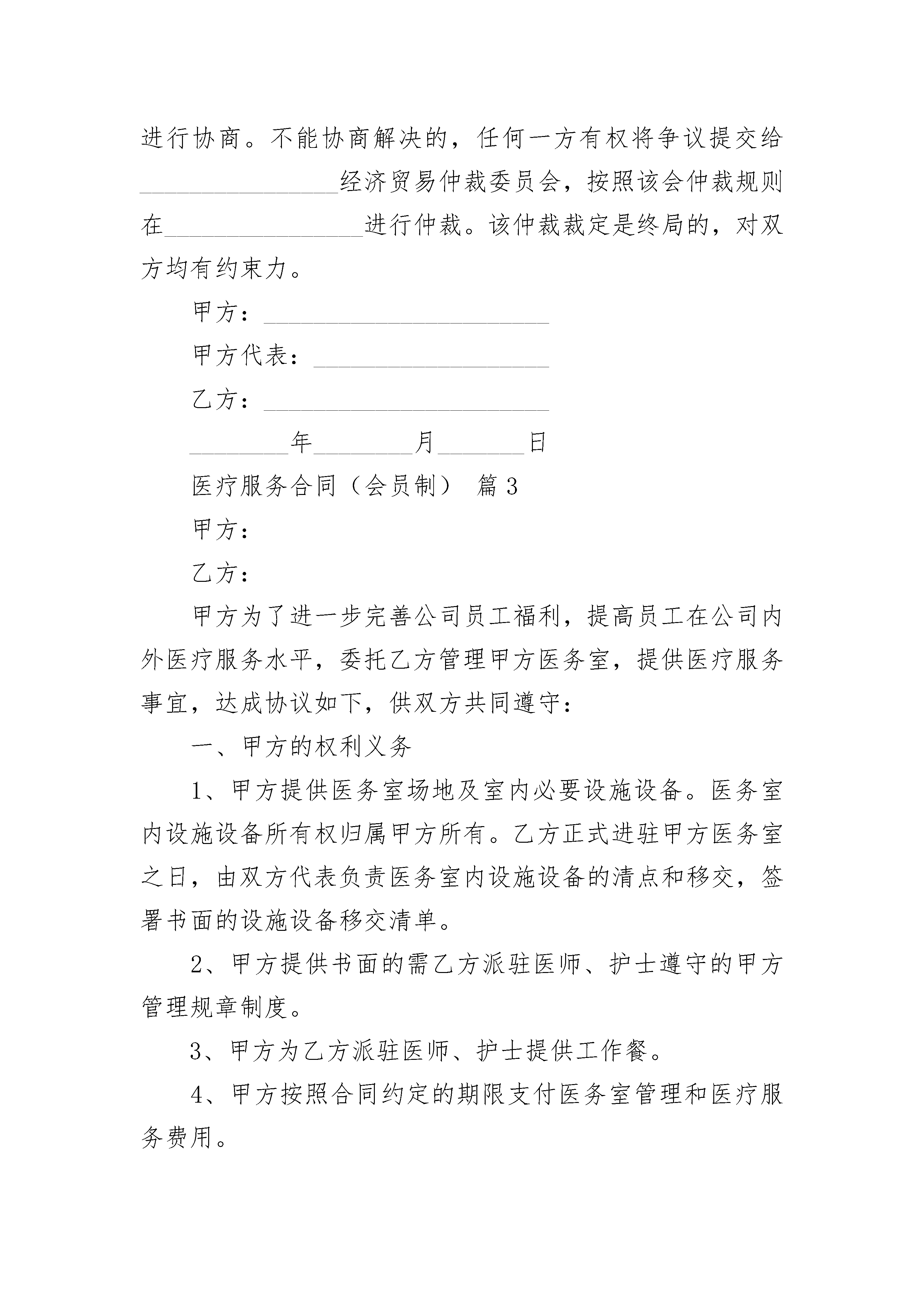 医疗服务合同(会员制)医疗服务合同(会员制)(通用22篇)医疗服务合同(会员制)篇1甲方:乙方:甲方为了进一步完善公司员工福利,提高员工在公司内外医疗服务水平,委托乙方管理甲方医务室,提供医疗服务事宜,达成协议如下,供双方共同遵守:一、甲方的权利义务1、甲方提供医务室场地及室内必要设施设备。医务室内设施设备所有权归属甲方所有。乙方正式进驻甲方医务室之日,由双方代表负责医务室内设施设备的清点和移交,签署书面的设施设备移交清单。2、甲方提供书面的需乙方派驻医师、护士遵守的甲方管理规章制度。3、甲方为乙方派