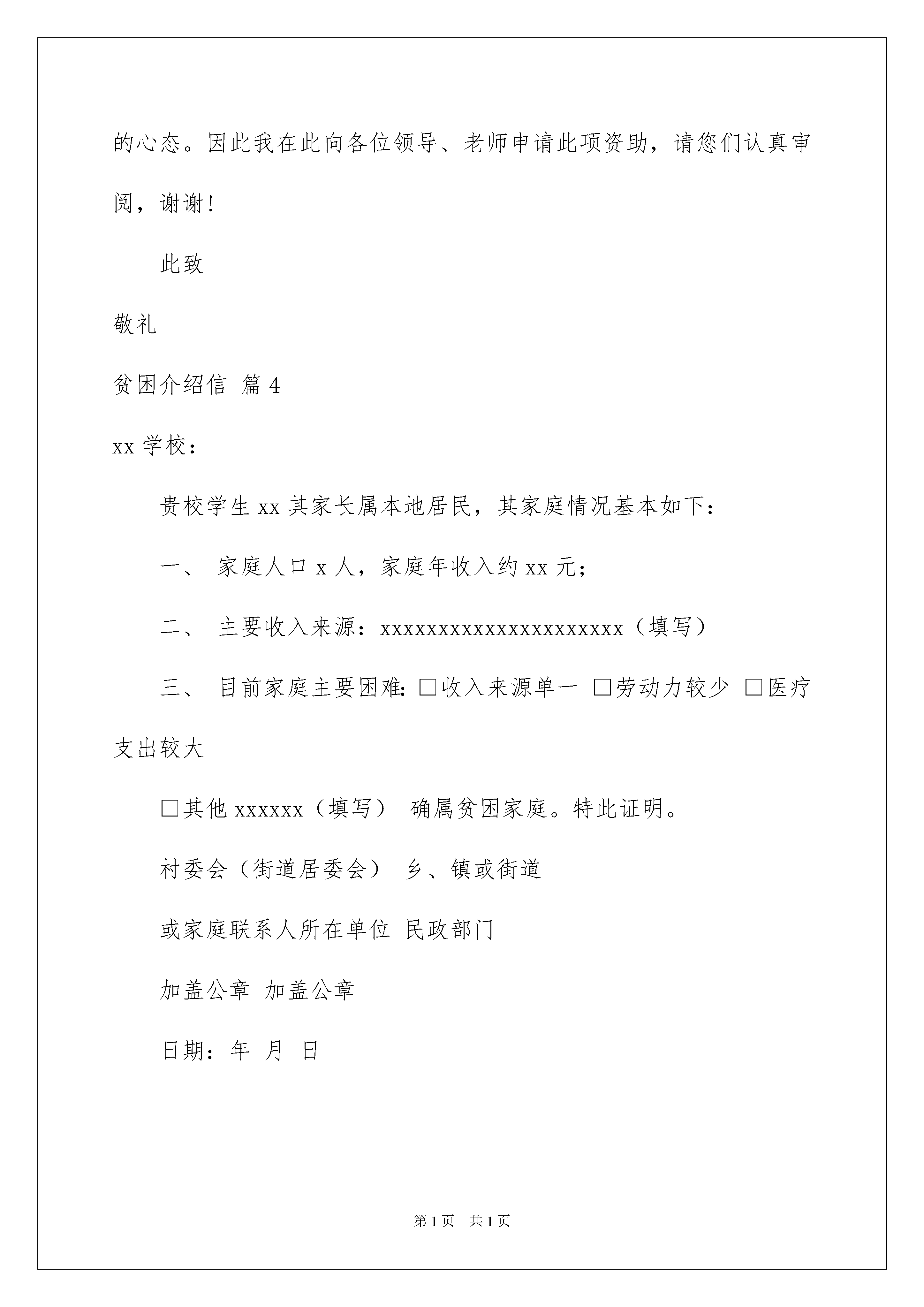 2022贫困介绍信4篇贫困介绍信4篇在社会发展不断提速的今天,越来越多地方需要用到介绍信,介绍信的内容包括被介绍人的姓名、身份、随访人的人数、活动的目的、对受访单位的请求等。那么问题来了,到底应如何写一份恰当的介绍信呢?下面是我精心整理的贫困介绍信4篇,欢迎阅读与收藏。贫困介绍信篇1xxxx学院:xxxx(学生本人姓名)系省(市、自治区)市(县)xxx(村民委员会或居民委员会)人,xxxx年考入贵校,其家庭(以下填写申请人家庭经济情况介绍)生活困难,父母在家务农,以种田养蚕为业,每月收入约300元左右,其哥哥在广州某电脑学校工作,每月收入600元左右。20xx年秋季与其弟弟同时考上大学,家庭经济收入少,无力支持其完成学业,拟申请助学贷款,望贵校予以资助。特此证明。经办人:xxxx签字)xxxx村民委员会(居民委员会)(盖章)日期:年月日贫困介绍信篇2尊敬的校老师,领导:你们好!我来自家庭贫困的农村,父母都是农民,既没有文化,也没有本钱,又无一技之长,因此只好已做短苦工老维持生计,并且母亲身体一直不好。基本干不了什么,反而经常吃药打针。看着母亲日渐削弱的身体觉得自己很对不起他们,因此所有的家庭重担都有父亲一人承担,父亲干的活是对身体有害的,但是为了给我交学费他不惜牺牲自己的身体,这种父爱让我很不是滋味。我不知道怎么报答他们,但是尽管如此,可只能维持基本的收入。日子一直过的紧紧巴巴的,虽然父母一直觉得对不起我们,吃没吃到好的,穿没穿到好的,但我一直觉的我很幸福,至少精神上是幸福的,真的,爸妈很开明,不像有的父母觉得读书无用,对子女的学习莫不关心,有的初中都没读完就让其辍学去打工,有的读个高中,鲜少能升入大学,爸爸的文化程度不高,我妈妈更算是半个文盲,但他们知道读书是好的,学知识是好的,他们说只要我读的进去,读的多高他们都愿意。就算砸锅卖铁。我感谢他们。尽管如此父亲也不想给国家增添负担,即使自己省吃俭用也要坚持交学费。但是天有不测风云,暑假一次意外父亲出了车祸膝盖受伤,暂时什么都不能干,这样本来拮据的家庭平添了一份痛苦,这样下来学费交不上了,生活费没有了。我小的时候,学费还不太高,少则几百,多不过千,爸妈还供的起,但学历每上一个台阶,学费就要翻倍,我大学一年的学费是5000,但我家一年的总收入都没有这么多,怎么可能交的齐。现在是负债累累,我读的是计算机学校,却没有计算机,但是是对我来说是奢求。贫困介绍信篇3尊敬的校领导:您好!我是来自生命科学与技术学院制药工程专业的一名大三的学生。以下是对本人家庭情况的'详细描述:首先,我是一名来自农村的学子,我的家乡坐落于广西梧州藤县金鸡镇一个偏僻的小山村里。即使是处于经济高速发展,道路村村通的现代化社会,但是由于我家乡人口少,经济不发达,至今仍然是泥路,交通极度地不便利。也正因为交通的落后,导致村子里面的经济一直得不到发展,如此一来家乡就显得更加落后了。外面的人进不来,里面的人也走不出去。这样的反复循环,村子就越来越落后了。接下来,请允许我介绍一下本人的家庭状况:我家一共有7口人,爸爸我妈妈和我五兄妹。如今,有三个哥哥都已经独立门户,而我则和我爸妈,还有二哥住在一起。现在,爸妈年纪都大了,身体也大不如前了。爸爸今年61岁,我妈妈今年62岁,而哥哥又因为年轻时发生了意外,导致其右手截肢,现已丧失了大部分的劳动能力。此外,我爸妈一直在家里务农,没有固定的收入。并且到了他们这个年纪,老年人中一些常见的病痛也在困扰着他们。爸爸我妈妈的身体状况都不太乐观,爸爸患有骨质增生症,我妈妈患有低血糖和风湿痛,一到下雨天就手脚不便利。我看着都觉得辛酸,但是如今只能眼睁睁地看着,有心无力。平时,家里面的主要收入都靠爸爸我妈妈在家里面耕耘的那几亩水田,种些水稻、蔬菜和水果。但是这几年收成不怎么好,特别是今年。因为今年我家乡遭遇了洪涝灾害,导致那些农作物错过了播种的最佳时节,影响了收成。而我虽然有几个哥哥,但是他们都有自己的家庭需要照顾,所以基本上也顾不上我们,并且他们的小孩还要爸妈帮忙照顾。另外,去年家里面新建了厨房,这也花费了不少,建厨房的钱都是爸妈出。由于我上学的所有费用都是爸妈给的,因而被迫借了2~3万元的外债。如今,我的学费是靠贷款的。而生活费则是用贷款剩余的钱和我平时寒暑假去做兼职所赚得的钱。另外,如果在以前我叔叔家里比我家的经济条件好一些,所以他们偶尔会给我买一些生活用品和给我一些钱。但是,由于去年叔叔在县城买了房子,他的两个女儿也正在读大学,所以现在他家的生活也并不宽裕,基本上也没有什么闲钱来帮我家了。现在,当我知道可以向学校申请贫困申请的时候,我欣
