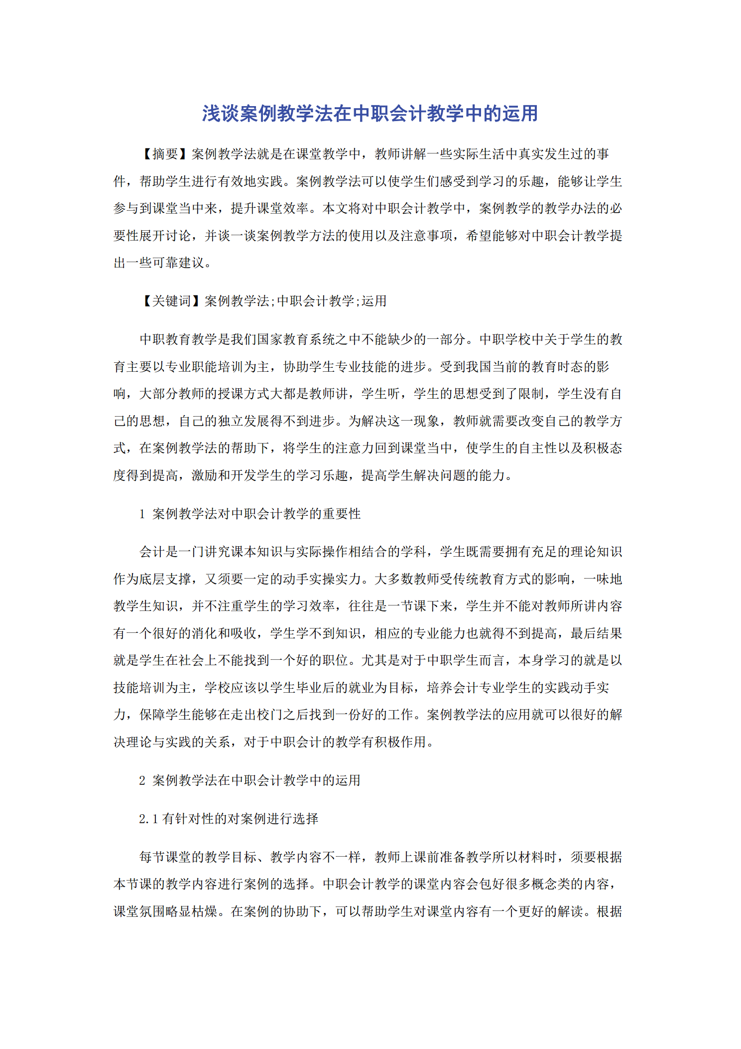 浅谈案例教学法在中职会计教学中的运用【摘要】案例教学法就是在课堂教学中,教师讲解一些实际生活中真实发生过的事件,帮助学生进行有效地实践。案例教学法可以使学生们感受到学习的乐趣,能够让学生参与到课堂当中来,提升课堂效率。本文将对中职会计教学中,案例教学的教学办法的必要性展开讨论,并谈一谈案例教学方法的使用以及注意事项,希望能够对中职会计教学提出一些可靠建议。【关键词】案例教学法;中职会计教学;运用中职教育教学是我们国家教育系统之中不能缺少的一部分。中职学校中关于学生的教育主要以专业职能培训为主,协助学生专业