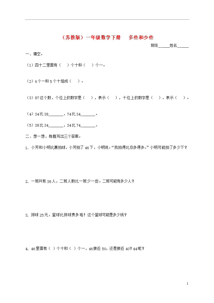 (苏教版)一年级数学下册多些和少些班级______姓名______一、填空。(1)四十二里面有()个十和()个一。(2)6个一和5个十组成()。(3)87这个数,个位上的数字是(),表示(),十位上的数字是(),表示()。(4)34比38________,74比34________。(5)38比34________,34比74________。二、想一想,每题写出三个答案。1.小芳和小明比赛拍球,小芳拍了46下,小明说:“我拍得比你多得多。”小明可能拍了多少下?2.一班共有38人,二班人数比一班少一些。二