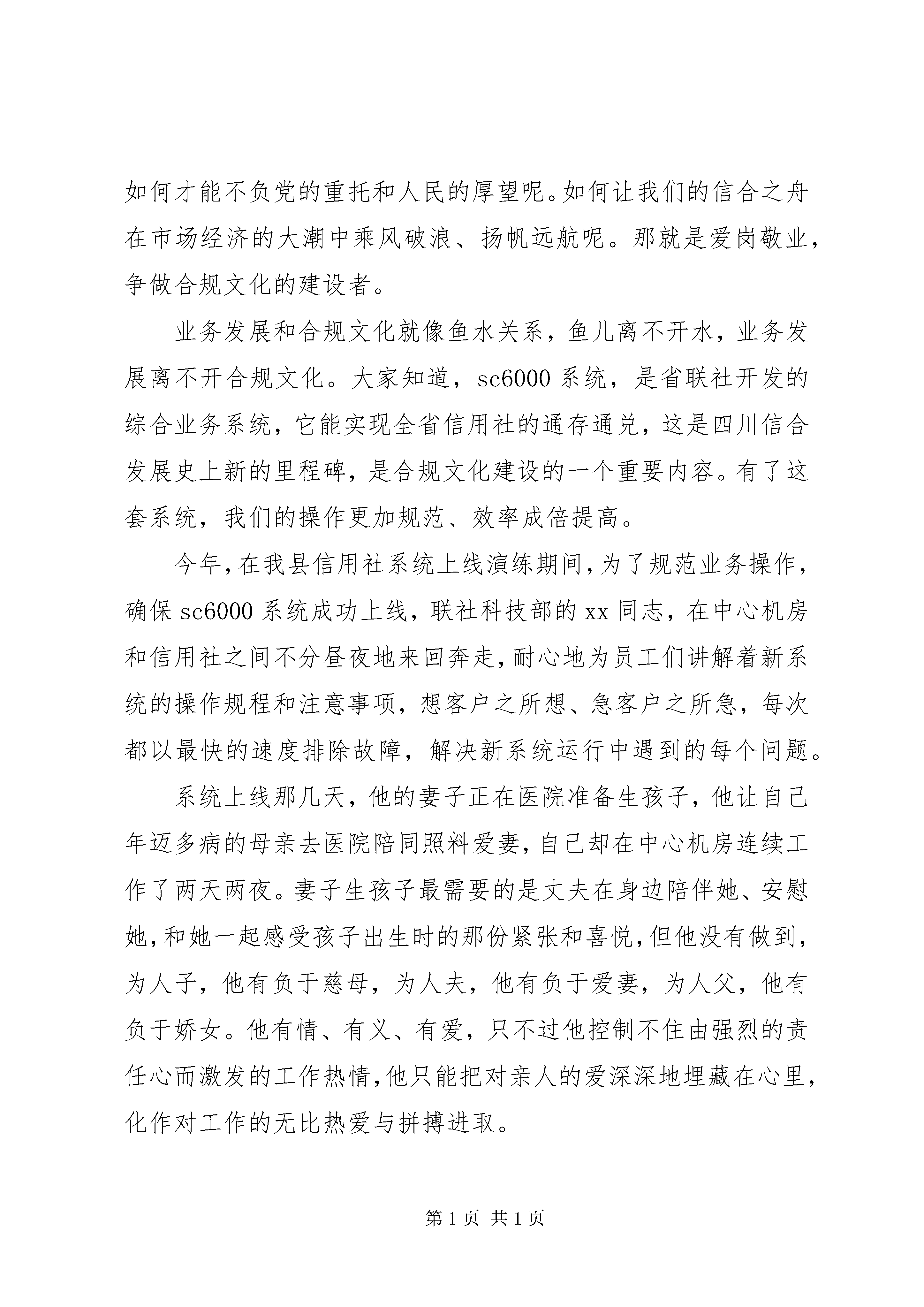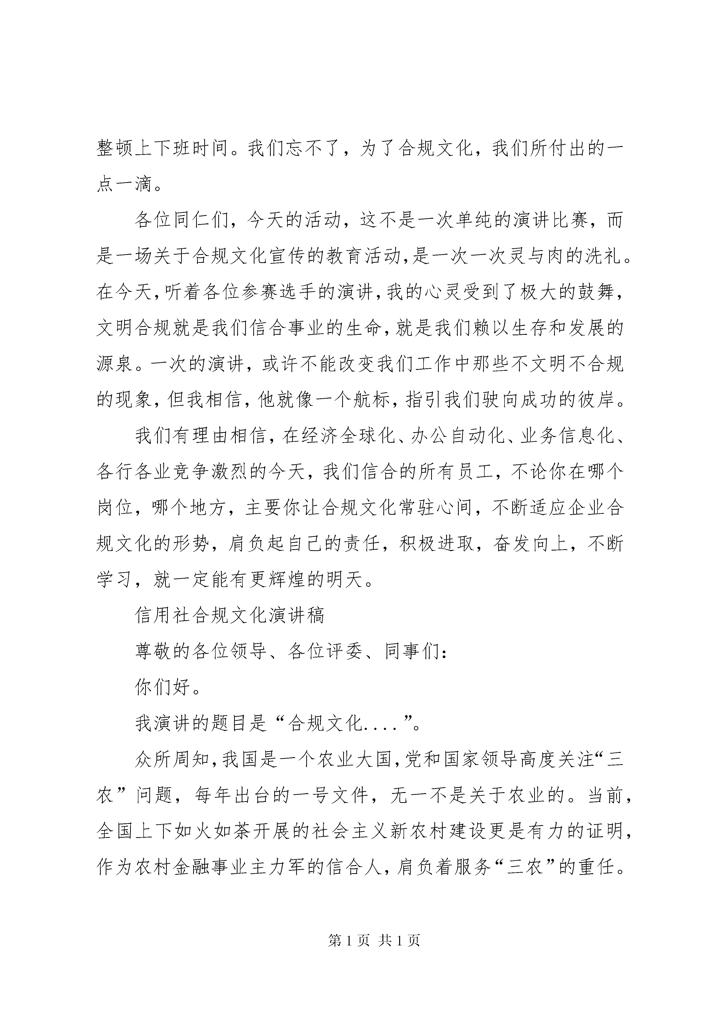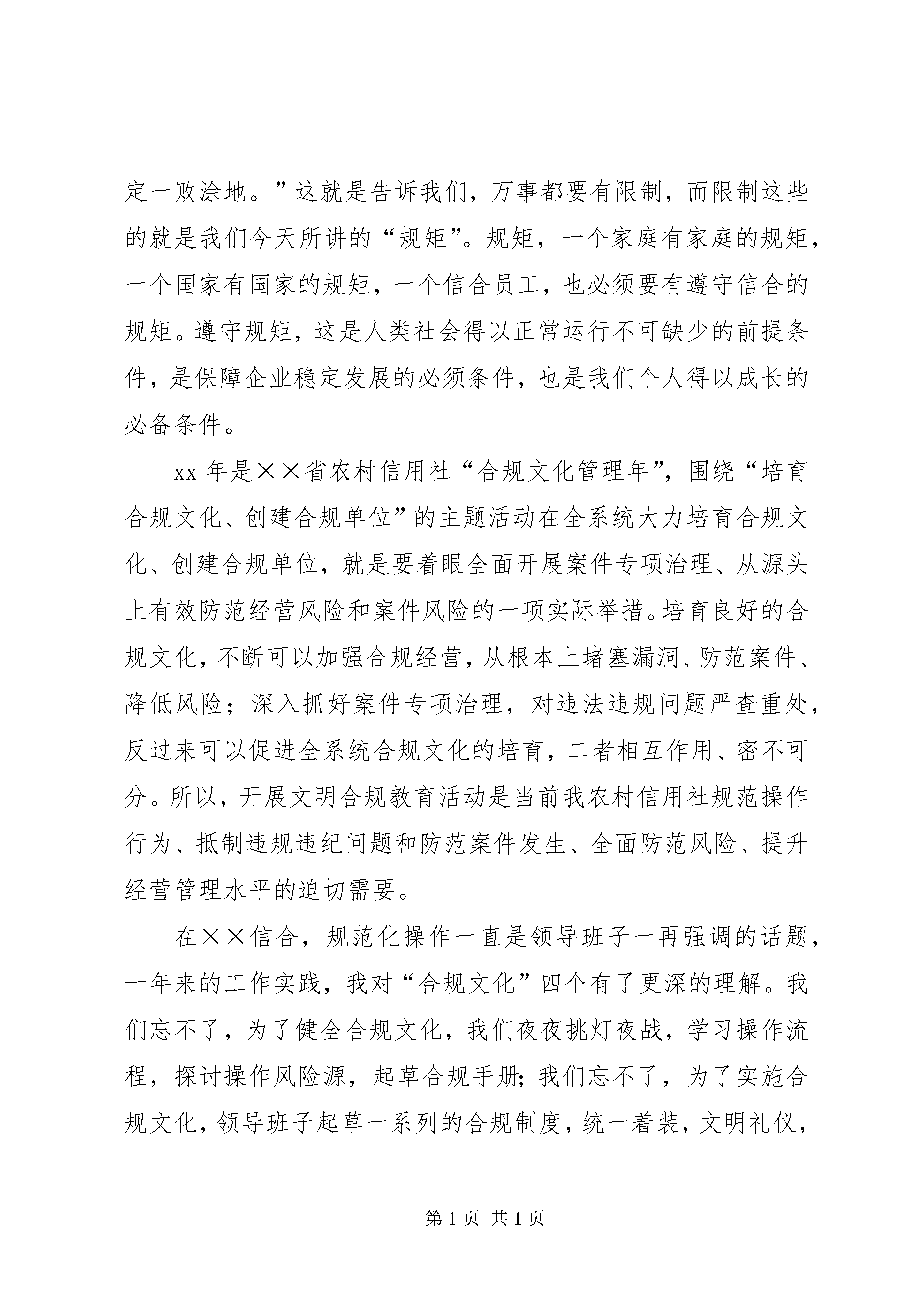 第PAGE\*Arabic\*MERGEFORMAT3页共NUMPAGES\*MERGEFORMAT3页合规文化演讲稿尊敬的各位领导、各位评委:大家好。今天我演讲的题目是“如何建设邢台银行特色合规文化”。所谓合规,简而言之就是合乎规定,俗话说。“没有规矩,不成方圆”,没有合规文化的良好氛围,就没有我行业务的稳健行远。合规文化建设是规范操作行为,全面防范金融风险,提升经营管理水平的需要,是每个员工必须履行的职责,更是保障自己的强有力武器。如何才能使合规文化建设深入人心,更好地为业务拓展保驾护航呢