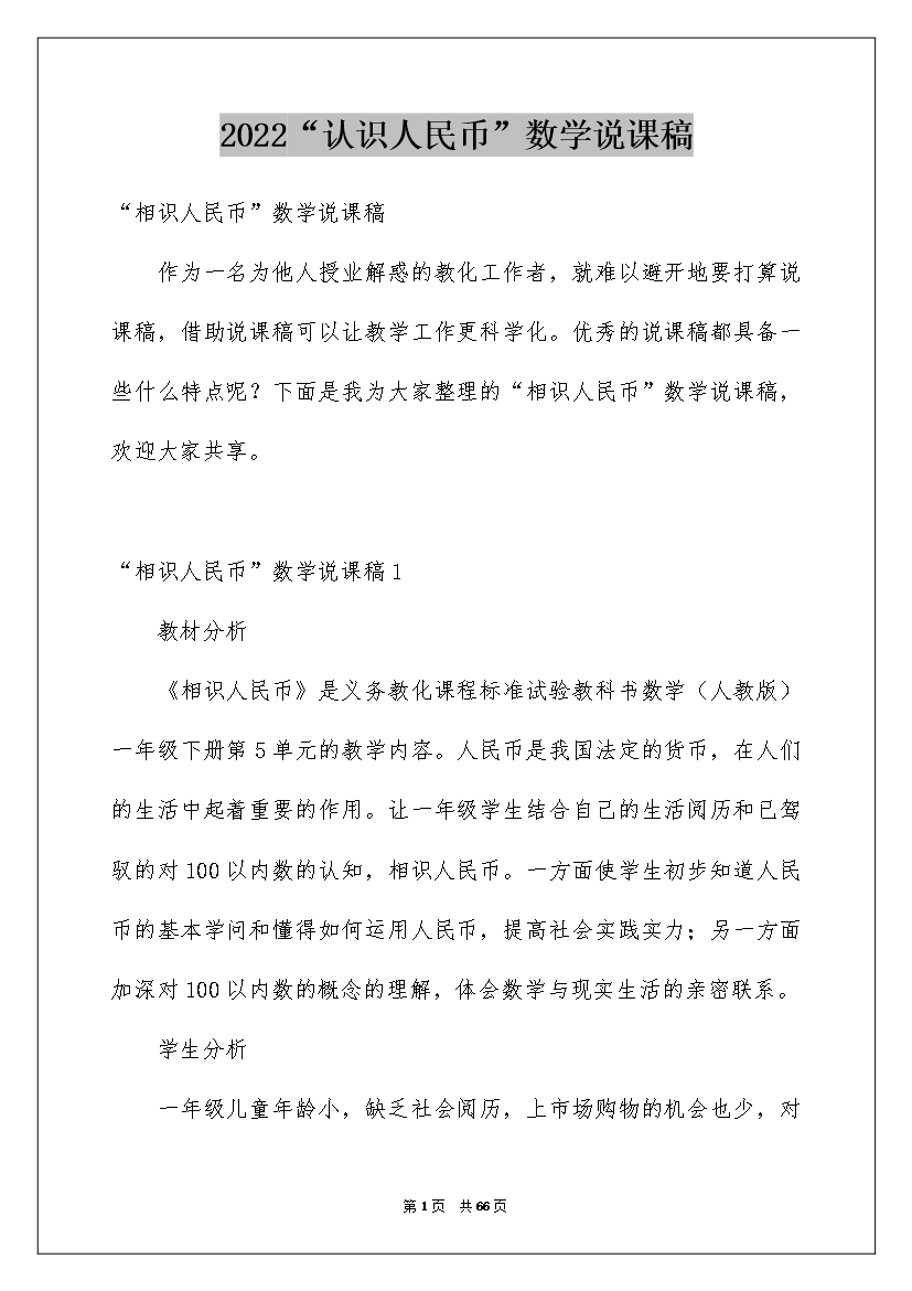 2022数学认识人民币说课稿数学相识人民币说课稿作为一位优秀的人民老师往往须要进行说课稿编写工作编写说课稿助于积累教学阅历不断提高教学质量。我们该怎么去写说课稿呢?以下是我帮大家整理的数学相识人民币说课稿欢迎阅读与保藏。数学相