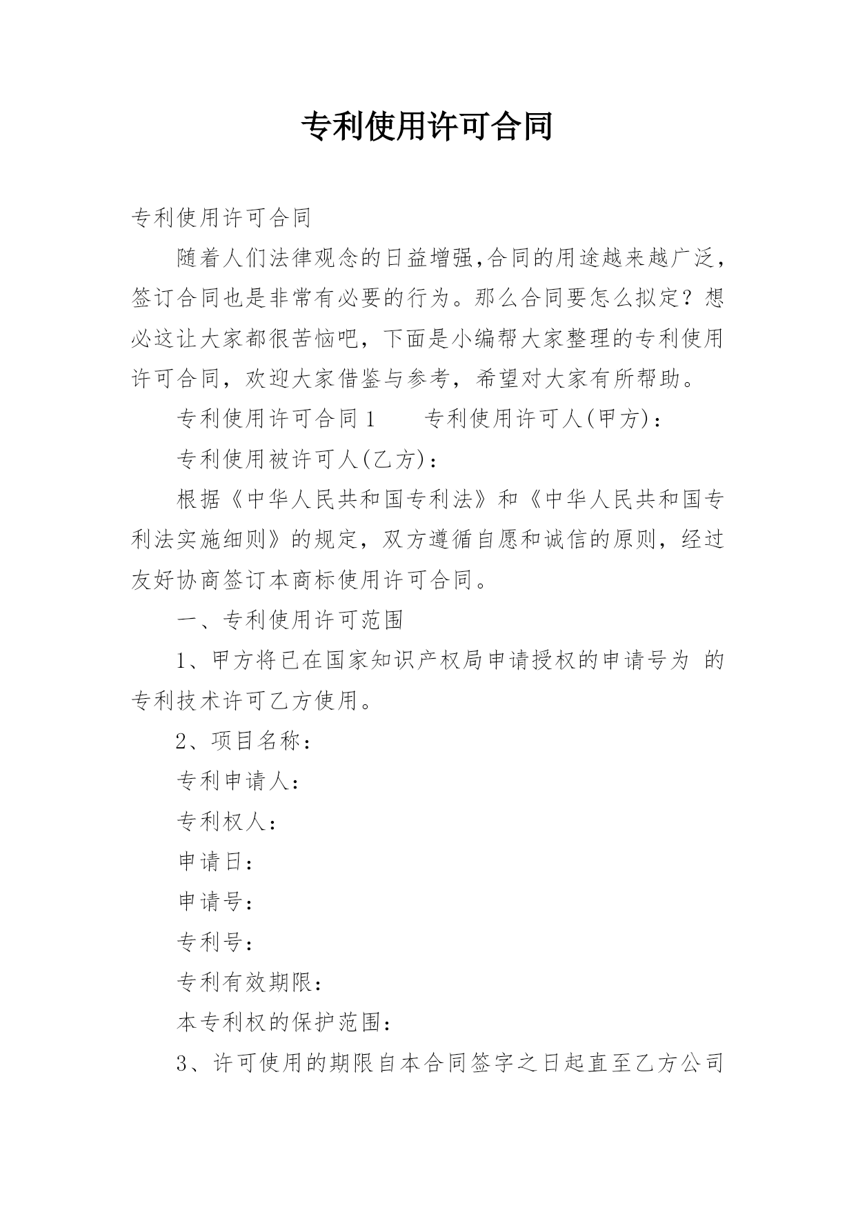 专利使用许可合同专利使用许可合同许可人:________________被许可人:______________鉴于:_________获国务院批准对其资产进行了资产重组(以下简称“重组”)并作为发起人依据中国法律于______年_____月______日成立了_________公司。_________向_________公司注入重组前属于_________及其下属企业或单位的主营业务包括石油、天然气的勘探和开发、炼油、化工、管道运输、产品销售、有关科研机构以及相关的资产、负债
