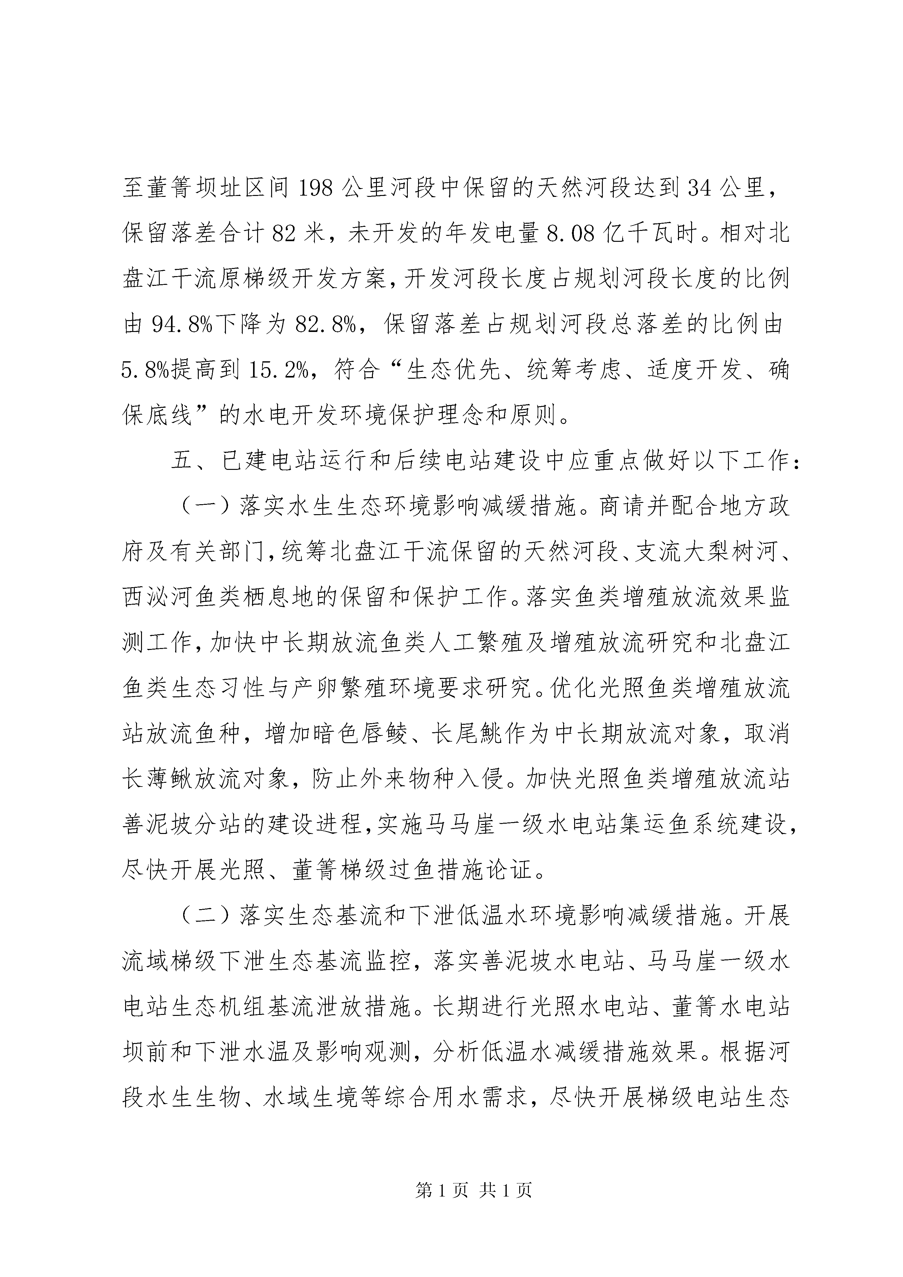 关于北盘江干流(贵州境内)水电开发环境影响回顾性研究报告有关意见的函第一篇:关于北盘江干流(贵州境内)水电开发环境影响回顾性研究报告有关意见的函关于北盘江干流(贵州境内)水电开发环境影响回顾性研究报告有关意见的函中国华电集团公司:你公司《关于请求审批北盘江干流(贵州境内)水电开发环境影响回顾性研究报告的请示》(中国华电科〔2011〕643号)收悉。我部于2011年9月23日在北京主持召开了《北盘江干流(贵州境内)水电开发环境影响回顾性研究报告》(简称《研究报告》)专家论证会。经研