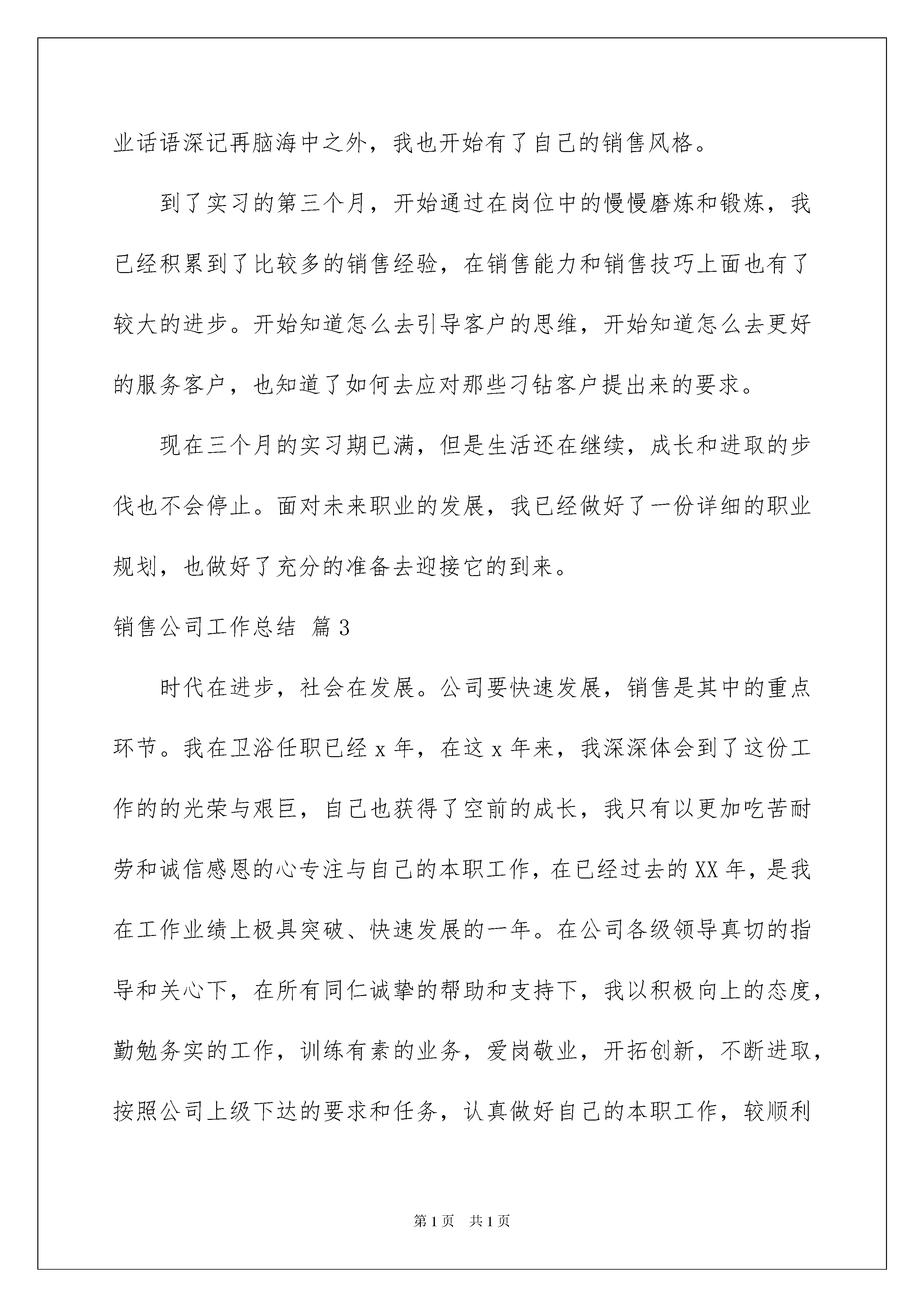 2022销售公司工作总结模板合集8篇销售公司工作总结模板合集8篇总结就是把一个时间段取得的成绩、存在的问题及得到的经验和教训进行一次全面系统的总结的书面材料,它可以帮助我们有寻找学习和工作中的规律,我想我们需要写一份总结了吧。你想知道总结怎么写吗?下面是我收集整理的销售公司工作总结8篇,欢迎大家分享。销售公司工作总结篇1去年,石化公司销售部产品销售工作取得了很大成绩,亮点多多。亮点一:全面完成各种产品销售计划。成品油销量达xx万吨,达到计划的xx%;自销产品销量达xx万吨(含出口石蜡、沥青),达到计划的xx%;集中买断化工产品总销售量达xx万吨,达到计划的xx%。沥青、基础油等统销产品100%完成销售计划。亮点二:市场预测准确率迅速提高。炼油产品总体销售均价由20xx年五大炼化企业的第四名跃升到20xx年的第二名。炼油自销产品销售均价由20xx年在五大炼化企业中排名第四跨越到20xx年的排名第一。亮点三:开辟了两种产品来料加工复出口新业务,拓展了国际新市场。根据市场形势的变化,销售部全力配合计划部门,开辟了沥青、化工两种产品来料加工复出口新业务,提高了中国石化产品在国际市场的知名度。亮点四:优化运输管理,有效降本减费。轻油罐车装载率由20xx年的87%提高到92。2%,全年节省运输费用20xx多万元。销售部营销人员说,这些成绩的取得,是他们贯彻“贴近市场、灵活经营,细分市场、细分客户”“以销定产、以产促销”等科学管理理念、精细化管理的结果。一、精心捕捉市场信息赢得先机。去年,销售部在捕捉市场信息、预测市场变化上下工夫。部商务信息科每名职工分工负责几个产品的市场信息采集,利用一切可以利用的资源,每天了解市场行情,全面掌握周边兄弟企业、资源状况、需求情况;每天进行重要产品市场变化通报;每周进行市场预测分析,为产品销售决策提供参考。他们每到一个地方出差都想方设法结识行内人士、建立信息联络网,得到每一个信息都用心分析。部领导干部出差入住宾馆后第一件事是上网了解产品市场行情,然后走访当地客户,走到哪都不忘用手机、短信了解公司产品最新销售情况。由于用心捕捉,能够快速了解掌握市场变化、产品价格走势,因而为正确决策、灵活营销赢得先机。当市场需求有增加趋势、产品可能供不应求时,在其他兄弟企业之前率先推价,通过打提价时间差、多卖高价产品,提高产品均价;市场需求有下降趋势、产品可能供过于求时,主动出击,联系客户,推销产品,稳价降库,通过打降价时间差、多卖高价产品,提高产品均价;对一些在淡季实在难以卖出好价格网的产品,进行移库,等市场好转后再销,既保证了生产后路畅通,又保住了产品价格,增加了效益。春节前后是产品销售淡季,客户大多观望等待厂家降价。对此,销售部及早筹划,提前做好每个产品的销售计划和相关应对措施,派出营销人员四处联系,主动做工作,打破客户的观望心理,在产品市场疲软的时候保证提货进度,稳价降库。二、准确把握销售节奏赢得效益。销售部的营销人员总结出一条经验,就是“把握好市场运行规律,抓住有利时机,大胆推价稳价”。他们每时每刻盯住产品市场价格,以先进企业的出厂价作为基准价,考虑国家政策调整、公司各产品的产销存情况、兄弟企业的产量及库存情况等因素,在基准价的基础上进行合理的调整,形成清晰的定价体系。在确保炼化生产后路畅通的前提下平衡好量价的互动关系。在区域市场发生变化时,根据实际情况制定价格,不盲目比价,确保了产品的全产全销。在市场价格的指导下,根据市场的网变化,积极配合计划、生产等部门努力做大沥青的销售量,减少重油的销售。与前年同比,增加沥青销量xx万吨,减少重油的销量xx万吨,使公司实现合理增效xx亿元。根据榨季客户对食品级硫磺的需求,主动建议公司生产、销售食品级硫磺,拓展市场新路子,满足客户需求,全年增加销售效益约xx万元。销售部实施差异化价格策略,在不同时期运用不同的目标市场定价,强化销售措施,努力提高产品销售效益。根据国家消费税调整、成品油价格波动等因素引起的市场变化,测算成品油与自销产品的销售效益,及时提出使公司效益最大化的产品结构生产建议;在旺季时价格随行就市,努力提高均价;淡季时采取批量优惠手段促销,将自销产品卖出了当期的最好价格。去年,在总部考核的5类产品中,公司产品均价达到或者超过了总部的比价指标,自销产品销售均价达3189元/吨,由20xx年五大炼化企业中排位第四上升到第一。20xx年与先进单位相比,自销产品销售均价低173元/吨,20xx年与先进单位比相比低100元/吨,缩小差距73元/吨,剔除消费税和产品结构的影响,反超44元/吨,进步217元/吨。石蜡、白油、工燃
