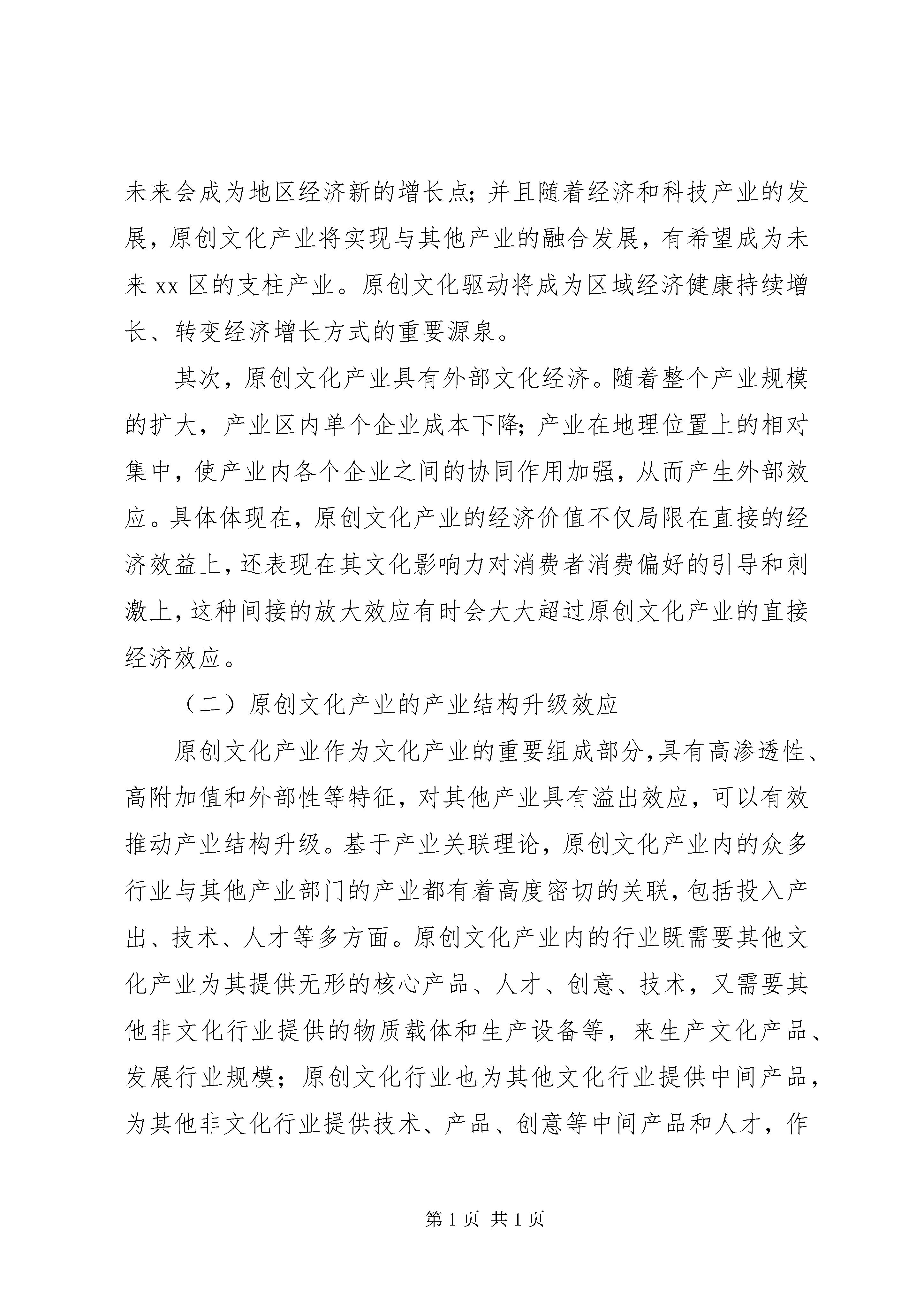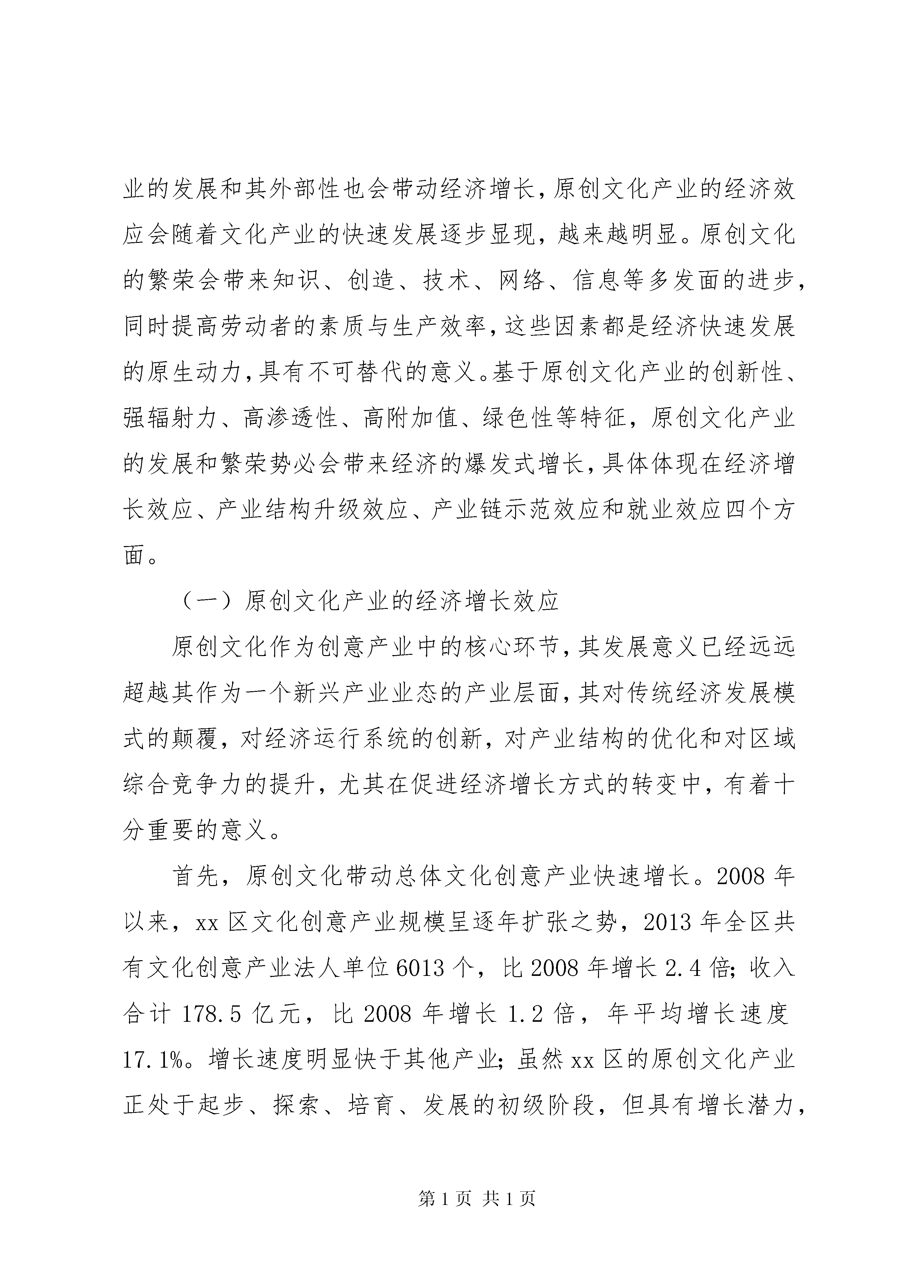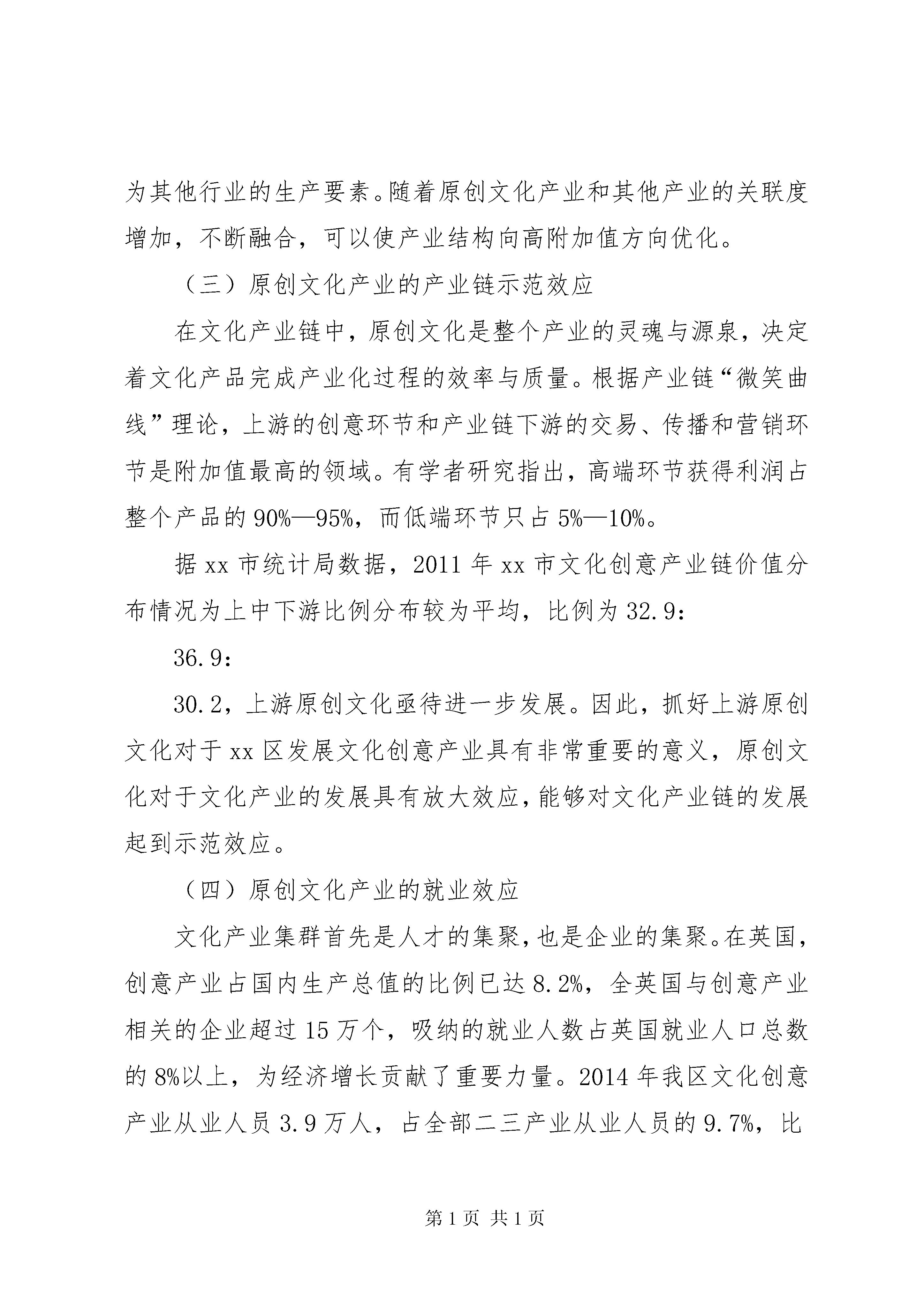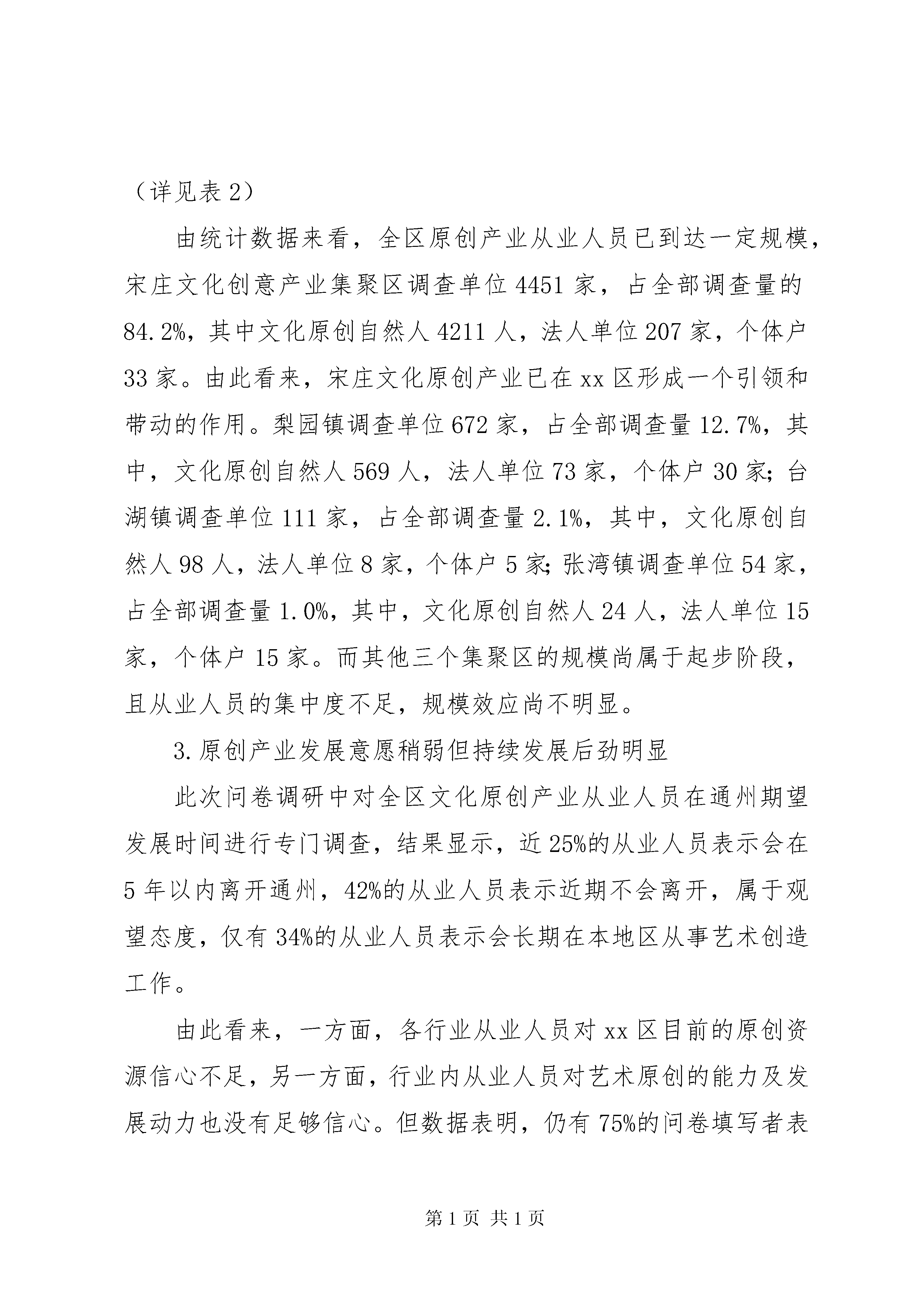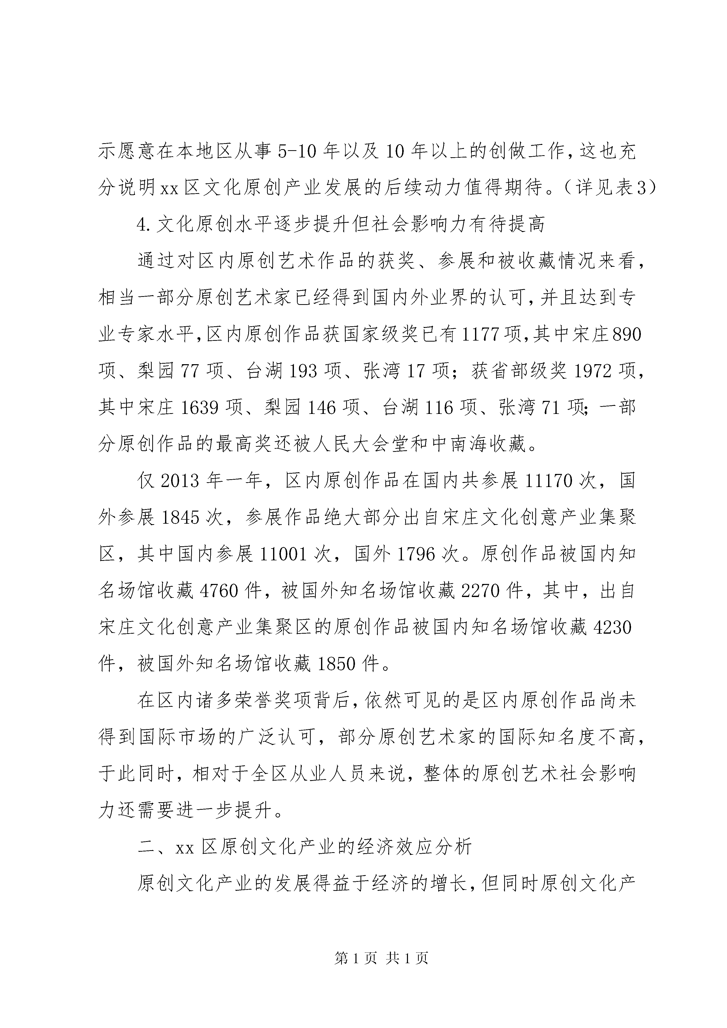 关于区文化原创产业调研报告xx区作为北京城市副中心依托其优越的地缘优势、未来经济发展的广阔前景、重点打造文化创意产业之都的政策支持以及传统文化资源的深厚底蕴吸引诸多原创艺术家及文化原创从业人员集聚通州初步形成了以书法、绘画、音乐制作等各具特色的文化原创人才集聚区域。为了进一步提升xx区文化创意产业创新能力自2013年全国第三次经济普查伊始按照区政府主要领导要求区统计局单独组织力量对全区原创文化产业进行摸底调研并结合2014年底三经普市局队反馈数据结果对我区文化原创产业情况进行了深