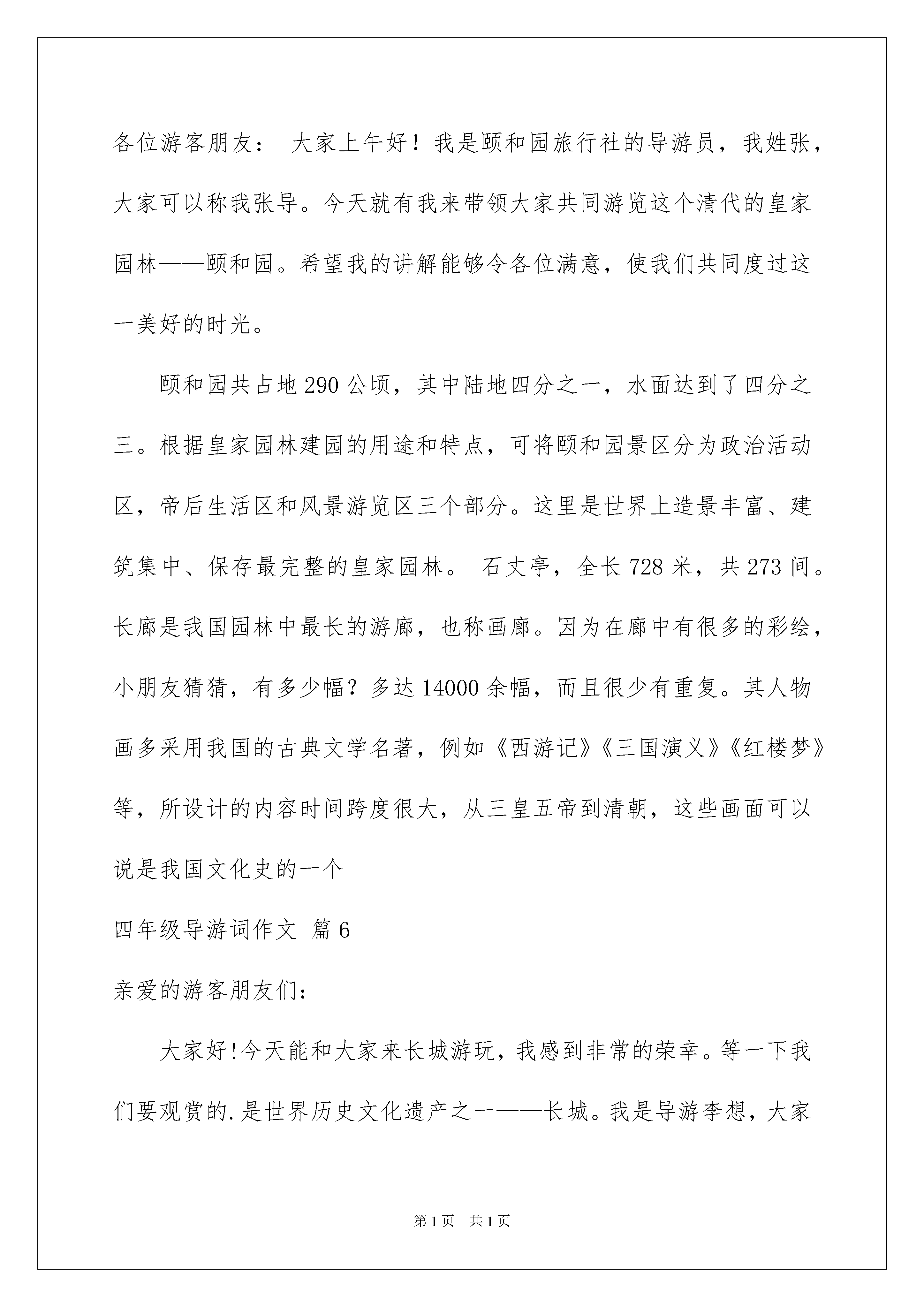 2022关于四年级导游词作文集合6篇关于四年级导游词作文集合6篇作为一位兢兢业业的旅游从业人员就难以避免地要准备导游词导游词是导游员在游览时为口头表达而写的讲解词。我们该怎么去写导游词呢?下面是我收集整理的四年级导游词作文6篇欢迎阅读与收藏。四年级导游