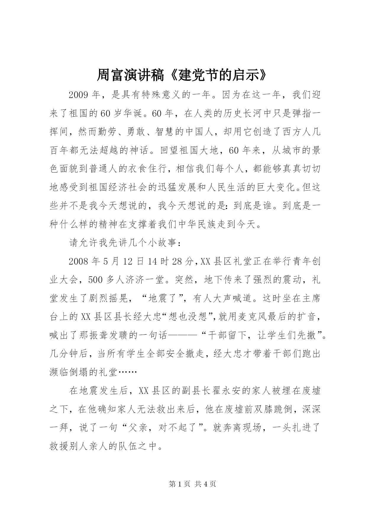 周富演讲稿《建党节的启示》2009年是具有特殊意义的一年。因为在这一年我们迎来了祖国的60岁华诞。60年在人类的历史长河中只是弹指一挥间然而勤劳、勇敢、智慧的中国人却用它创造了西方人几百年都无法超越的神话。回望祖国大地60年来从城市的景色面貌到普通人的衣食住行相信我们每个人都能够真真切切地感受到祖国经济社会的迅猛发展和人民生活的巨大变化。但这些并不是我今天想说的我今天想说的是:到底是谁。到底是一种什么样的精神在支撑着我们中华民族走到今天。请允许我先讲几个小故事:2
