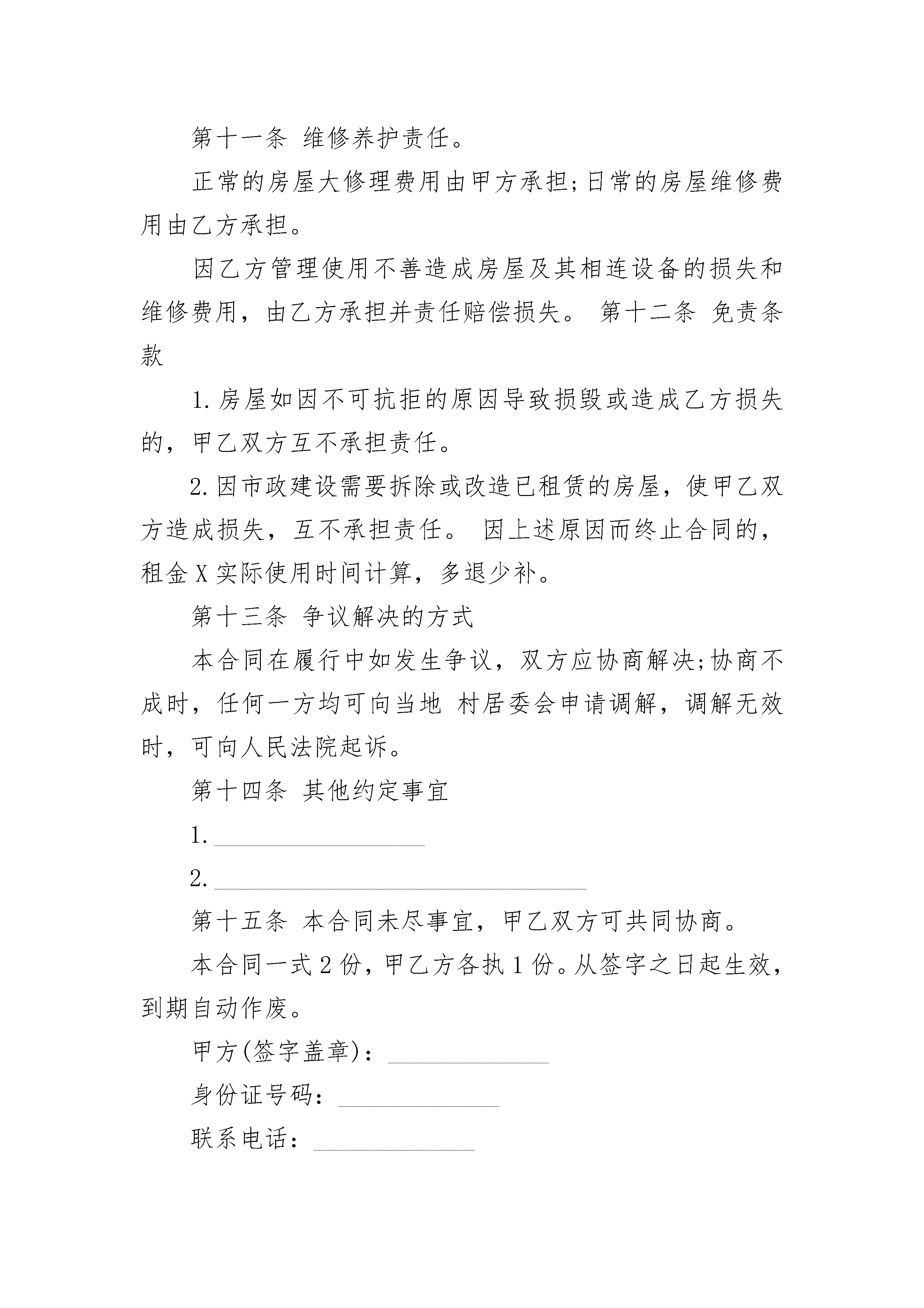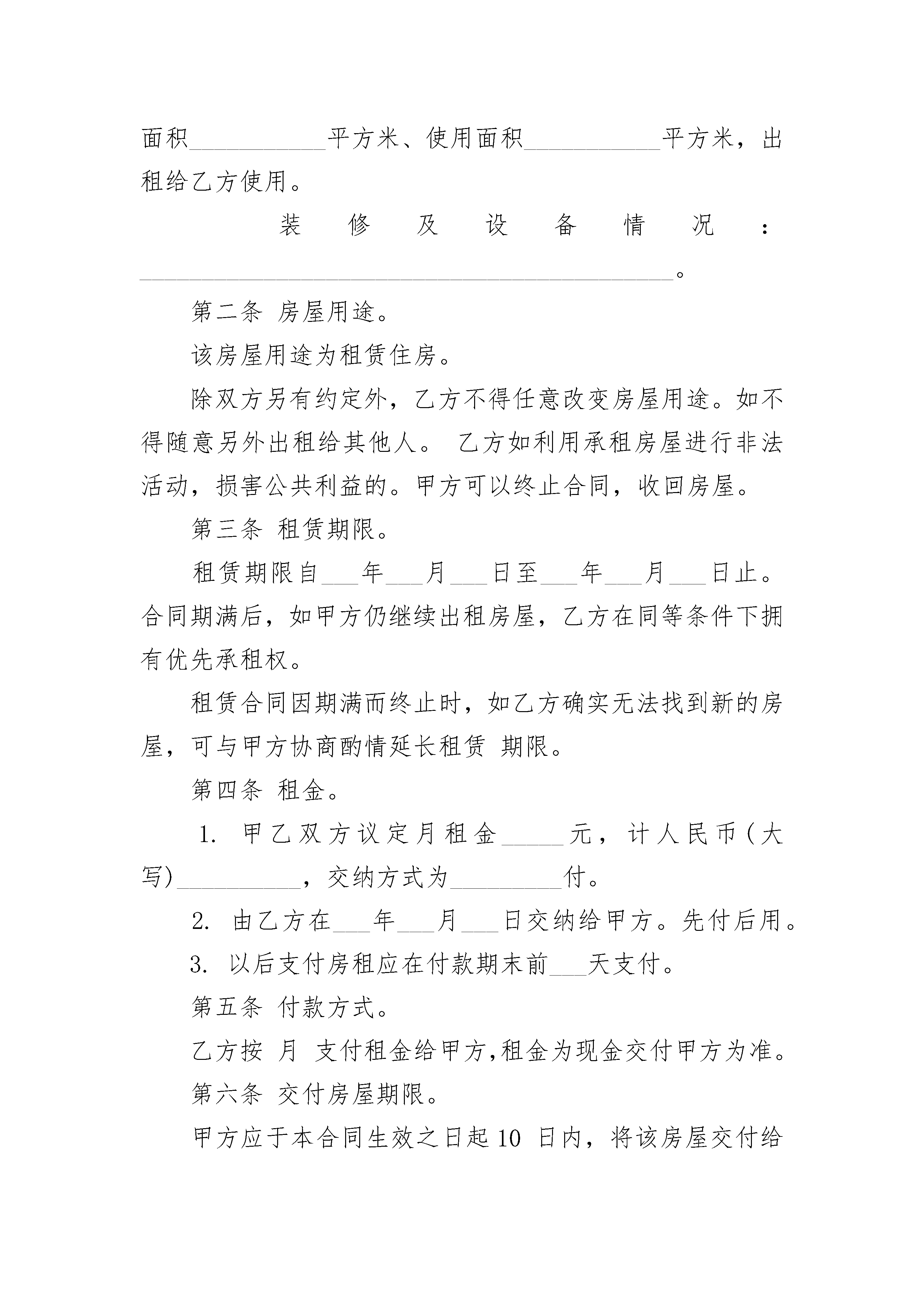 农村房屋出租合同文本出租单位:承租单位:第一条租赁房屋坐落在****,间数***,建筑面积***,房屋质量***.第二条租赁期限从*****年**月**日至****年**月**日。(提示:租赁期限不得超过三年。超过三年的,超过部分无效。)第三条年租金(大写):(每月元/平方)合计租金(大写):第四条租金的支付期限与方式:第五条承租人负责支付出租房屋的水费、电费、煤气费、电话费、光缆电视收视费、卫生费和物业管理费。第六条租赁房屋的用途:第七条租赁房屋的维修:出租人维修的范围、时间及费用负担:承租人维修的范围