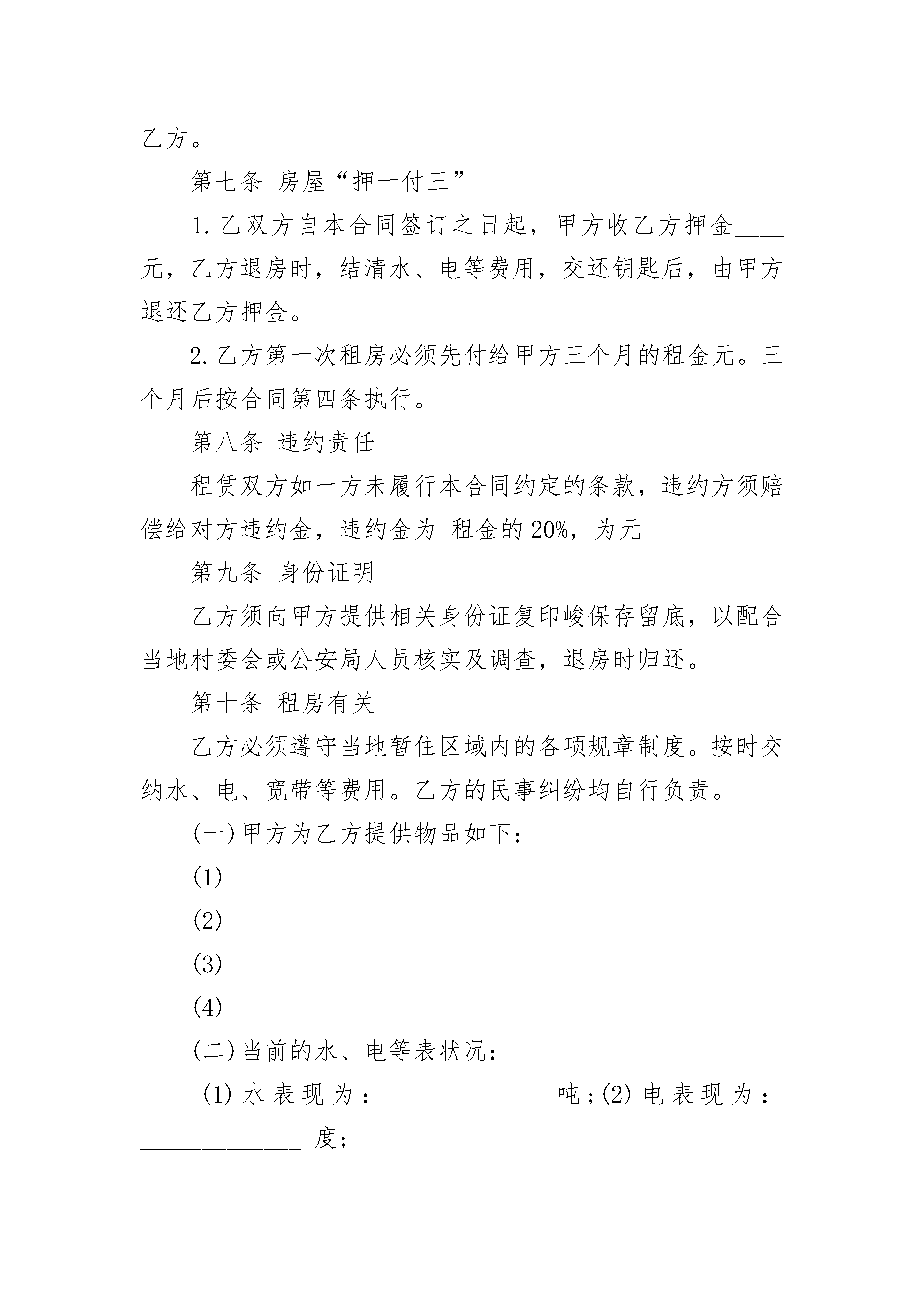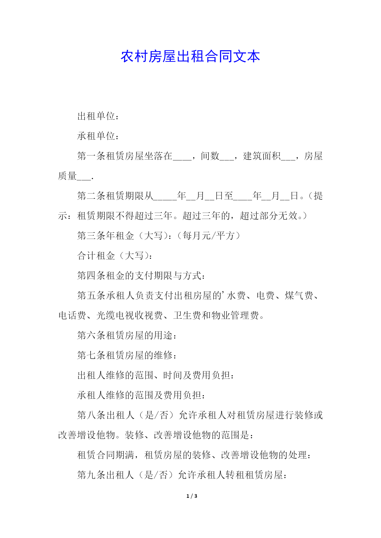 /NUMPAGES3农村房屋出租合同文本出租单位:承租单位:第一条租赁房屋坐落在____,间数___,建筑面积___,房屋质量___.第二条租赁期限从_____年__月__日至____年__月__日。(提示:租赁期限不得超过三年。超过三年的,超过部分无效。)第三条年租金(大写):(每月元/平方)合计租金(大写):第四条租金的支付期限与方式:第五条承租人负责支付出租房屋的'水费、电费、煤气费、电话费、光缆电视收视费、卫生费和物业管理费。第六条租赁房屋的用途:第七条租赁房屋的维修:出租人