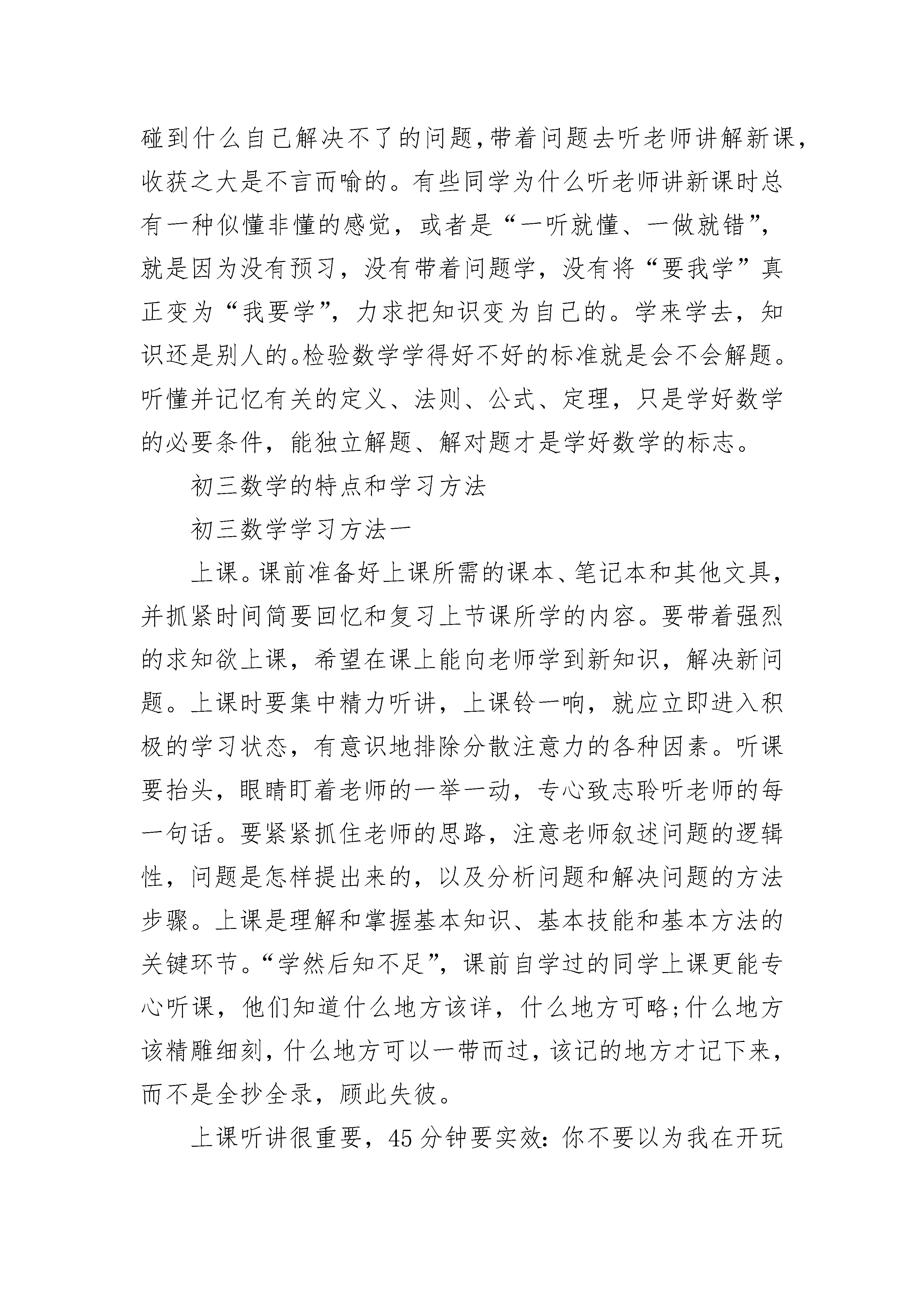 数学的学习方法与技巧○1课前认真预习.预习的目的是为了能更好得听老师讲课,通过预习,掌握度要达到百分之八十.带着预习中不明白的问题去听老师讲课,来解答这类的问题.预习还可以使听课的整体效率提高.具体的预习方法:将书上的题目做完,画出知识点,整个过程大约持续15-20分钟.在时间允许的情况下,还可以将练习册做完.○2让数学课学与练结合.在数学课上,光听是没用的.当老师让同学去黑板上演算时,自己也要在草稿纸上练.如果遇到不懂的难题,一定要提出来,不能不求甚解.否则考试遇到类似的题目就可能不会做.听老师讲课时一