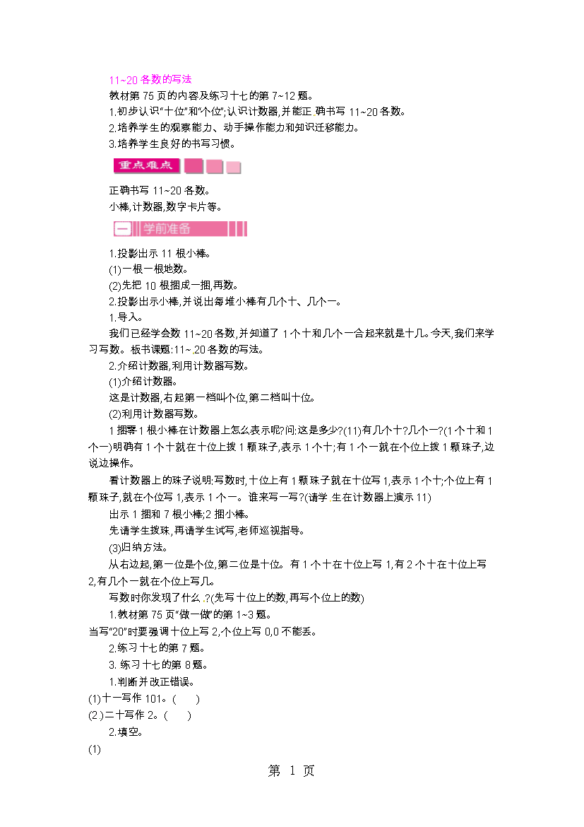 人教版数学一年级上册教案~20各数的写法教学目标:.知识目标:使学生初步认识十位和个位;认识计数器,并能够正确地写出~20各数。2.能力目标:培养学生的观察能力,动手操作能力和迁移类推能力。3.情感目标:培养学生良好的书写习惯和积极主动学习的精神。教学重点:正确地书写~20各数。教学难点:理解数位概念。教学准备:教学课件,学生学具盒。教学过程:一、复习导入。.拍手数20以内的数从数到20。(2)从20数到。2.数一数我们班有多少个女同学(刚好20个)3.读出下列各数并说出它的组成。、3、8、20分别出示数