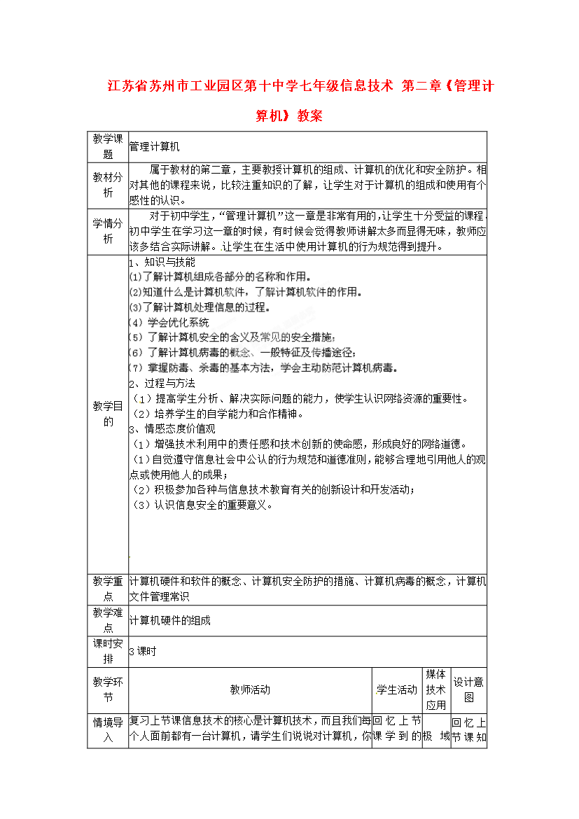 江苏省苏州市工业园区第十中学七年级信息技术第二章《管理计算机》教案教学课题管理计算机教材分析属于教材的第二章主要教授计算机的组成、计算机的优化和安全防护。相对其他的课程来说比较注重知识的了解让学生对于计算机的组成和使用有个感性的认识。学情分析对于初中学生“管理计算机”这一章是非常有用的让学生十分受益的课程。初中学生在学习这一章的时候有时候会觉得教师讲解太多而显得无味教师应该多结合实际讲解。让学生在生活中使用计算机的行为规范得到提升。教学目的1、知识与技能2、过程与方法(1)提高学生分析、解决实际问题的能