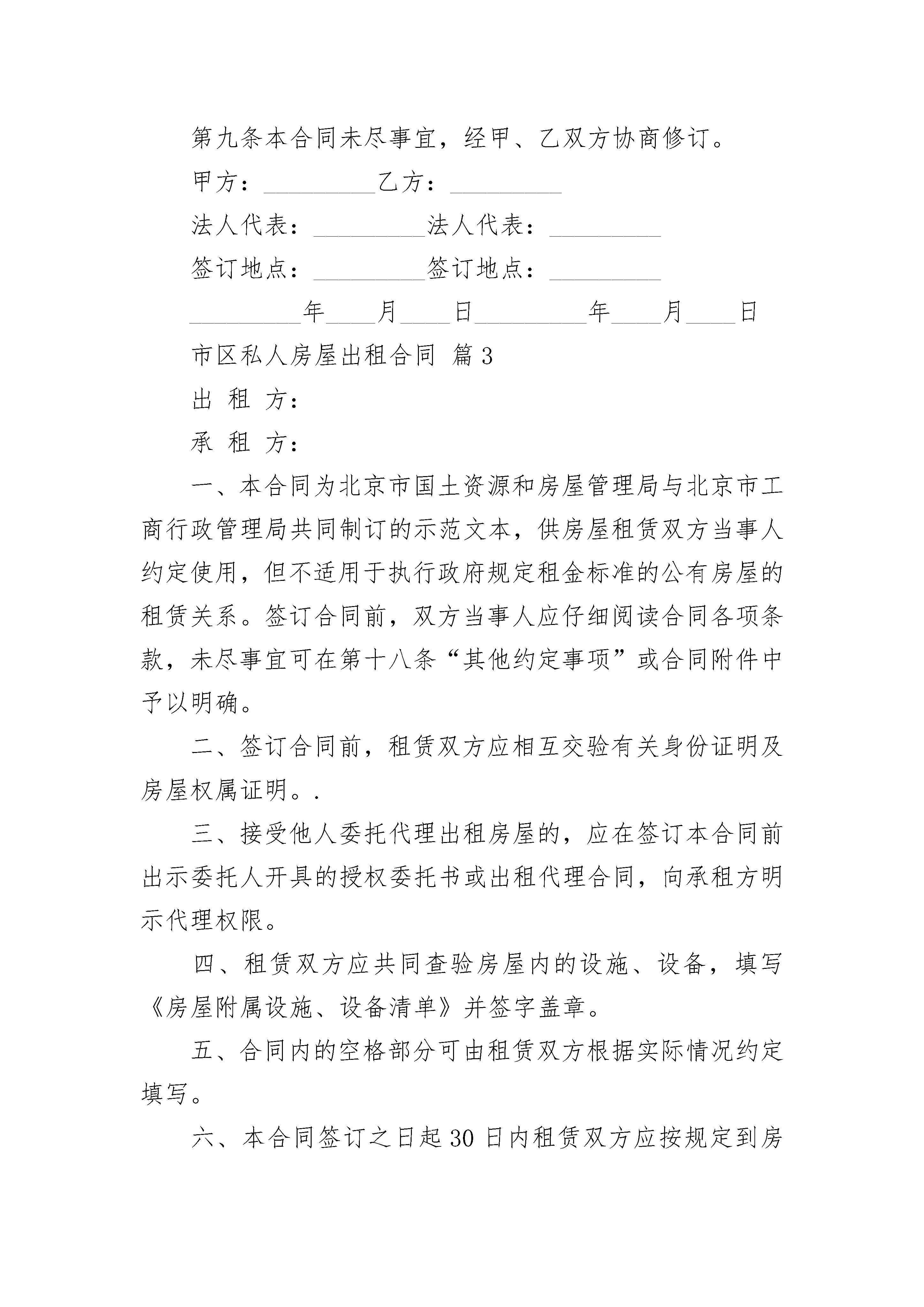 市区私人房屋出租的合同市区私人房屋出租的合同(精选29篇)市区私人房屋出租的合同篇1出租方:______承租方:______为维护双方的合法权益,甲、乙双方本着平等、自愿、协商一致的原则,就租赁房屋一事达成以下协议。第一条甲方将__________出租给乙方。建筑面积_____平方米,租金_____元/月。第二条租赁期限为___年___月,从___年___月___日起至___年___月___日止。甲方应按照合同规定时间和标准,将出租的房屋及时交给乙方使用。第三条付款方式为__付一次。在本合同正式生效当日内