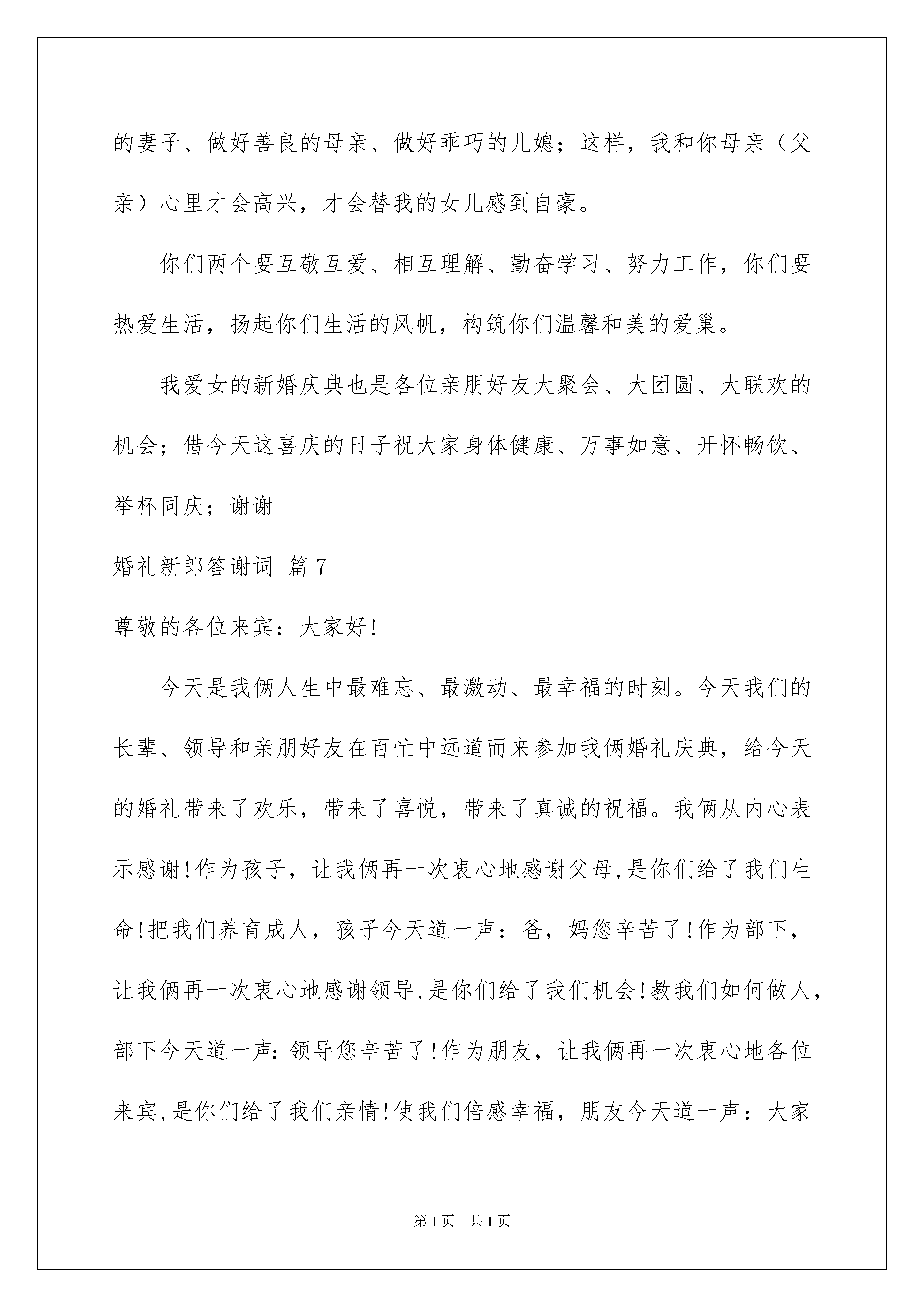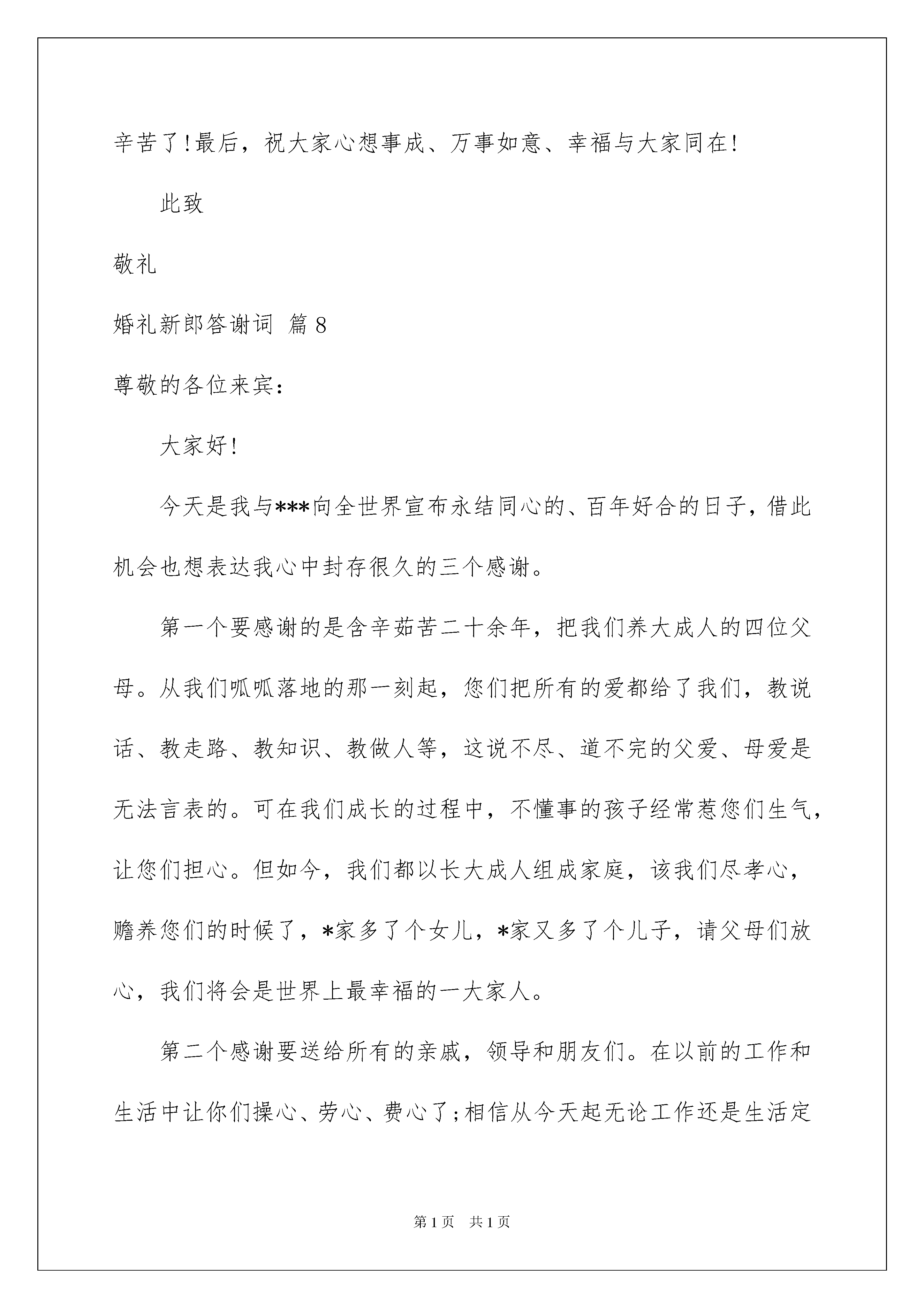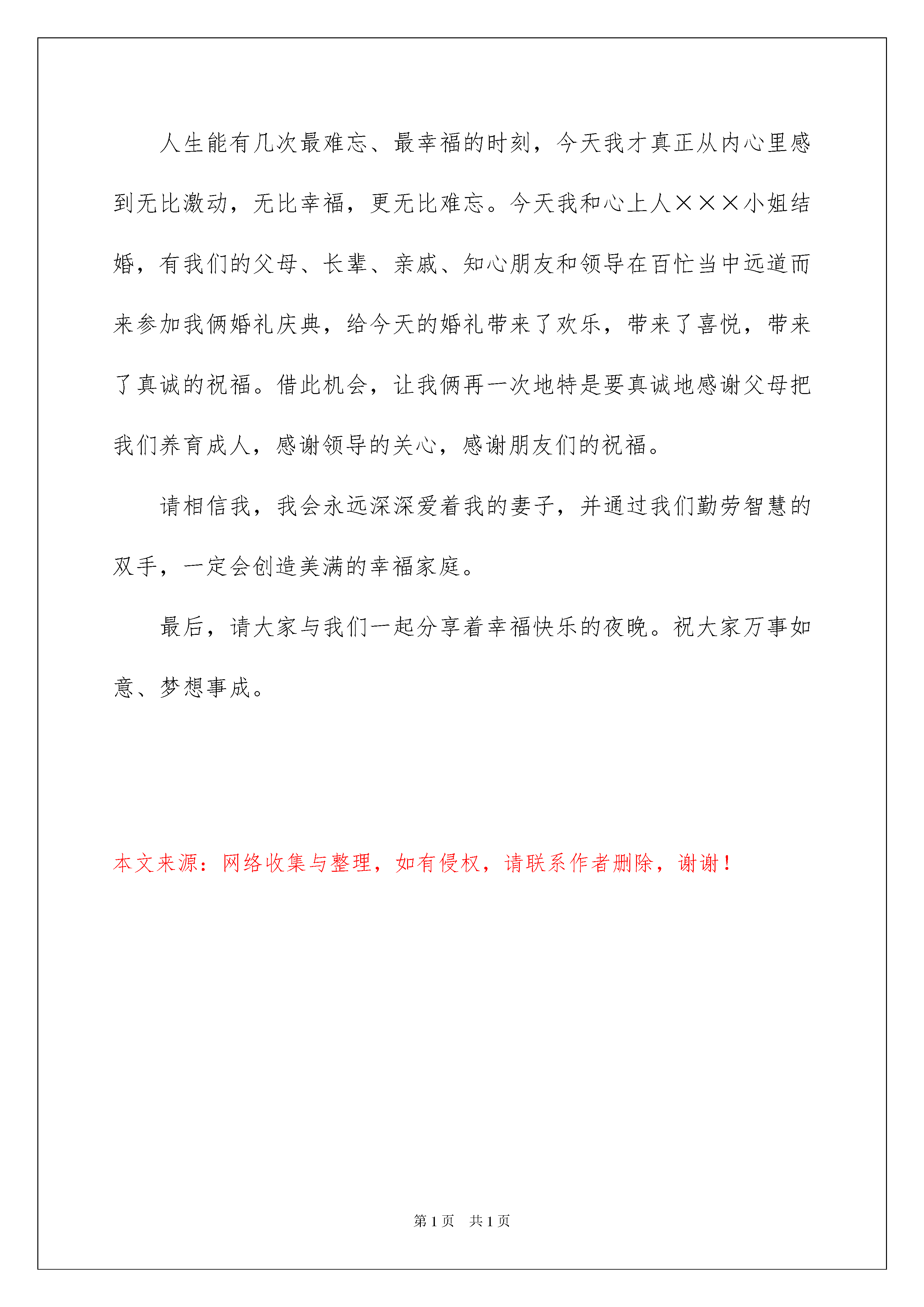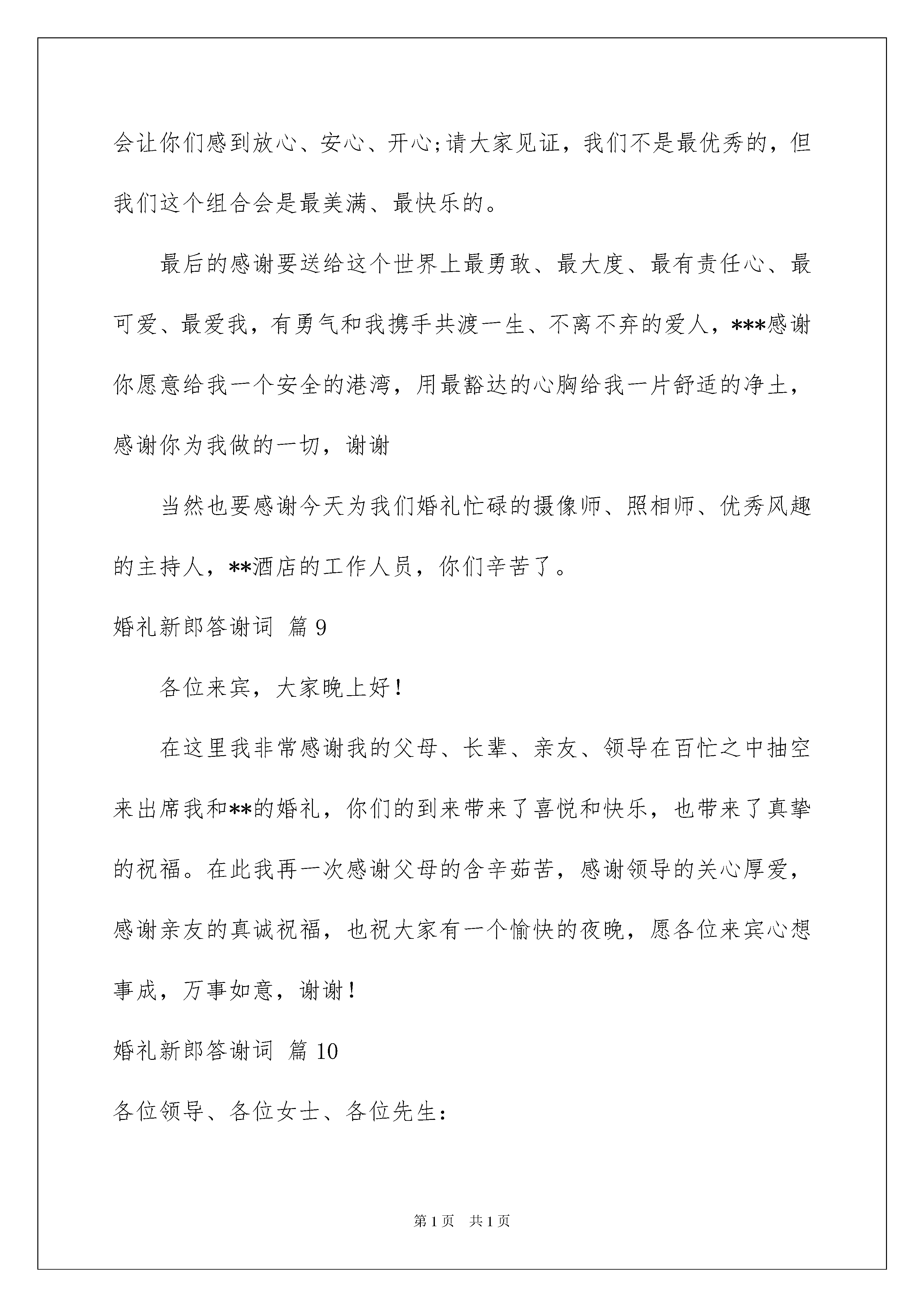 2022关于婚礼新郎答谢词10篇关于婚礼新郎答谢词10篇随着感恩思想的积极提倡,很多地方都会使用到答谢词,我们在写答谢词的时候内容与结构要合乎规范。千万不要把答谢词写成流水账喔!下面是我整理的婚礼新郎答谢词10篇,欢迎大家借鉴与参考,希望对大家有所帮助。婚礼新郎答谢词篇1各位来宾,大家中午好:首先真挚的感谢在座的各位,百忙之中出席婚礼,见证我们的这份爱情。更要感谢双方父母对我们的支持、关爱和祝福。常州与甘泉距离1千多公里,我和____的爱情真可谓是穿越了千山万水。今天,我们终于结婚了。虽然由于工作和路途原因,我的亲友没有能参加我们的婚礼。但是我并没有感到失望和孤单。因为从今天开始,在座的各位来宾都成为了我的亲友。在此,我要特别的感谢我的爸爸妈妈对我的培养和关爱,我相信此时刻,他们一定能感受到我们的幸福和快乐。借此机会,我想对他们说,爸爸妈妈,请放心。你们的女儿找到了一个美好的归宿,我相信____会是一个优秀的丈夫,我们一定会相亲相爱,白头偕老。最后,再此感谢大家的出席,祝大家身体健康,新年快乐!婚礼新郎答谢词篇2各位来宾、各位朋友、女士们、先生们:大家好!今天是明晖先生和汤冬英女士结婚的大喜日子,我感到非常高兴和荣幸。高兴的是这对新人今天携手共同走进了他们婚礼的殿堂,开始了他们新的人生。荣幸的是有那么多的亲朋好友和父老乡亲送来了他们真挚的祝福。在此,我谨代表新郎父母明平礼先生、盛广英女士向这对新人表示衷心的祝福,同时,我也借这个机会,向多年来关心、支持、培养明晖先生和汤冬英女士的各位领导、各位同事、各位朋友表示最衷心的感谢!结婚是人生的`大事,也是每个为人父母的大事。面对台上这对珠联璧合、佳偶天成的新人,面对台下这么多喜笑颜开的亲朋好友,我要送三句话给这对新人,一、希望你们相互理解,相互信任,相互包涵,在人生道路上同舟共济;二、值此美好的日子,你们不能忘却了给予你们无限呵护的父母亲,要把对父母的感恩之情化为实际的行动,孝敬和侍奉双方的父母颐养天年。你们结婚了,意味着你们的父母年岁已高,他们需要你们常回家看看;三、你们要不断进取,勤奋工作,要用实际行动来回报社会、回报父母。最后,让我们默默祈祷!让我们深情祝福!祝福这对新人生活幸福、互敬互爱,并且衷心祝福前来参加婚礼的各位来宾身体健康、事业发达、家庭幸福、春节快乐!谢谢大家!婚礼新郎答谢词篇3诸位亲朋:当我手拿着捧花,扣响我媳妇家的大门时,内心的世界无法用言语表达,我的兄弟们尽力的帮我操心其他琐碎的事情。我很是感谢他们愿意前来帮忙,给我带来很多的快乐。在和伴娘的交涉中,幸亏我的伴郎帮我对待他们。在接媳妇的时候,他们陪着我做了好多看似好玩的惩罚,虽然不是很规范,但是都达成了目标。最后,我向各位宾客表示谢意,向我的伴郎兄弟表示敬意,没有你们,我不可能这么快的接到新媳妇。婚礼新郎答谢词篇4尊敬的各位领导、亲爱的各位同事、亲戚、朋友们:大家好!非常感激大家来参加我和她的新婚答谢宴!我经过十九年的寒窗苦读,我于20xx年来到这里工作。在大学读研究生期间,我认识了我的妻子。我们俩共同经历了浪漫的校园爱情,共同经历了找工作的艰苦,现在我们在构筑了我们的小家庭。在这里,我们的亲戚朋友不多。我们之所以能有今天的幸福生活,与领导们、同事们、亲戚朋友们的关心和帮助是分不开的!我不断是怀揣着一颗感恩的心在工作和生活。在此,我对所有关心我们帮助我们的领导、同事、亲戚朋友们表示衷心的感激!今后我俩一定孝顺父母、快乐生活,构造一个美满和谐的家庭,我们也一定一如既往的努力工作,用实际行动来回报大家对我们的关心。最后再次感激大家光临我们的婚宴!谢谢大家!婚礼新郎答谢词篇5诸位嘉宾:今日大雪纷飞,凛冽的寒风刮着路边的落叶。刚呼出的气息变成了白气,冻得人的手臂无处躲藏。这样一个恶劣的环境,大家不畏严寒的前来贺喜,我很是感动。对我来说,更为打动我心灵的人是我的新娘,在这么冷的天,还要穿着漂亮的婚纱,虽然穿着保暖衣,但还是无法抵御寒风的袭击。你被冻得脸色通红,但还是强忍着坚持到婚礼的结束。最后,我向我的新娘子保证,今后肯定不会负了你,要一直宠着你,不让你后悔这辈子嫁给了我。婚礼新郎答谢词篇6各位来宾:大家中午好!在这个祥和、喜庆的日子里,迎来了我爱女和我爱婿的新婚庆典。此时此刻,我的心情是无比的激动、心情是格外的喜悦。我代表我们全家向各位亲朋好友表示衷心的感谢!感谢你们从百忙之中来参加我爱女的新婚庆典,再一次的感谢你们,谢谢!“责任”这个名词是神圣的,是伟大的;我和你母亲在今天已完成了我们自己的责任。我爱女是我的掌上明珠,我非常疼爱我的女儿;但是,成家了就是大人了,