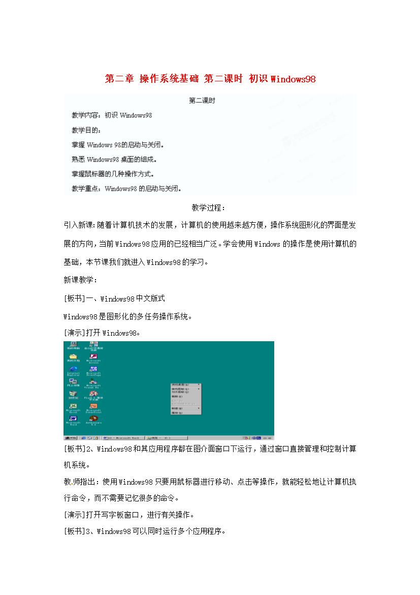 第二章操作系统基础第二课时初识Windows98教学过程:引入新课:随着计算机技术的发展,计算机的使用越来越方便,操作系统图形化的界面是发展的方向,当前Windows98应用的已经相当广泛。学会使用Windows的操作是使用计算机的基础,本节课我们就进入Windows98的学习。新课教学:[板书]一、Windows98中文版式Windows98是图形化的多任务操作系统。[演示]打开Windows98。[板书]2、Windows98和其应用程序都在图介面窗口下运行,通过窗口直接管理和控制计算机系统。教师指出