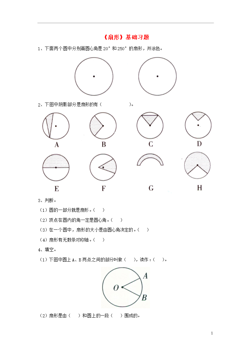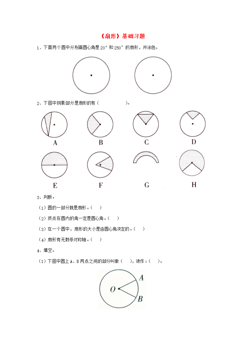 2《扇形》基础习题1、下面两个圆中分别画圆心角是20°和250°的扇形,并涂色。2、下图中阴影部分是扇形的有()。3、判断。(1)圆的一部分就是扇形。()(2)顶点在圆内的角一定是圆心角。()(3)在一个圆中,扇形的大小是由圆心角决定的。()(4)扇形有无数条对称轴。()4、填空。(1)下图中圆上A、B两点之间的部分叫做(),读作:()。(2)扇形是由()和圆上的一段()围成的。(3)扇形都有一个角,角的顶点在(),两条半径组成的角叫做()。(4)扇形是()图