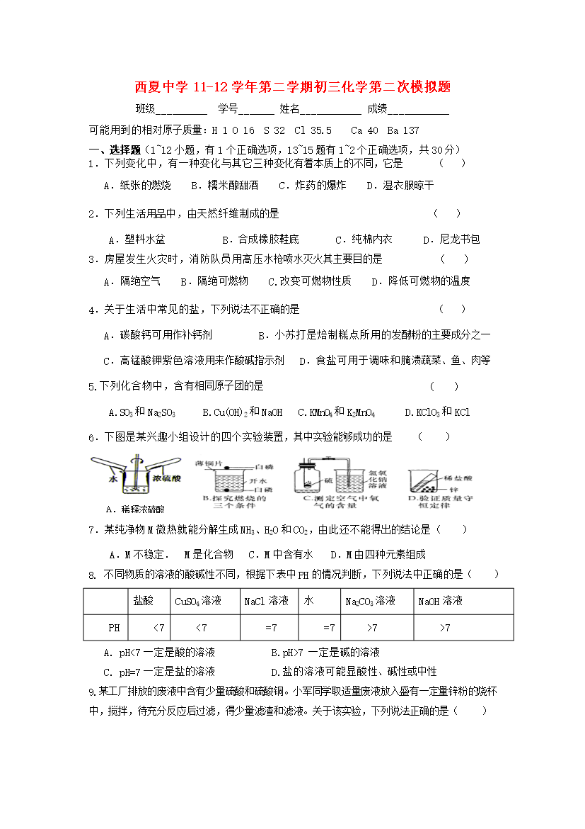 西夏中学11-12学年第二学期初三化学第二次模拟题班级__________学号_______姓名____________成绩____________可能用到的相对原子质量:H1O16S32Cl35.5Ca40Ba137一、选择题(1~12小题,有1个正确选项,13~15题有1~2个正确选项,共30分)1.下列变化中,有一种变化与其它三种变化有着本质上的不同,它是()A.纸张的燃烧B.糯米酿甜酒C.炸药的爆炸D.湿衣服晾干2.下列生活用品中,由天然纤维制成的是()A.塑料水盆B.合成橡胶鞋底C.纯棉内衣D.