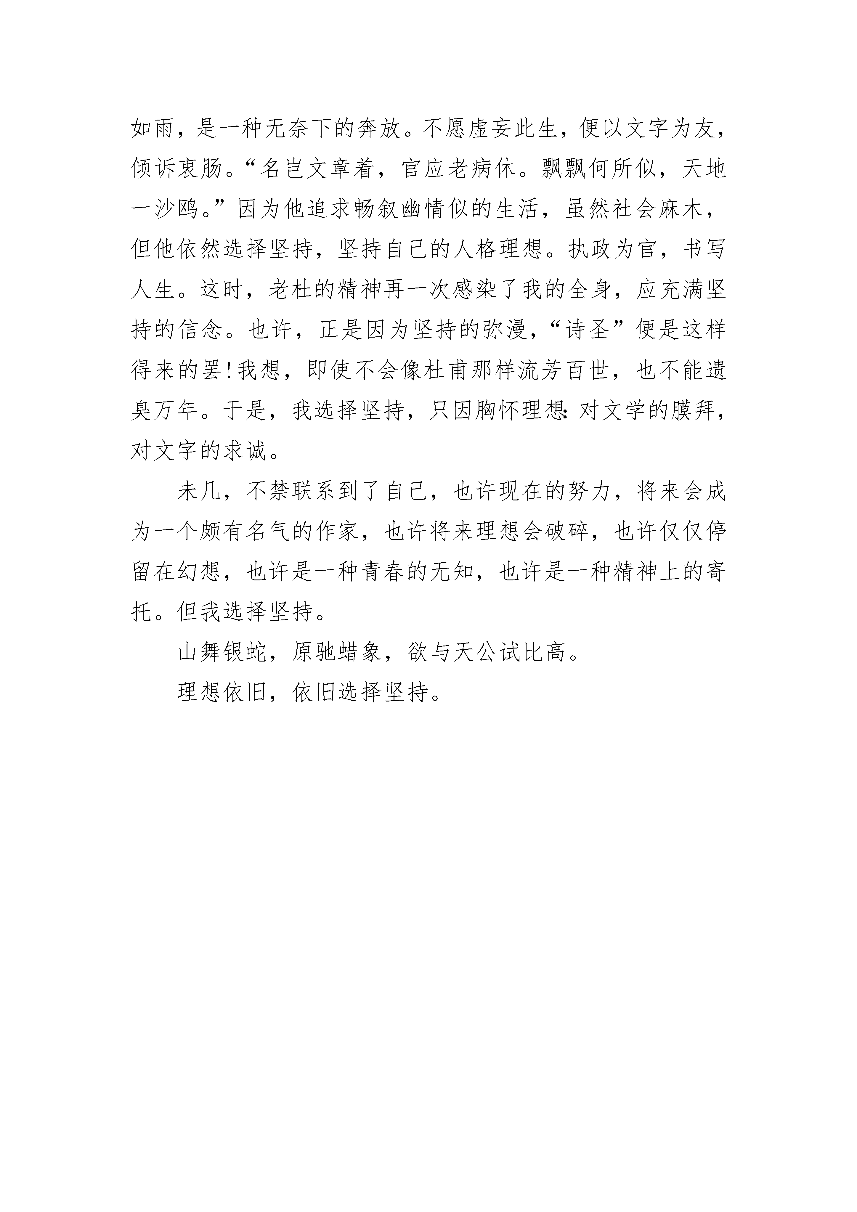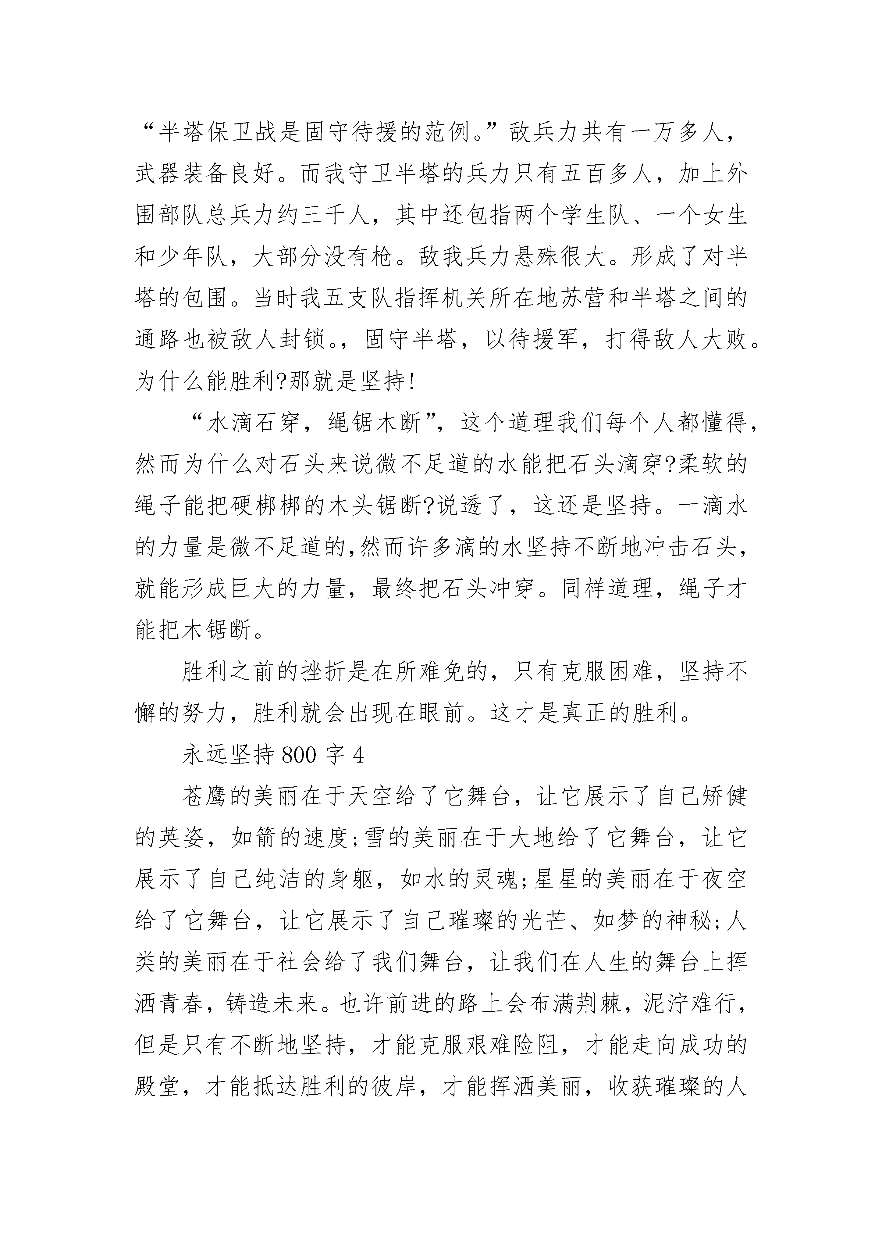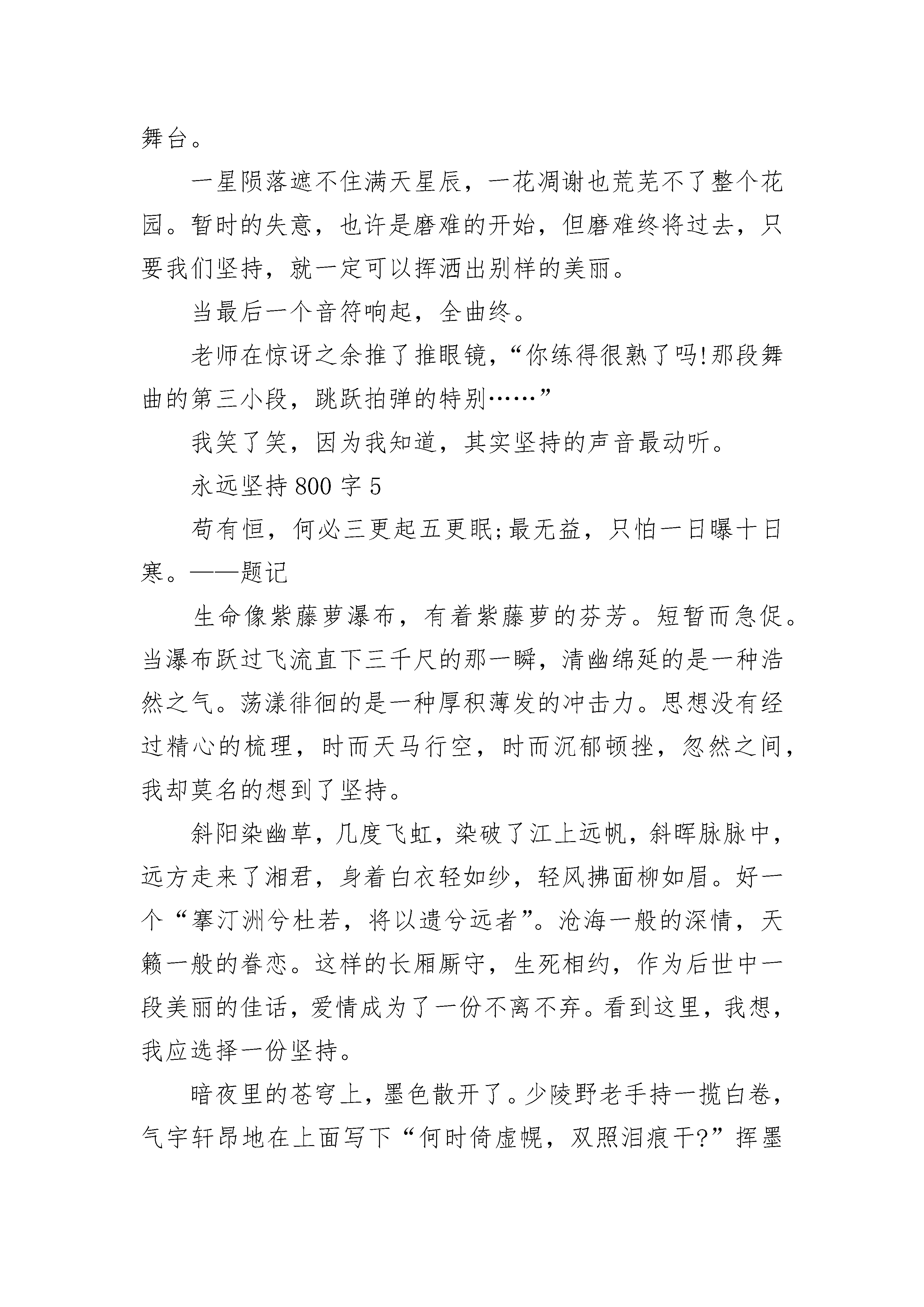 永远坚持800字优秀作文5篇或许,他永远被人瞧不起;或许,他天生的缺陷让他自卑;或许,他为了自己和正常人一样行走,付出了全部。但是我要告诉你,无论如何,他的身上有着一份可贵的精神。我并不喜欢,因为这种让自己伤痕累累、累到不行。直到我看见了他,我才改变了我的想法。那天我从病房里出来。看见一个大哥哥在走廊上,样子是在学习走路。旁边的护士偷偷的告诉我,他的了小儿麻痹症,非要脱去双拐走路,讲什么也不听。我暗想:这个估计是他的梦想吧,他一定不会坚持下去,毕竟摔一跤是很痛的,这样做只会受伤。我走上去一点,躲在一边,慢