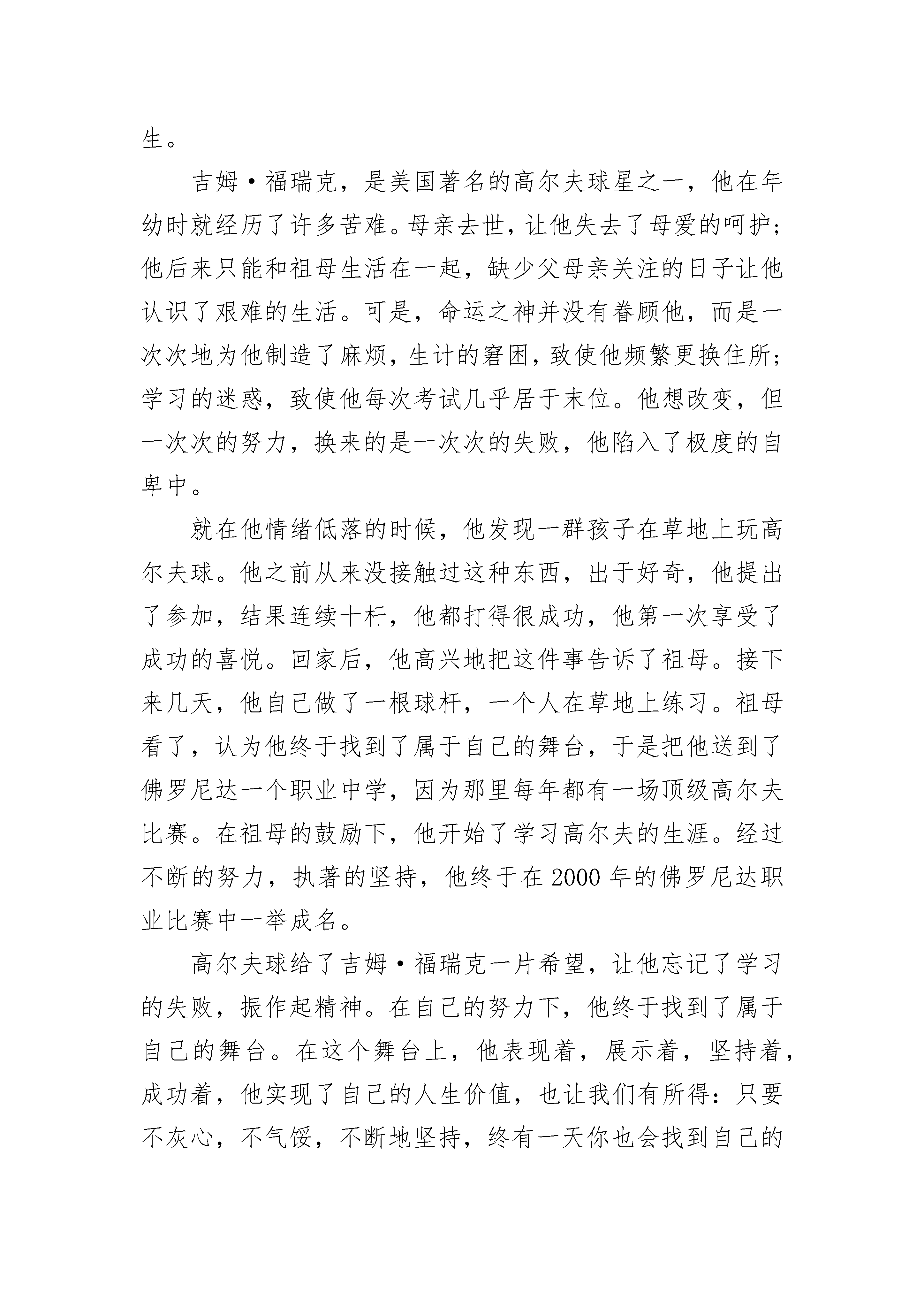 永远坚持800字优秀作文5篇或许,他永远被人瞧不起;或许,他天生的缺陷让他自卑;或许,他为了自己和正常人一样行走,付出了全部。但是我要告诉你,无论如何,他的身上有着一份可贵的精神。我并不喜欢,因为这种让自己伤痕累累、累到不行。直到我看见了他,我才改变了我的想法。那天我从病房里出来。看见一个大哥哥在走廊上,样子是在学习走路。旁边的护士偷偷的告诉我,他的了小儿麻痹症,非要脱去双拐走路,讲什么也不听。我暗想:这个估计是他的梦想吧,他一定不会坚持下去,毕竟摔一跤是很痛的,这样做只会受伤。我走上去一点,躲在一边