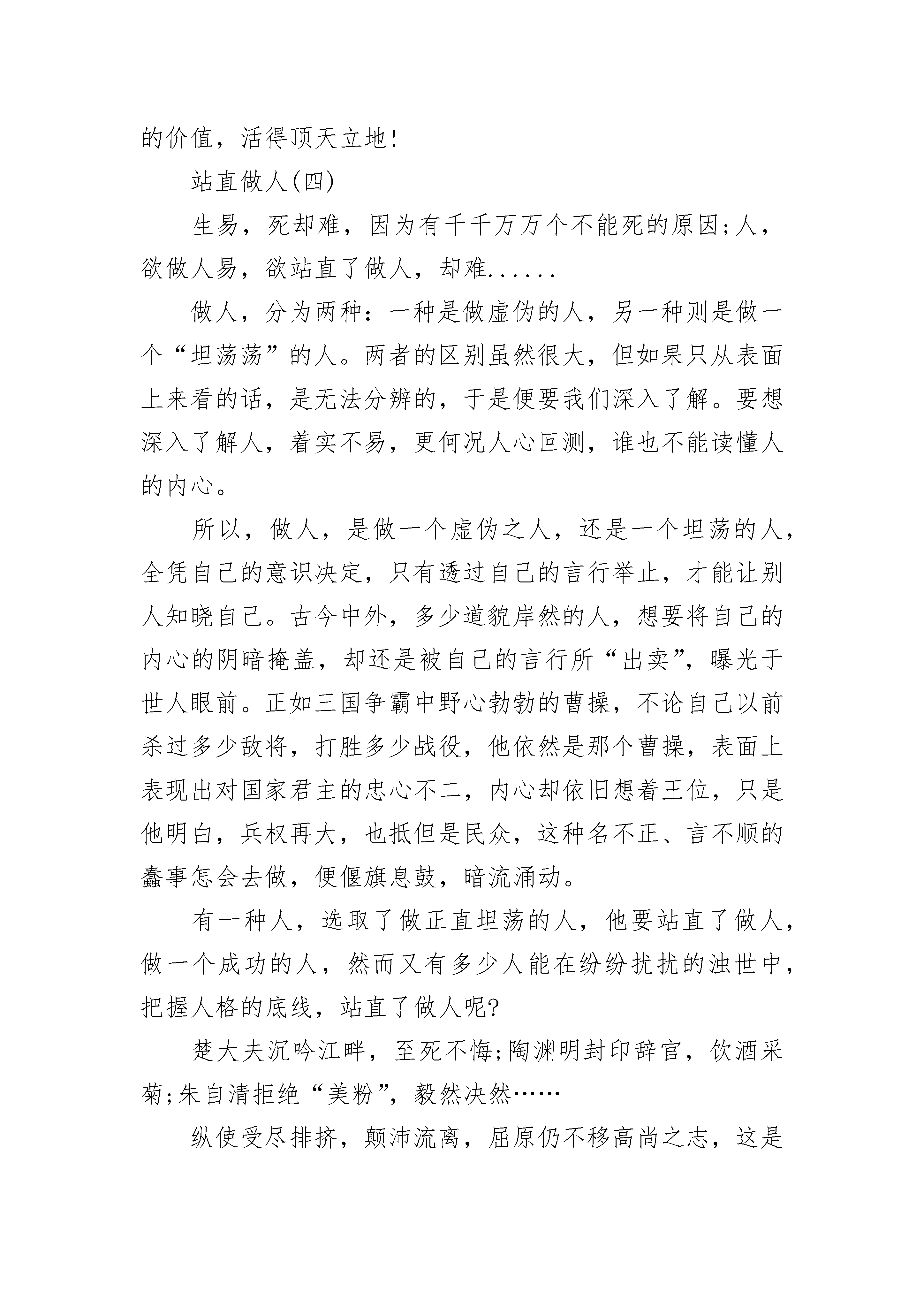 站直做人作文初中范文5篇竹,挺拔秀直,昂首屹立,是自古高风亮节的象征,在佛法中显示有清静、清凉之意,而竹的形象恰恰是中国古代人站直了做人的最好体现了。站直了做人,其实很难!站直了做人,首先你要志坚,志坚才会气坚。文王拘而演《周易》;仲尼厄而作《春秋》;屈原放逐,乃赋《离骚》;左丘失明,厥有《国语》;孙子膑脚,《兵法》修列;不韦迁蜀,世传《吕览》;韩非囚秦,《说难》、《孤愤》。没有经历过无数的挫折的磨难,就无法构成坚定的志气,无法取得辉煌的成就!站直了做人,不仅仅仅是体此刻我们的形体之上,更体此刻内心之