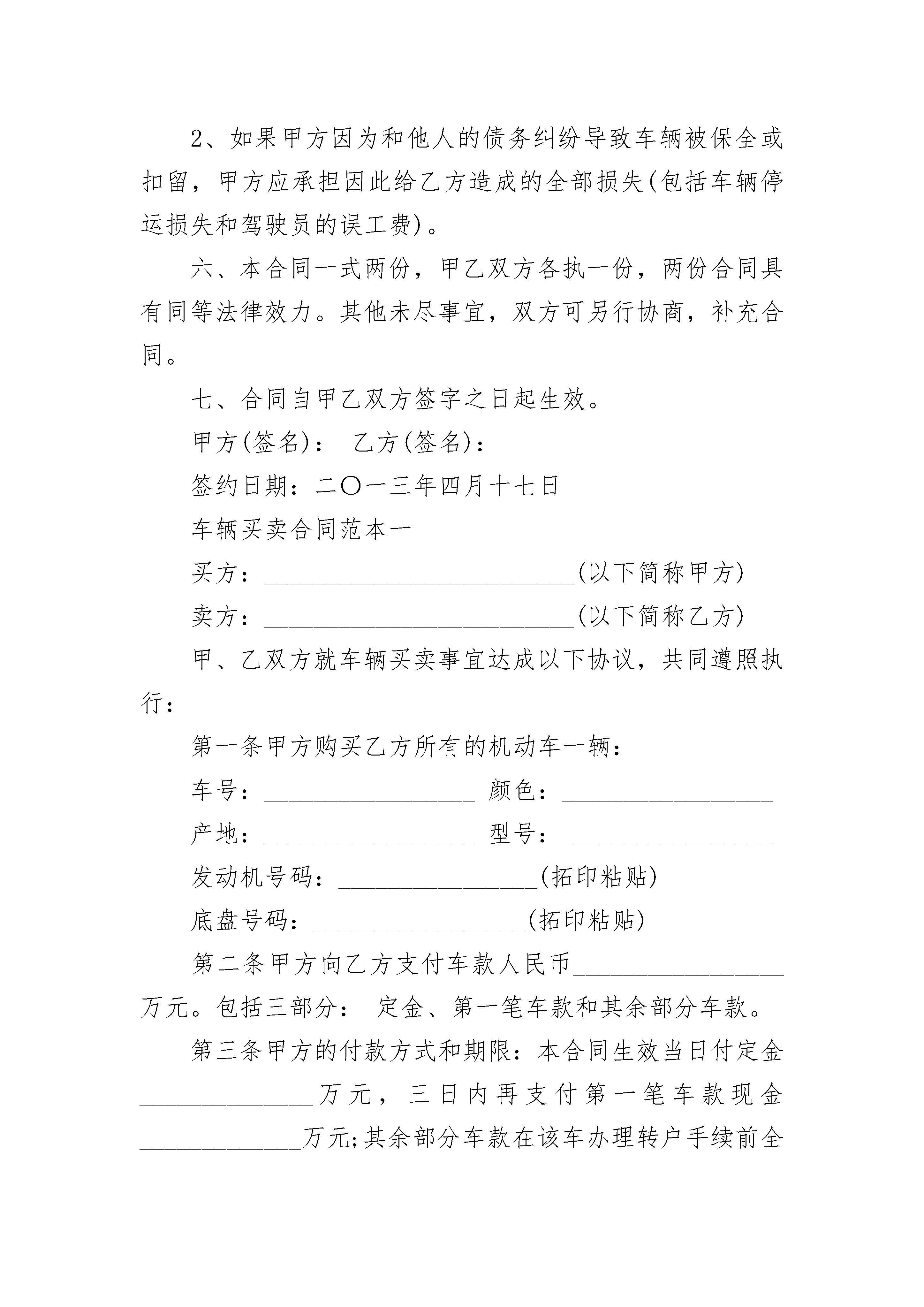 车辆没过户有买卖合同车辆没过户有买卖合同1甲方(卖方):乙方(买方):现经甲、乙双方平等充分协商,就甲方有偿转让乙方车一辆给乙方有关事宜达成如下合同,以资共同遵守。一、甲方自愿将车有偿转让给乙方,承诺转让前车辆的产权属于卖方,内容真实,无产权纠纷。发动机号:车架号:二、有偿转让价款为:_______¥_______元,大写:_______人民币整。签订合同后立即付清。三、此车自____年___月___日时分以前与本车发生的.交通违章、安全等有关事情及问题由甲方负责。四、此车自____年___月___日时分