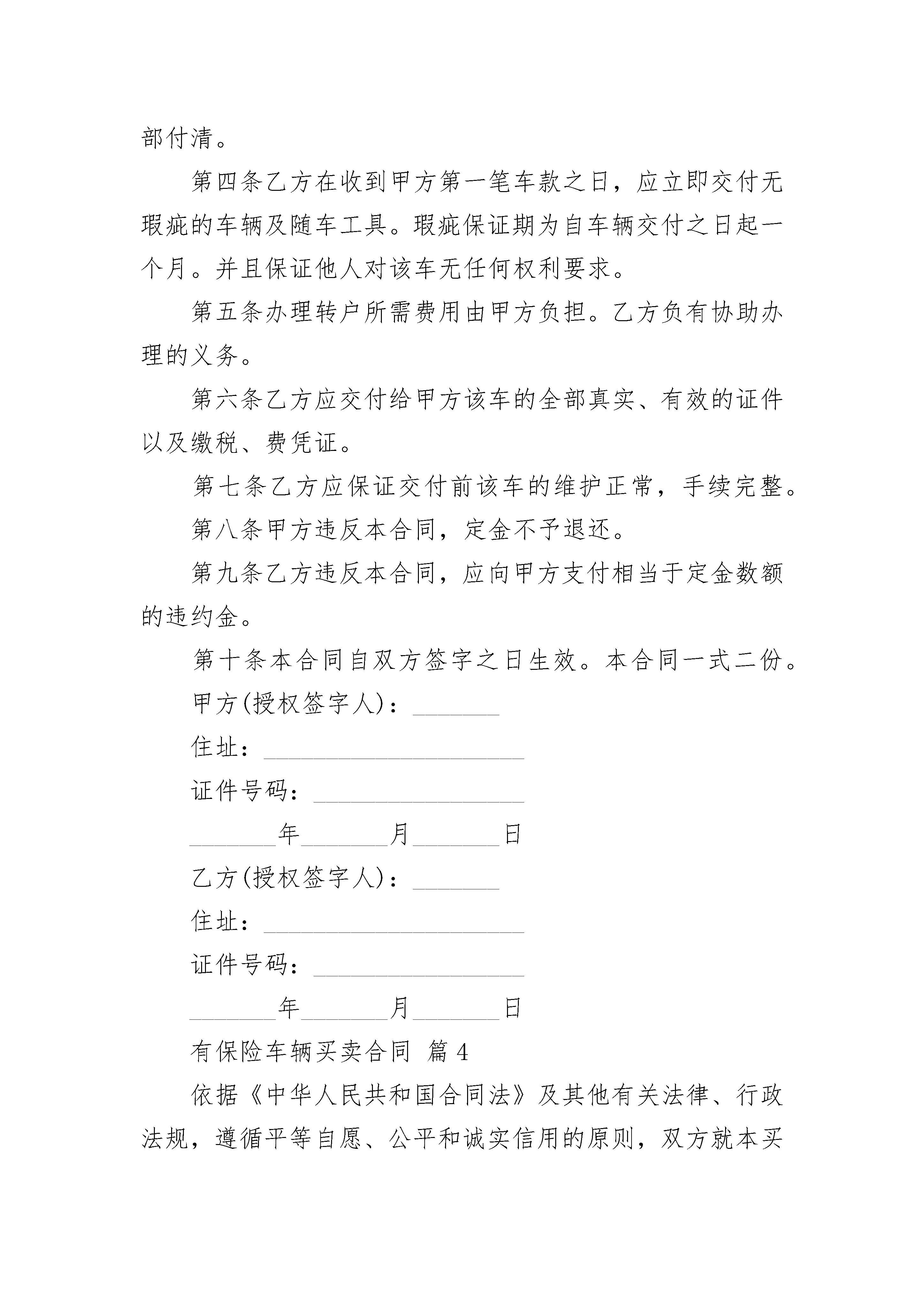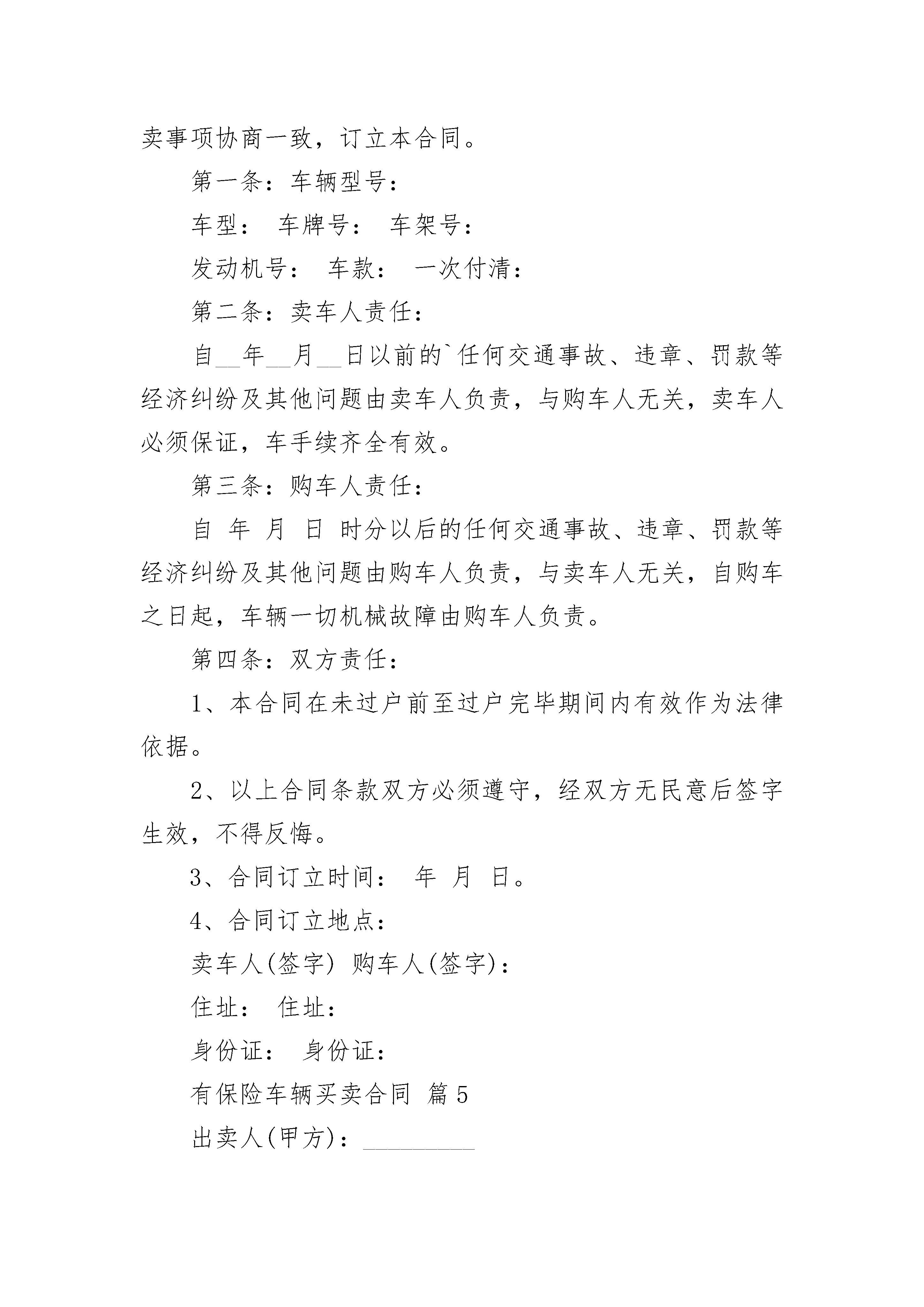 有保险车辆买卖合同有保险车辆买卖合同(精选21篇)有保险车辆买卖合同篇1售车方(甲方):身份证号:购车方(乙方):身份证号:经双方友好协商,奉行诚实、平等、公平的原则,甲方现将转让于乙方,,该车车牌号为:,发动机号码为:,车架号码为:,里程表数为:,交车地点:。本合同自双方签定后即时生效,具有同等法律效力。现订立该汽车转让合同如下:第一条a;汽车质量:该车于________年____月登记,检验合格期至年法院查封,不是银行按揭,没有未处理的交通事故,违章,债务,发动机号码及车架号码能与车辆管理所档案号