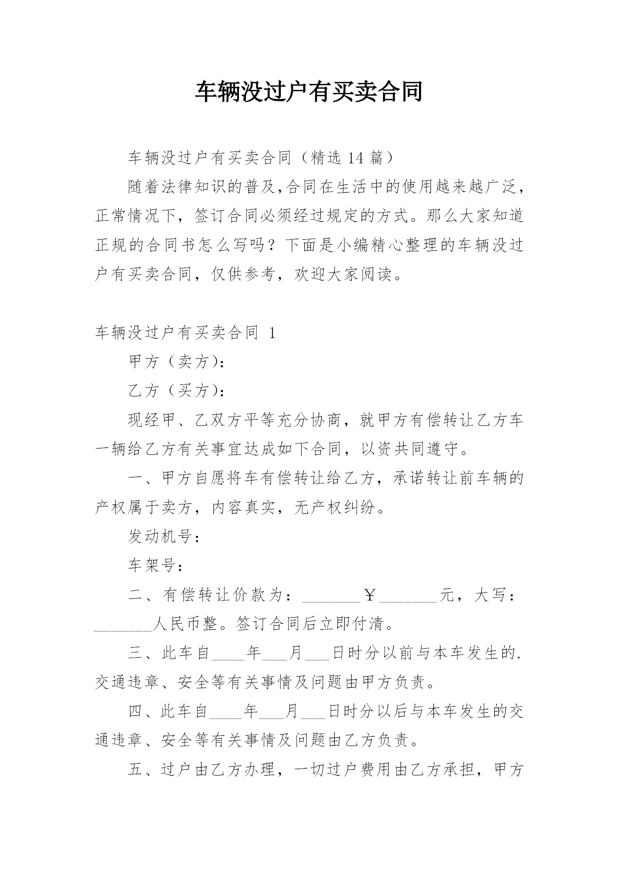 车辆没过户有买卖合同车辆没过户有买卖合同(精选14篇)随着法律知识的普及,合同在生活中的使用越来越广泛,正常情况下,签订合同必须经过规定的方式。那么大家知道正规的合同书怎么写吗?下面是小编精心整理的车辆没过户有买卖合同,仅供参考,欢迎大家阅读。车辆没过户有买卖合同1甲方(卖方):乙方(买方):现经甲、乙双方平等充分协商,就甲方有偿转让乙方车一辆给乙方有关事宜达成如下合同,以资共同遵守。一、甲方自愿将车有偿转让给乙方,承诺转让前车辆的产权属于卖方,内容真实,无产权纠纷。发动机号:车架号:二、有偿转让价款为: