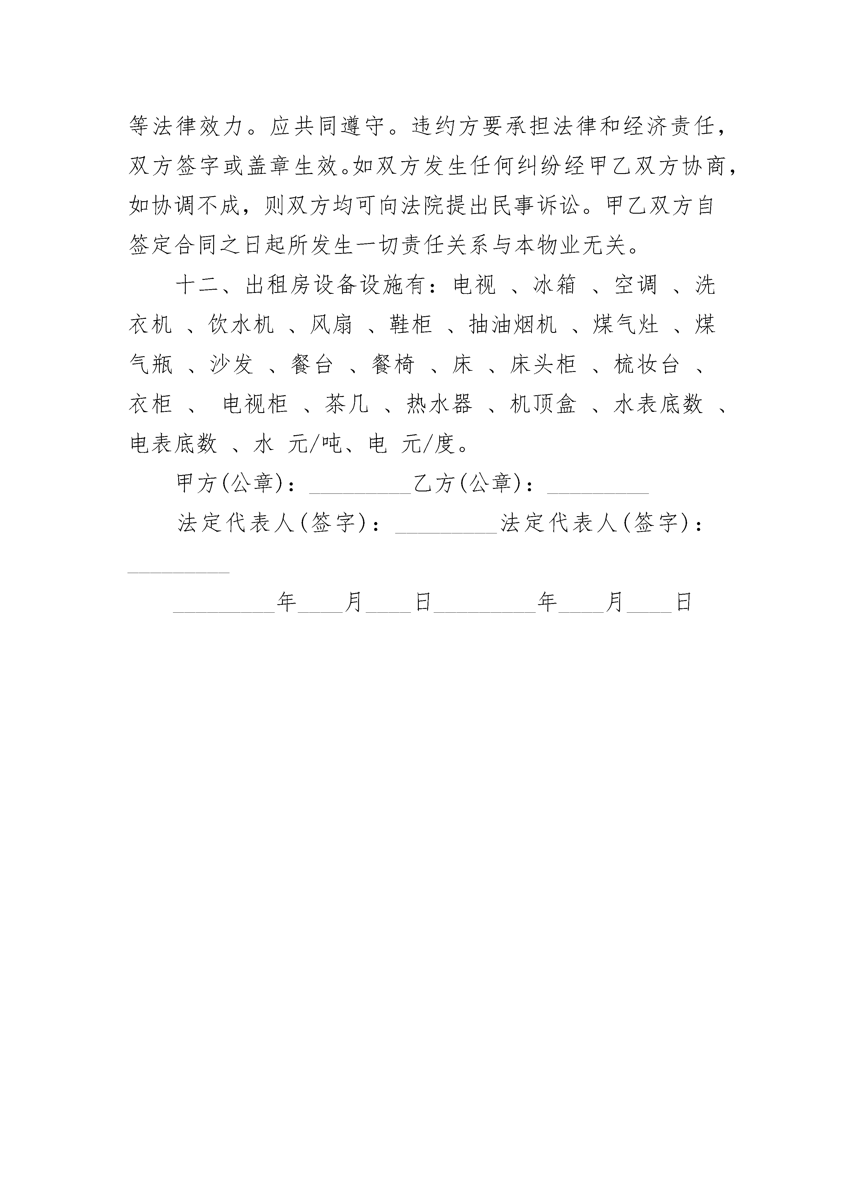 个人与企业房屋租赁合同甲方(出租方):__________________乙方(承租方):__________________根据甲、乙双方协商一致,乙方自愿租用甲方坐落于______路______号______幢______号住宅面积______平方米房屋。双方本着互惠互利的原则,达成如下租用协议:一、租赁期限及租金、费用1、租赁期限从_________年_____月____日至_________年_____月____日,计______年;租赁期限届满前一个月,乙方需继续租用,须书面向甲方提出申请,在同