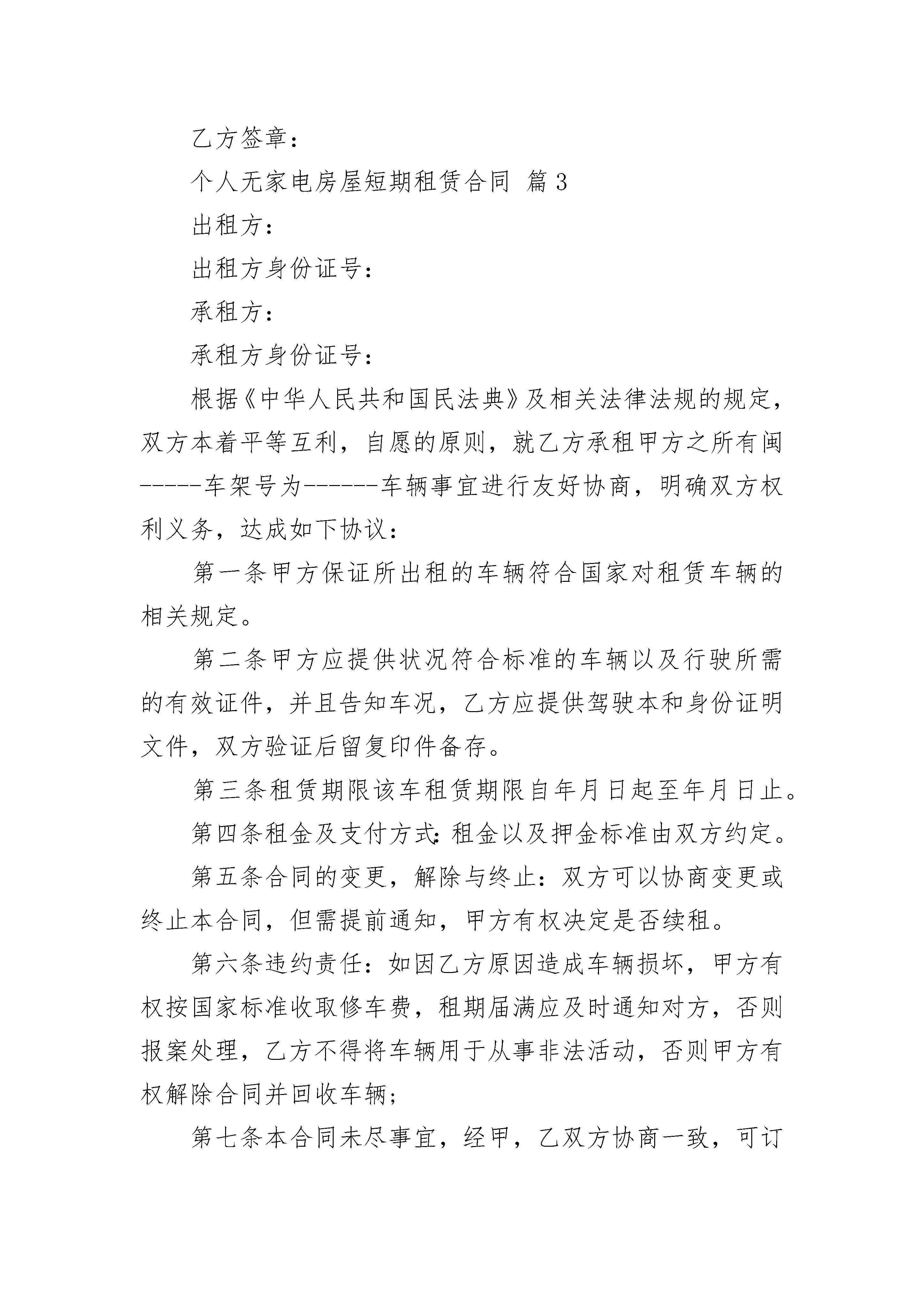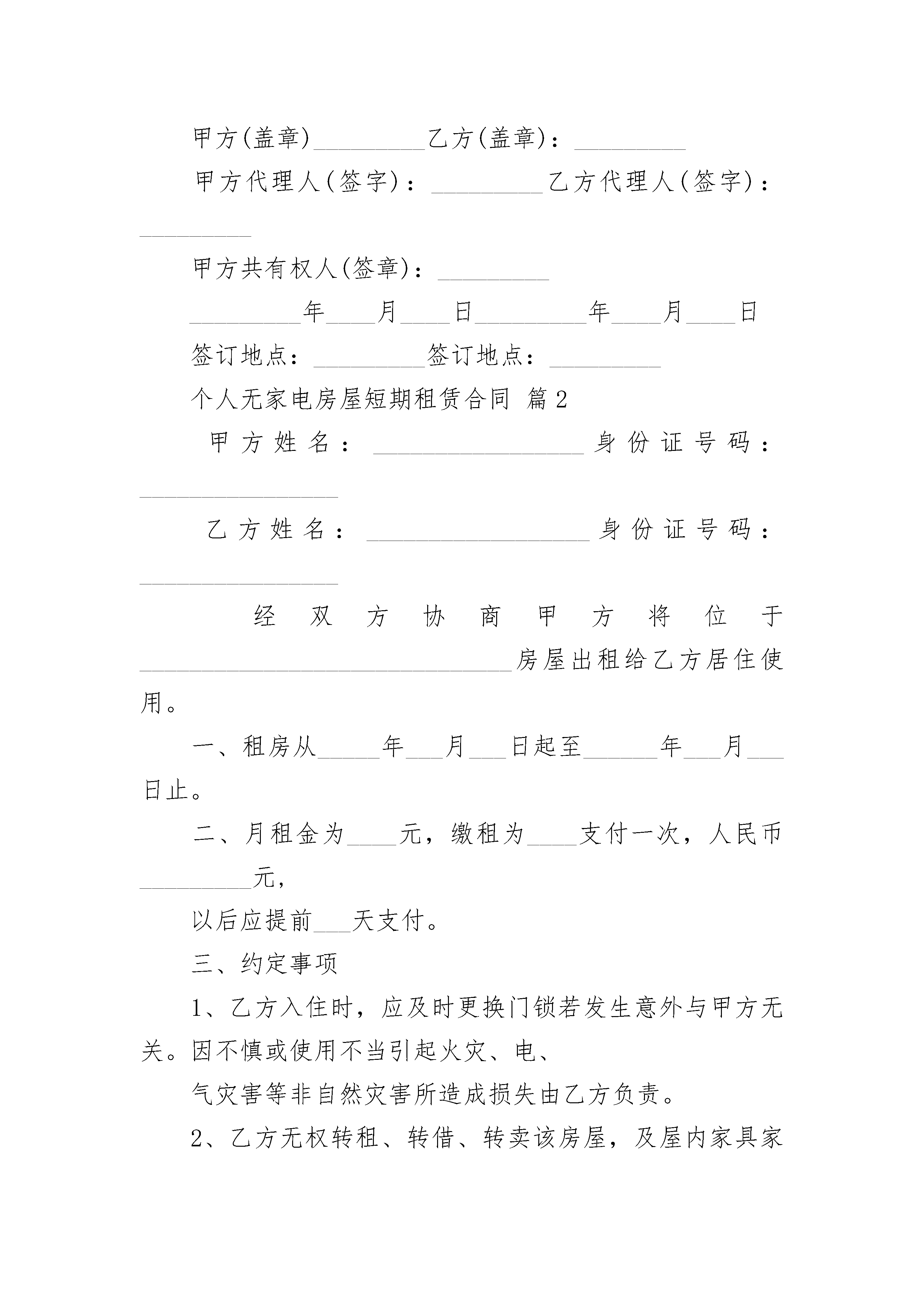 个人无家电房屋短期租赁合同个人无家电房屋短期租赁合同(通用24篇)个人无家电房屋短期租赁合同篇1卖方(以下简称甲方):_________地址:_________联系电话:_________委托人:_________地址:_________联系电话:_________买方(以下简称乙方):_________地址:_________联系电话:_________委托代理人:_________地址:_________联系电话:_________委托代理机构:_________经办人:_________联系电话