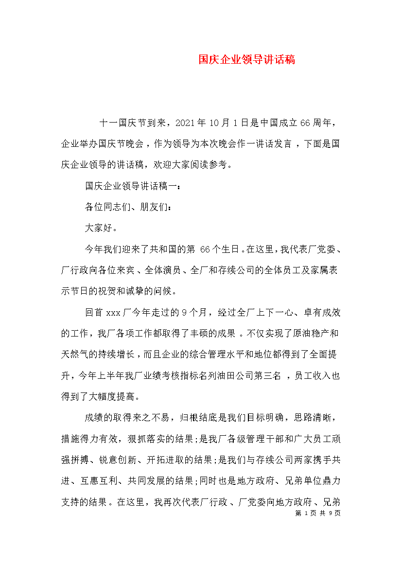 第PAGE\*Arabic\*MERGEFORMAT10页共NUMPAGES\*MERGEFORMAT10页国庆企业领导讲话稿十一国庆节到来,2015年10月1日是中国成立66周年,企业举办国庆节晚会,作为领导为本次晚会作一讲话发言,下面是国庆企业领导的讲话稿,欢迎大家阅读参考。国庆企业领导讲话稿一:各位同志们、朋友们:大家好。今年我们迎来了共和国的第66个生日。在这里,我代表厂党委、厂行政向各位来宾、全体演员、全厂和存续公司的全体员工及家属表示节日的祝贺和诚挚的问候。回首xxx厂今年走过的9