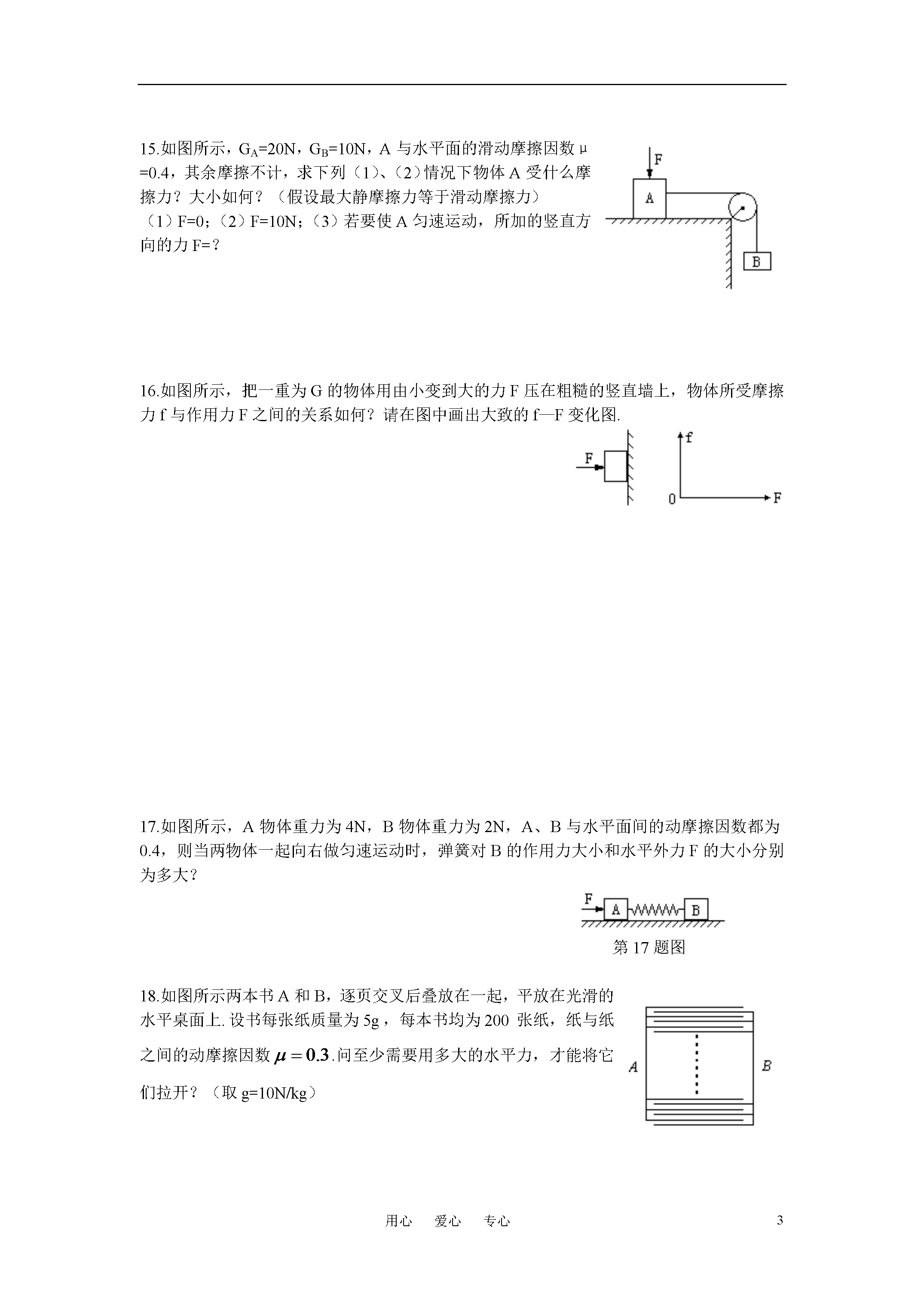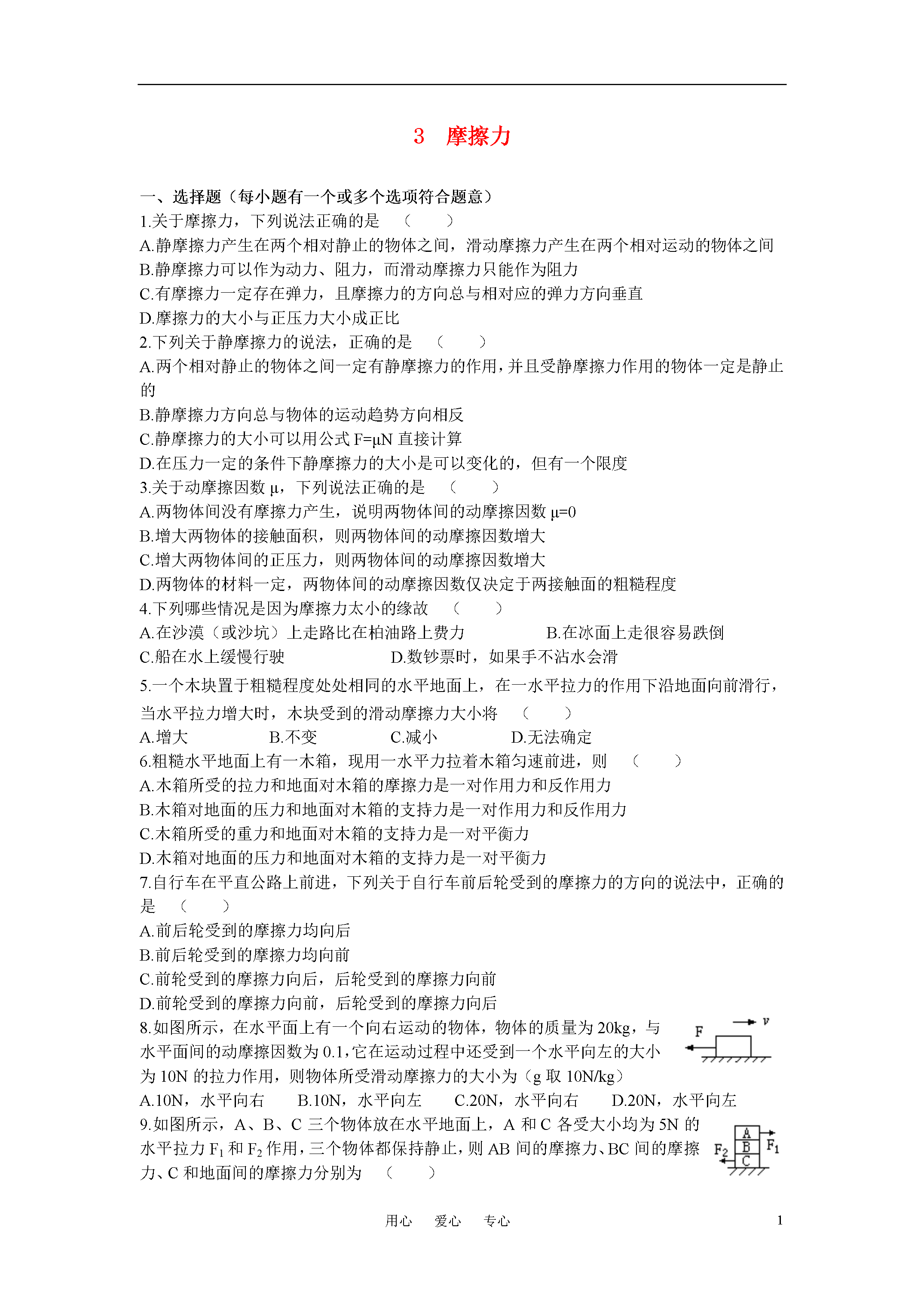 3用心爱心专心3摩擦力一、选择题(每小题有一个或多个选项符合题意)1.关于摩擦力,下列说法正确的是()A.静摩擦力产生在两个相对静止的物体之间,滑动摩擦力产生在两个相对运动的物体之间B.静摩擦力可以作为动力、阻力,而滑动摩擦力只能作为阻力C.有摩擦力一定存在弹力,且摩擦力的方向总与相对应的弹力方向垂直D.摩擦力的大小与正压力大小成正比2.下列关于静摩擦力的说法,正确的是()A.两个相对静止的物体之间一定有静摩擦力的作用,并且受静摩擦力作用的物体一定是静止的B.静摩擦力方向总与物体的运动趋势方向相反C.静摩